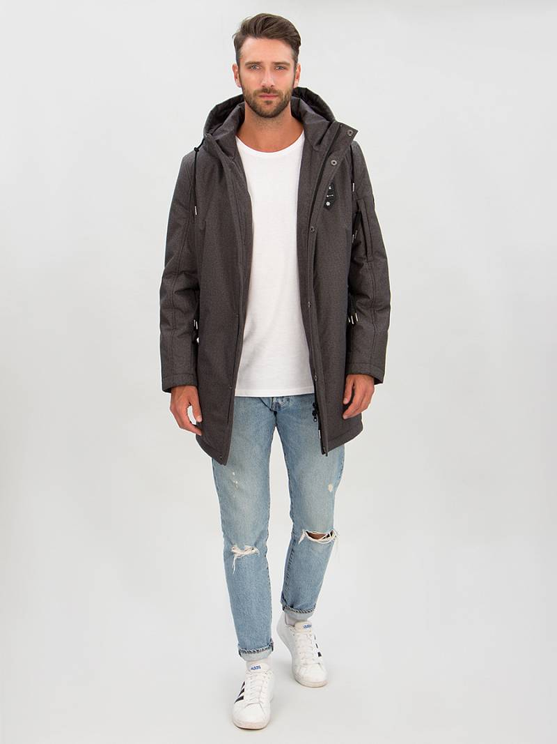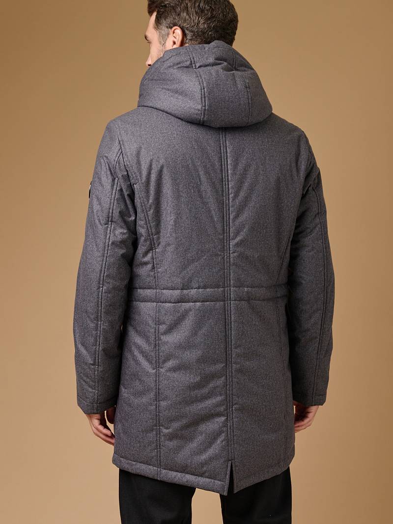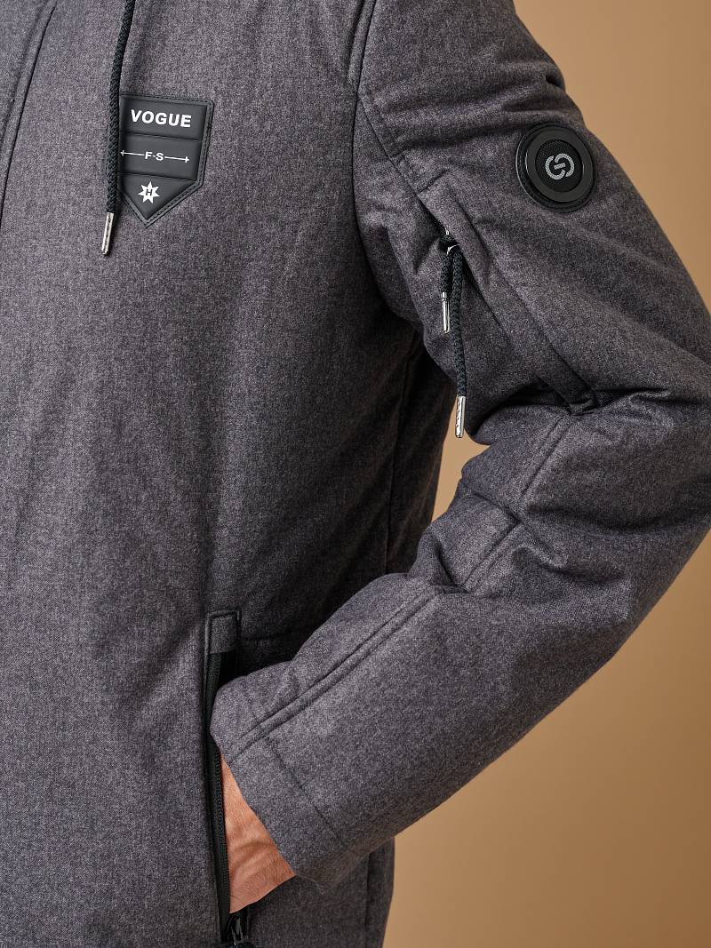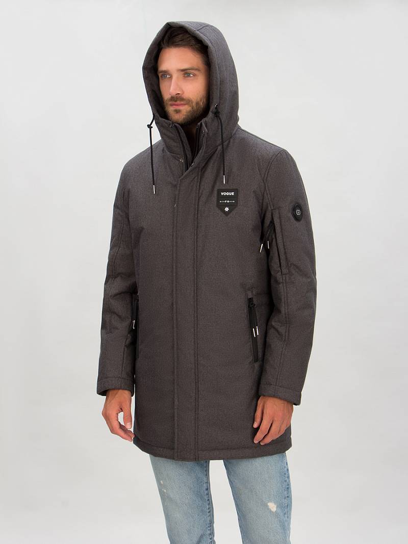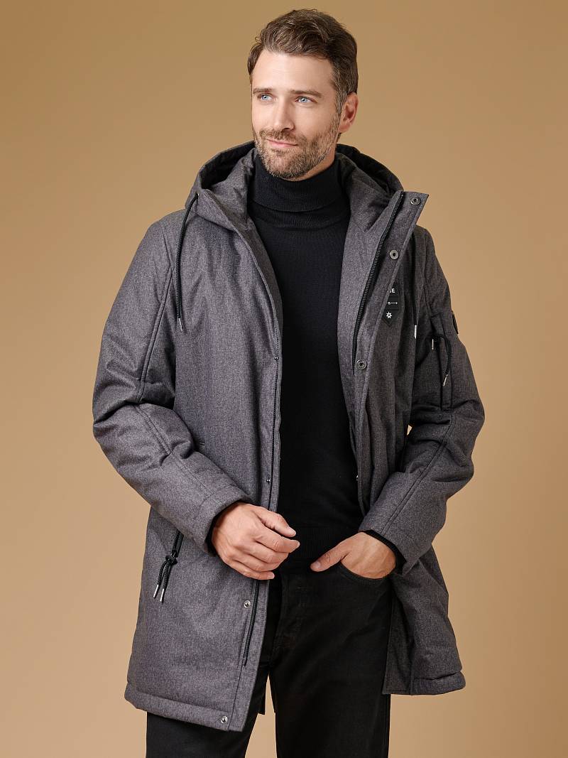 Куртка мужская утепленная, центральная застёжка молния закрытая планкой на кнопках, воротник стойка переходящая в капюшон, карманы "в рамку" на молнии. Рукав втачной, двухшовный, в нижней части рукава ветрозащитный трикотажный манжет. На левом рукаве дополнительный карман на молнии. Спика со средним швом и отрезными боковыми частями, в области талии потайная кулиска на резинке регулирующая объем талии. На подкладке два внутренних кармана на молнии. Длина куртки по спинке в 176 росте - 94см. Ткань верха: 100%полиэстер. Подкладка: 100%полиэстер. Утеплитель: термофин 200 гр.