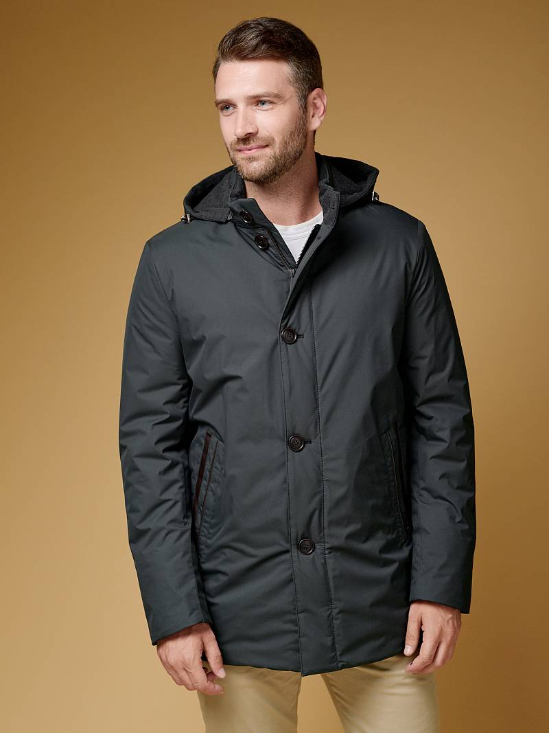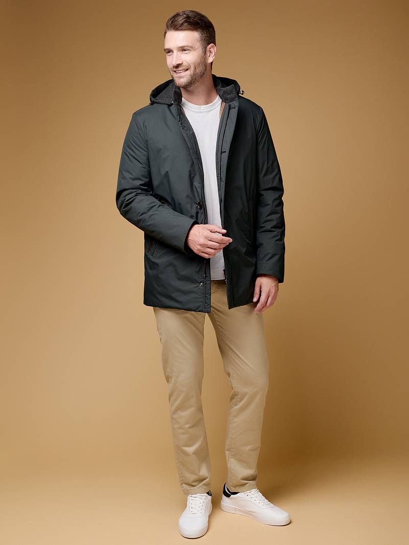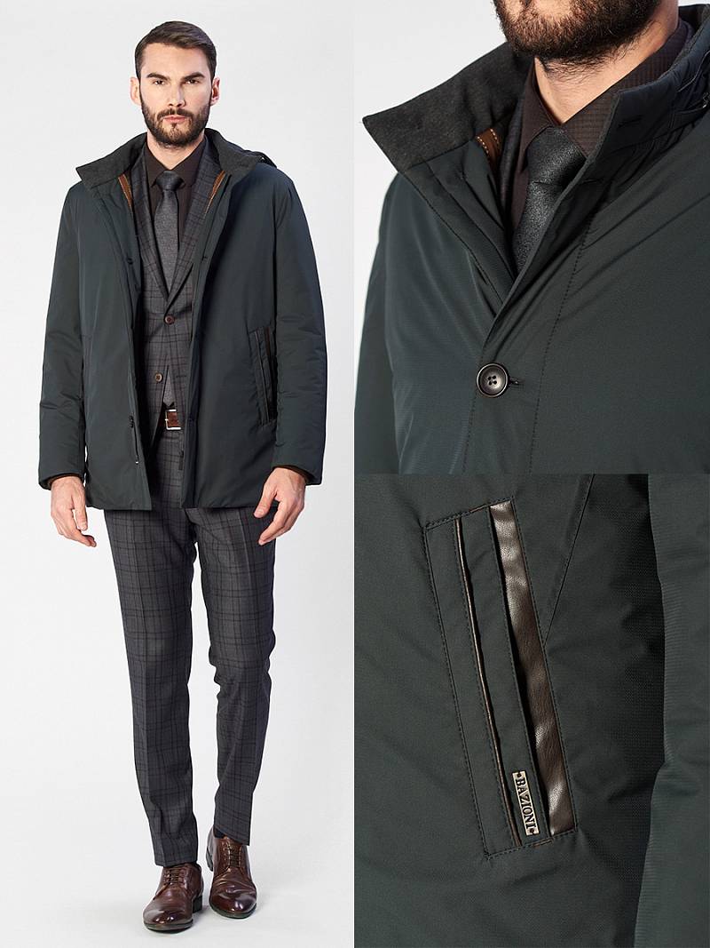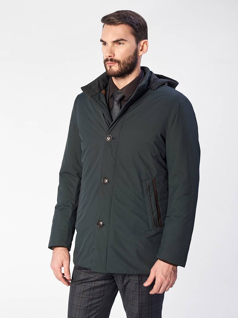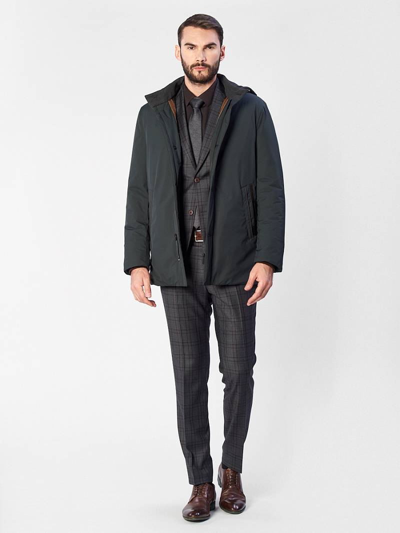 Куртка мужская утепленная. Центральная застежка на молнию и пуговицы. Воротник-стойка с отстегивающимся капюшоном. Боковые карманы двойные- прорезные с листочкой и на магнитах. Рукав втачной двухшовный. В нижней части рукава трикотажный ветрозащитный манжет. На спинке плечевой пояс украшен отрезной фигурной кокеткой. На подкладке два внутренних кармана на молнии. Длина изделия по спинке для роста 176 - 80см. Ткань верха: 100%полиэстер. Подкладка: 100%полиэстер. Утеплитель: термоплюс 150гр