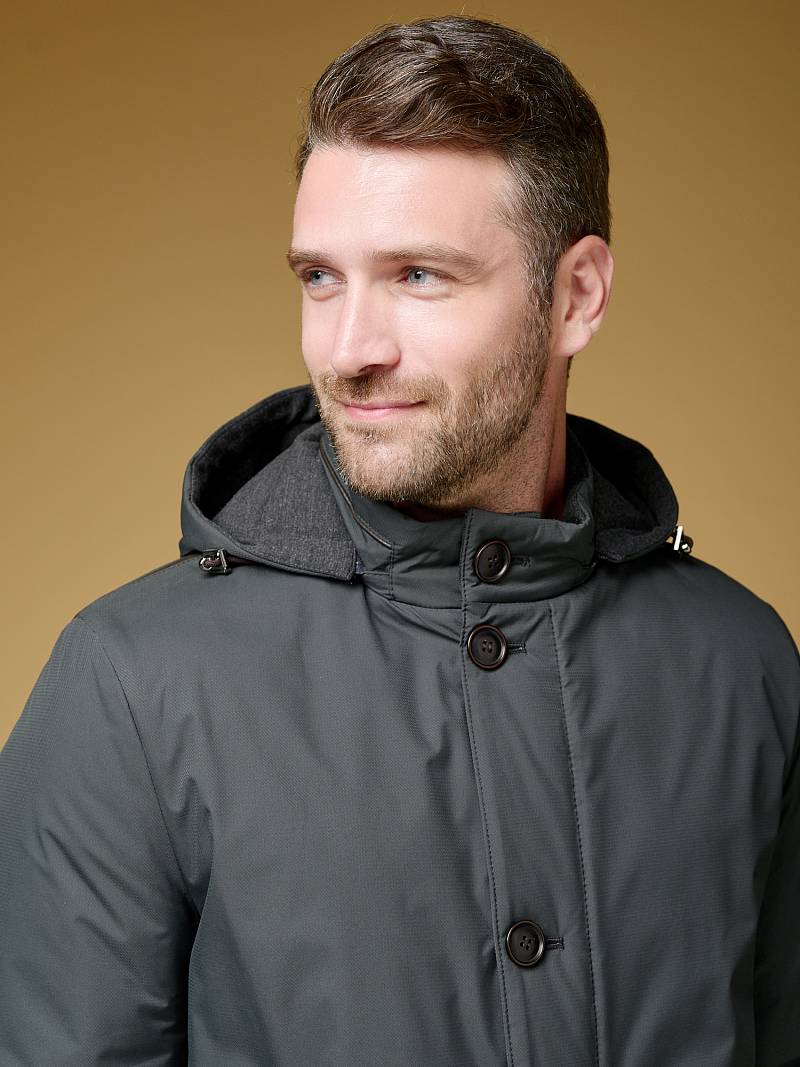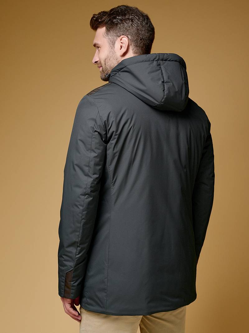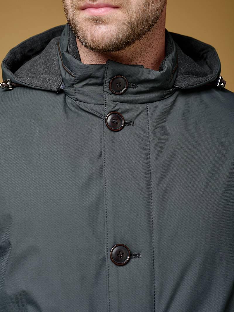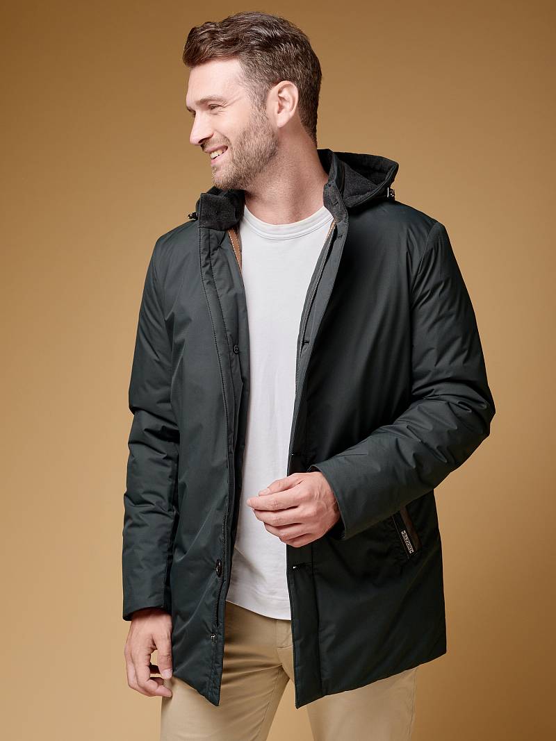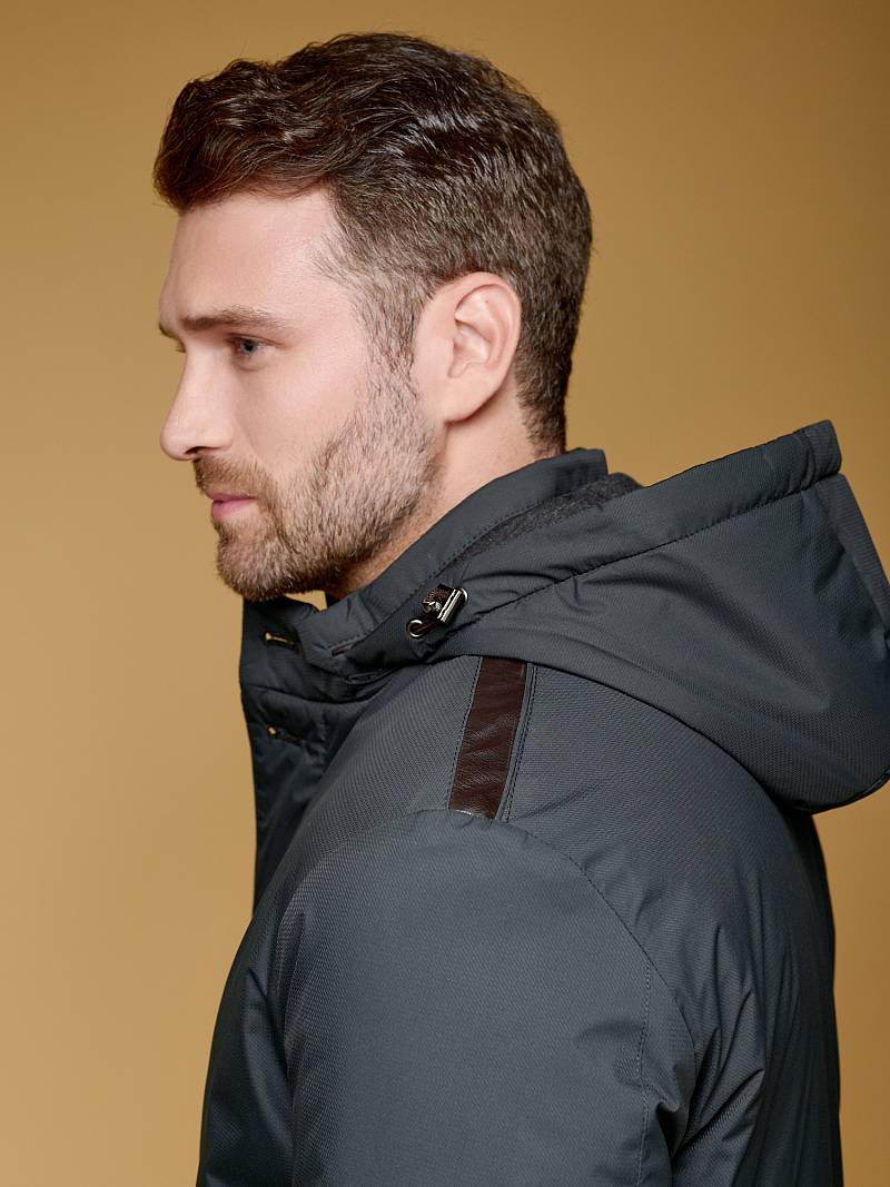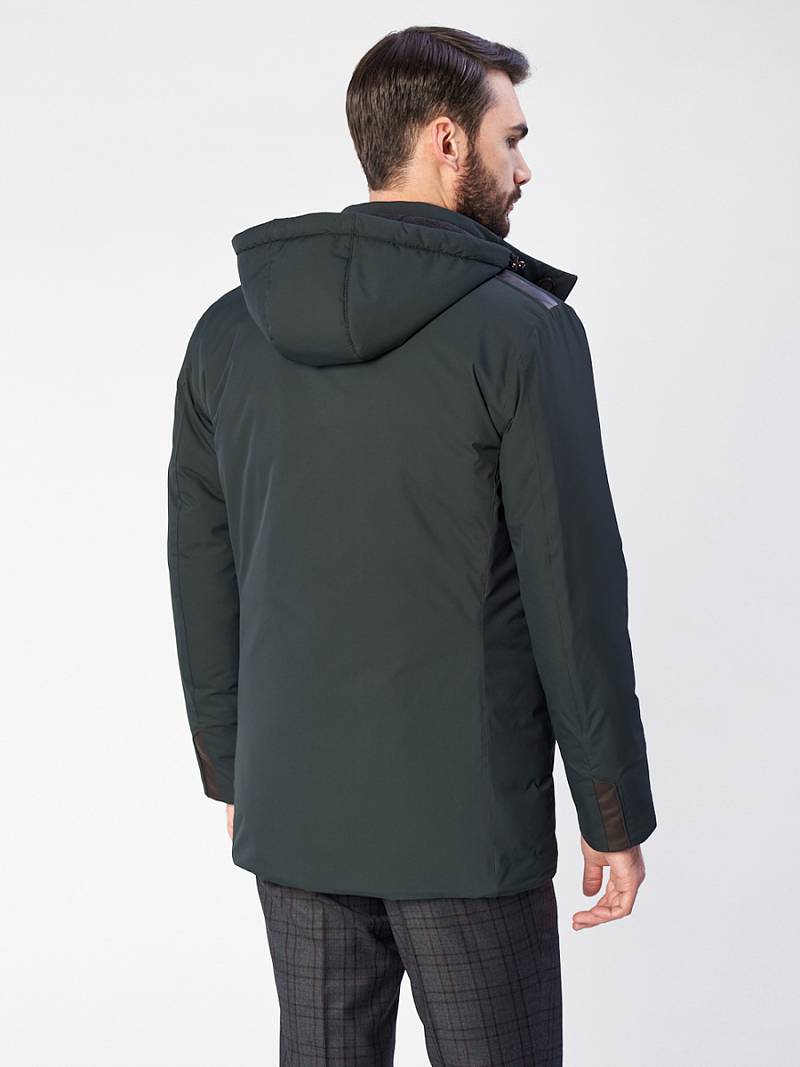 Куртка мужская утепленная. Центральная застежка на молнию и пуговицы. Воротник-стойка с отстегивающимся капюшоном. Боковые карманы двойные- прорезные с листочкой и на магнитах. Рукав втачной двухшовный. В нижней части рукава трикотажный ветрозащитный манжет. На спинке плечевой пояс украшен отрезной фигурной кокеткой. На подкладке два внутренних кармана на молнии. Длина изделия по спинке для роста 176 - 80см. Ткань верха: 100%полиэстер. Подкладка: 100%полиэстер. Утеплитель: термоплюс 150гр