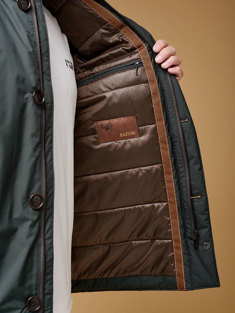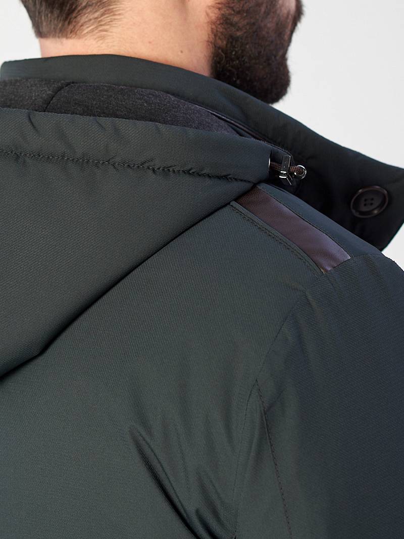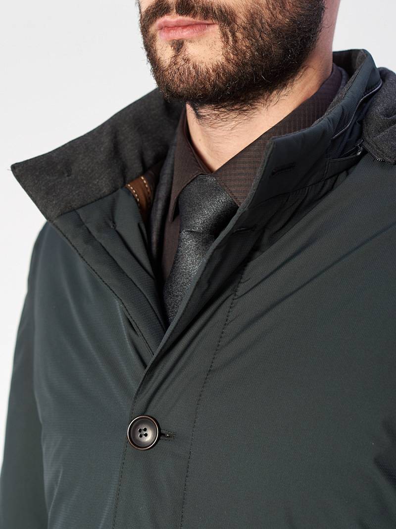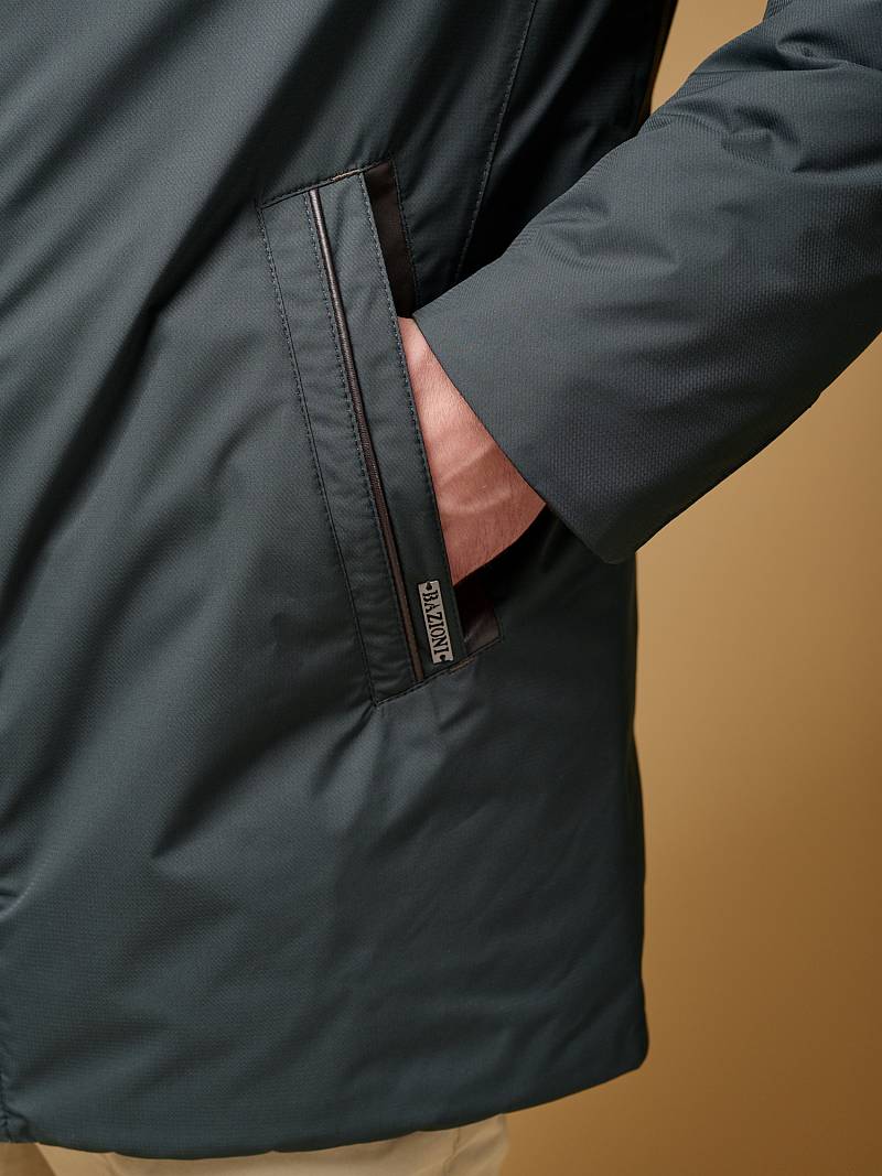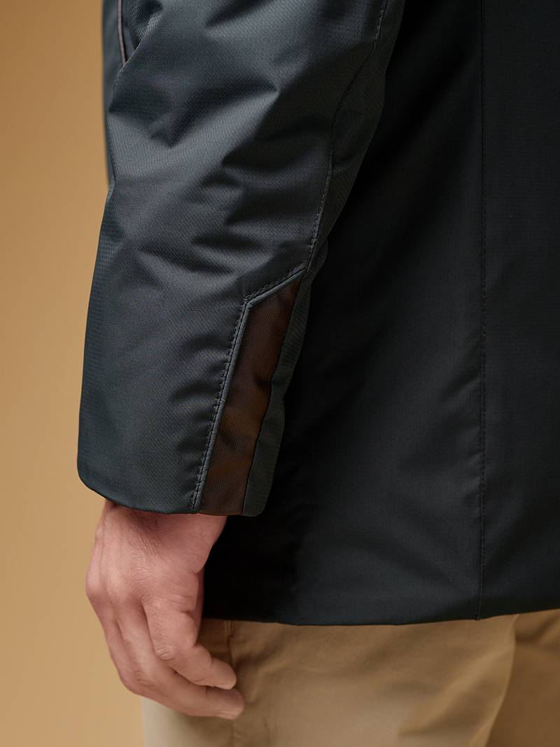 Куртка мужская утепленная. Центральная застежка на молнию и пуговицы. Воротник-стойка с отстегивающимся капюшоном. Боковые карманы двойные- прорезные с листочкой и на магнитах. Рукав втачной двухшовный. В нижней части рукава трикотажный ветрозащитный манжет. На спинке плечевой пояс украшен отрезной фигурной кокеткой. На подкладке два внутренних кармана на молнии. Длина изделия по спинке для роста 176 - 80см. Ткань верха: 100%полиэстер. Подкладка: 100%полиэстер. Утеплитель: термоплюс 150гр