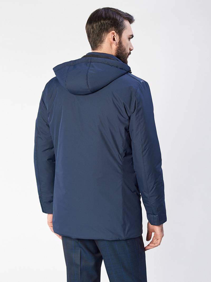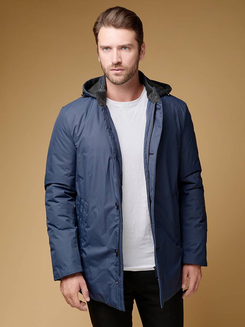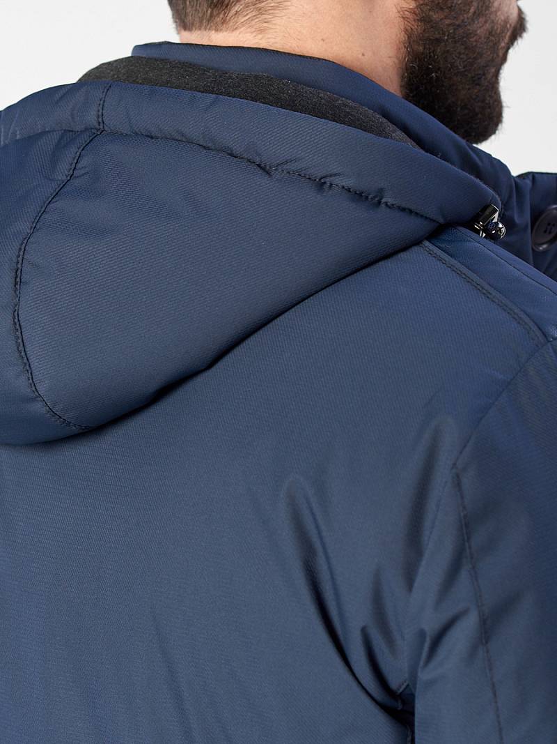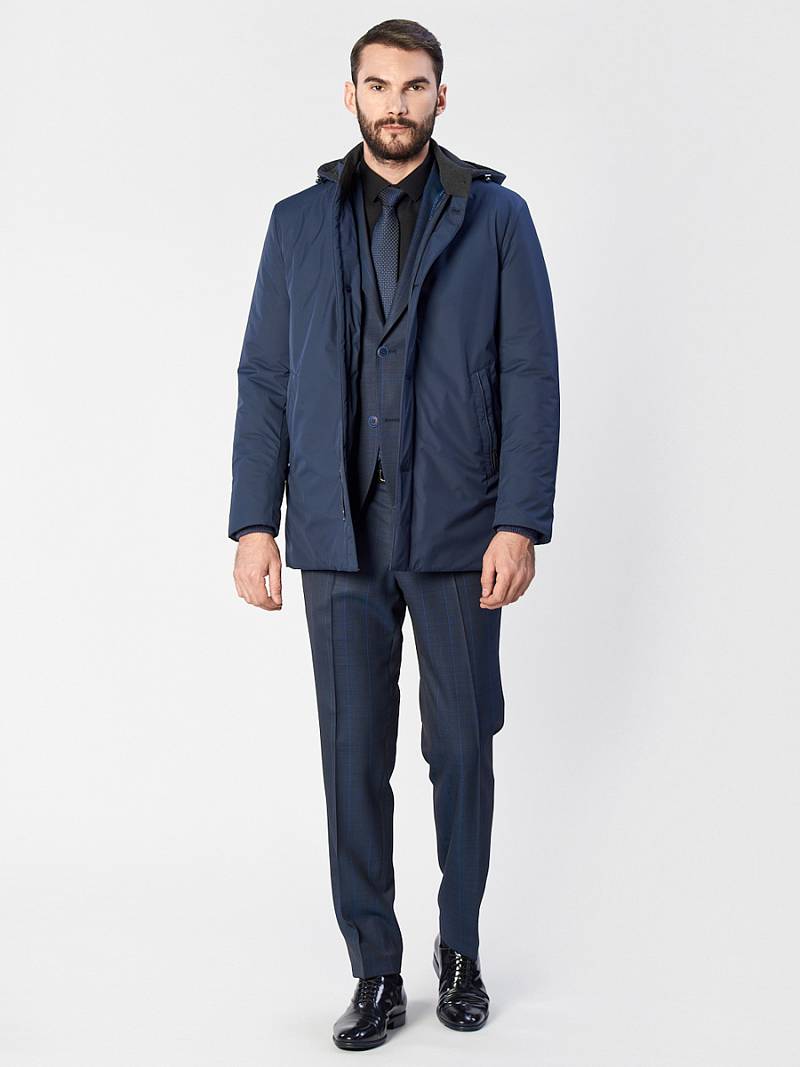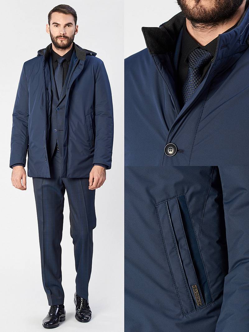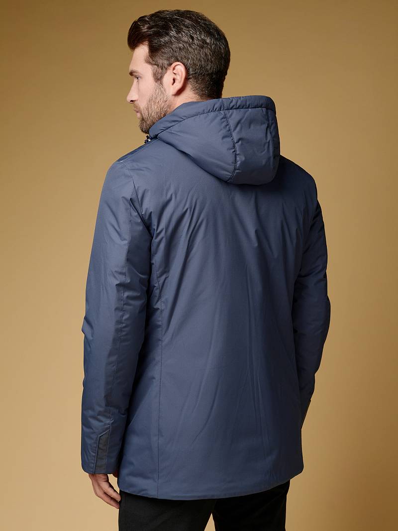 Куртка мужская утепленная. Центральная застежка на молнию и пуговицы. Воротник-стойка с отстегивающимся капюшоном. Боковые карманы двойные- прорезные с листочкой и на магнитах. Рукав втачной двухшовный. В нижней части рукава трикотажный ветрозащитный манжет. На спинке плечевой пояс украшен отрезной фигурной кокеткой. На подкладке два внутренних кармана на молнии. Длина изделия по спинке для роста 176 - 80см. Ткань верха: 100%полиэстер. Подкладка: 100%полиэстер. Утеплитель: термоплюс 150гр