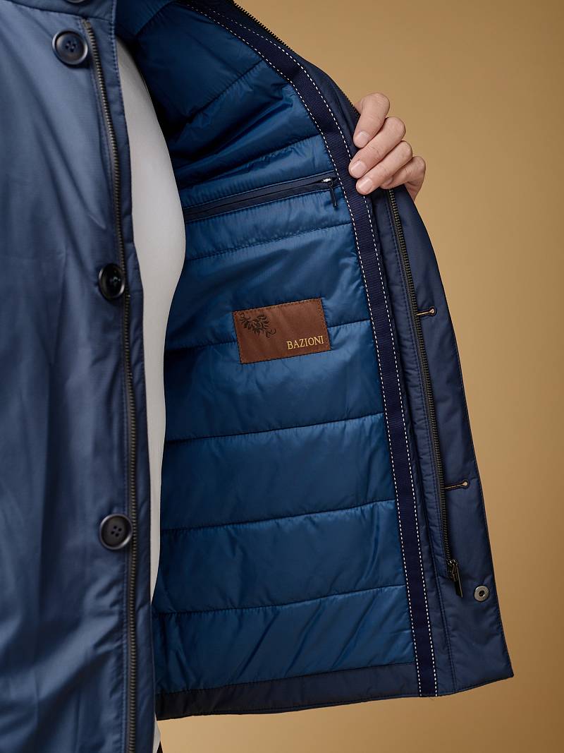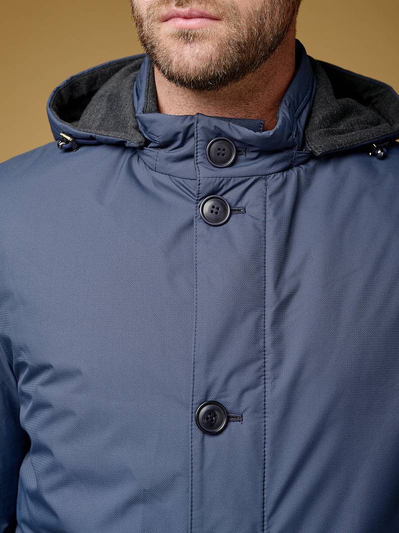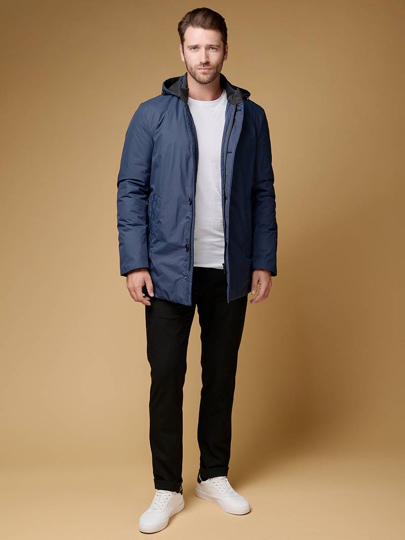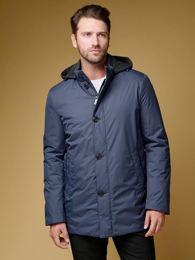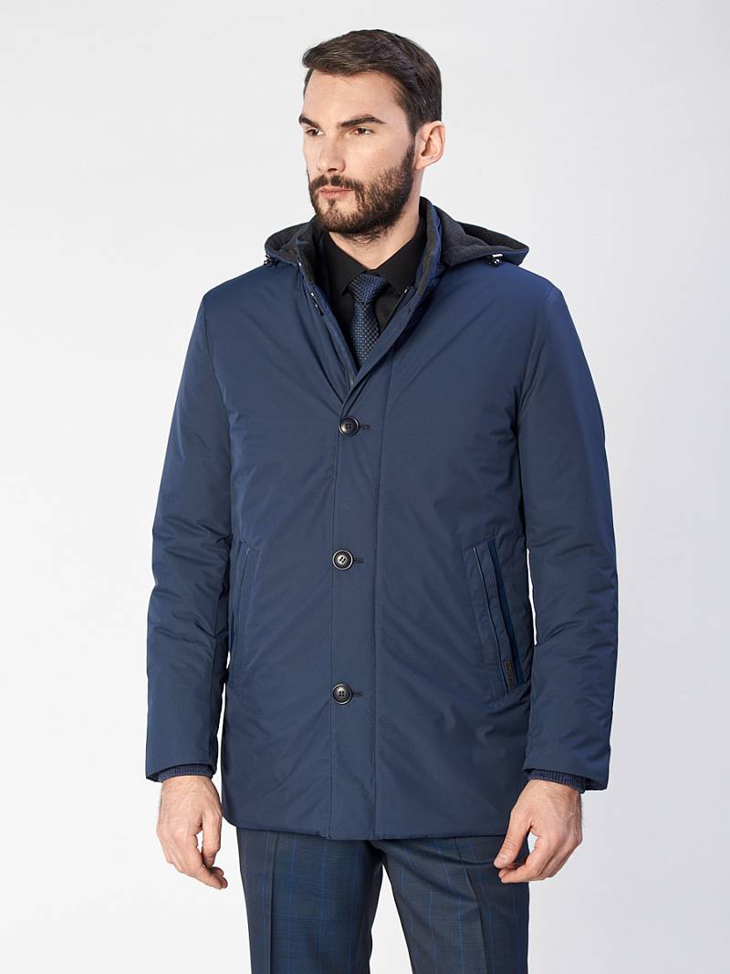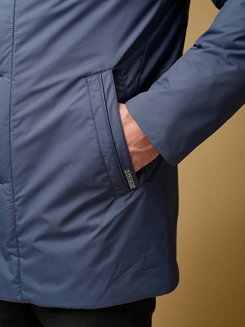 Куртка мужская утепленная. Центральная застежка на молнию и пуговицы. Воротник-стойка с отстегивающимся капюшоном. Боковые карманы двойные- прорезные с листочкой и на магнитах. Рукав втачной двухшовный. В нижней части рукава трикотажный ветрозащитный манжет. На спинке плечевой пояс украшен отрезной фигурной кокеткой. На подкладке два внутренних кармана на молнии. Длина изделия по спинке для роста 176 - 80см. Ткань верха: 100%полиэстер. Подкладка: 100%полиэстер. Утеплитель: термоплюс 150гр