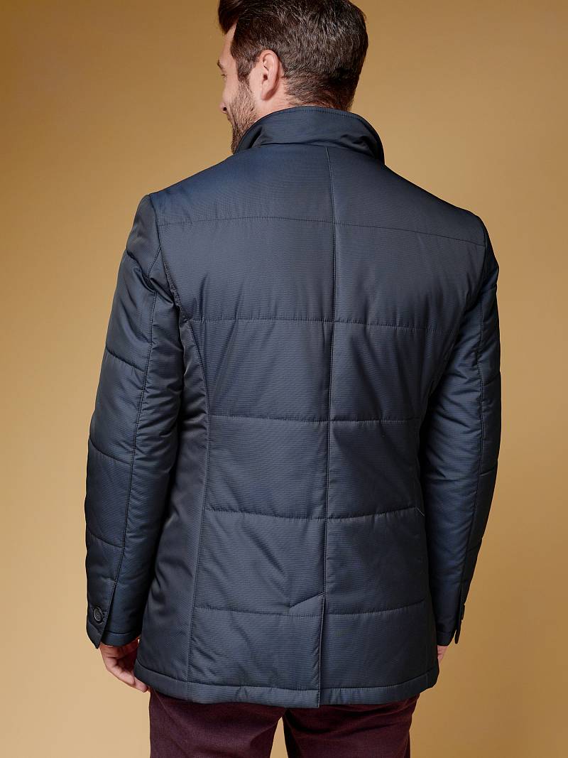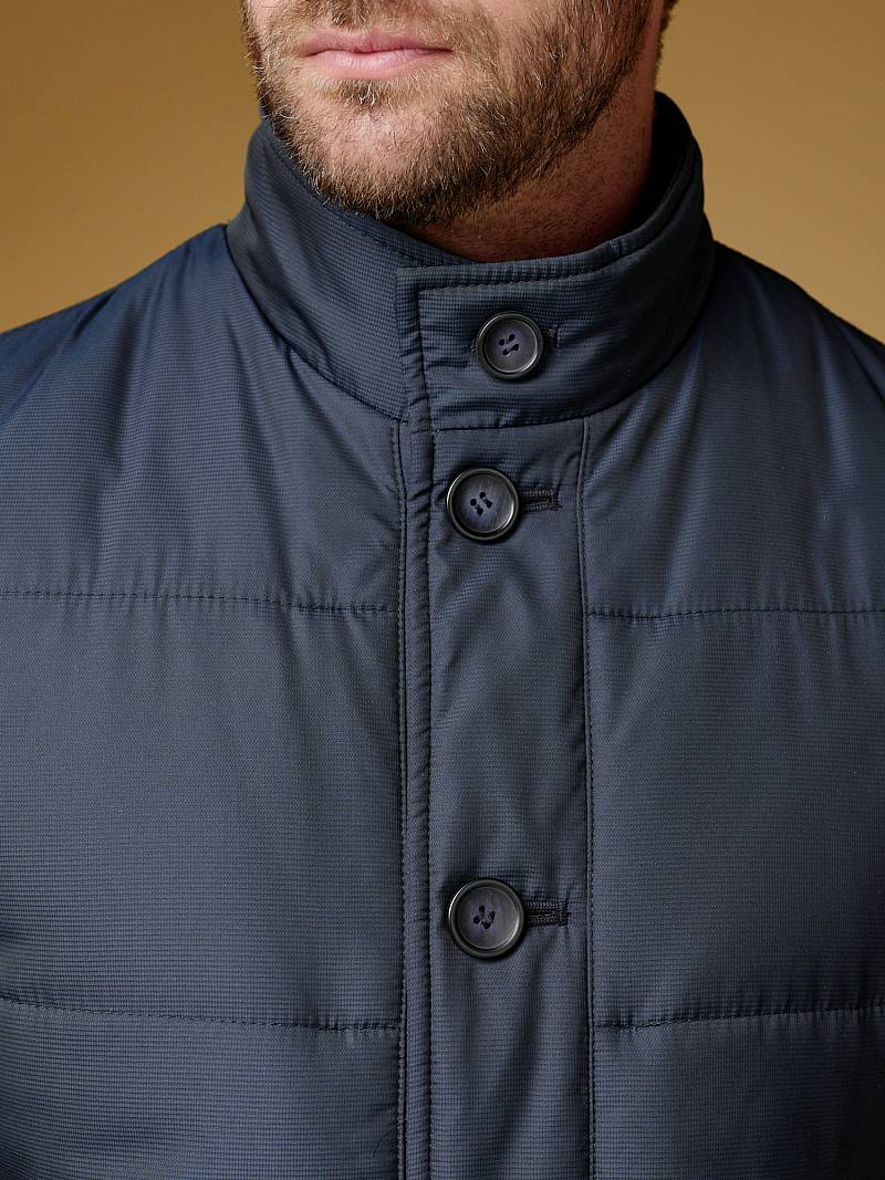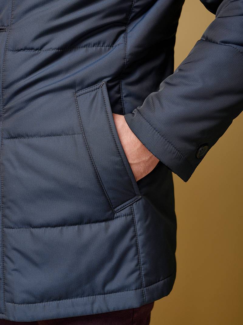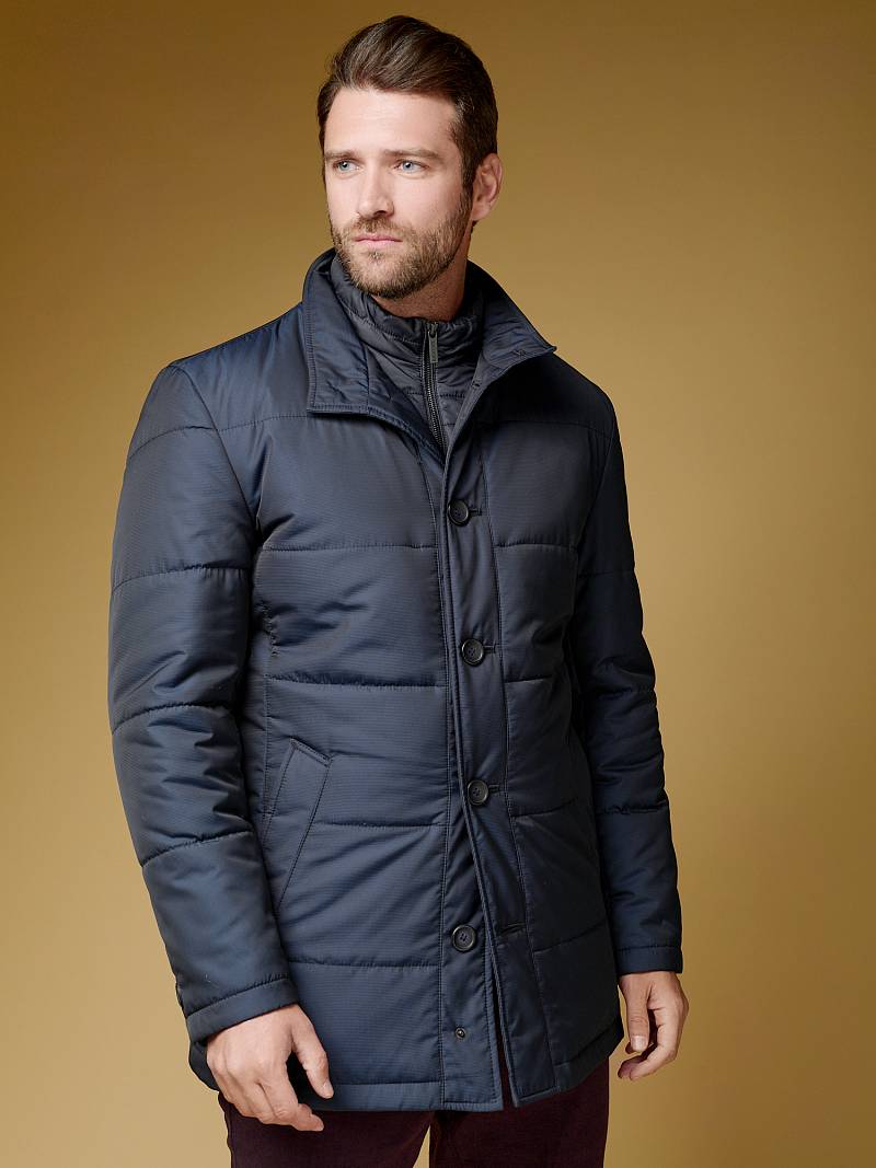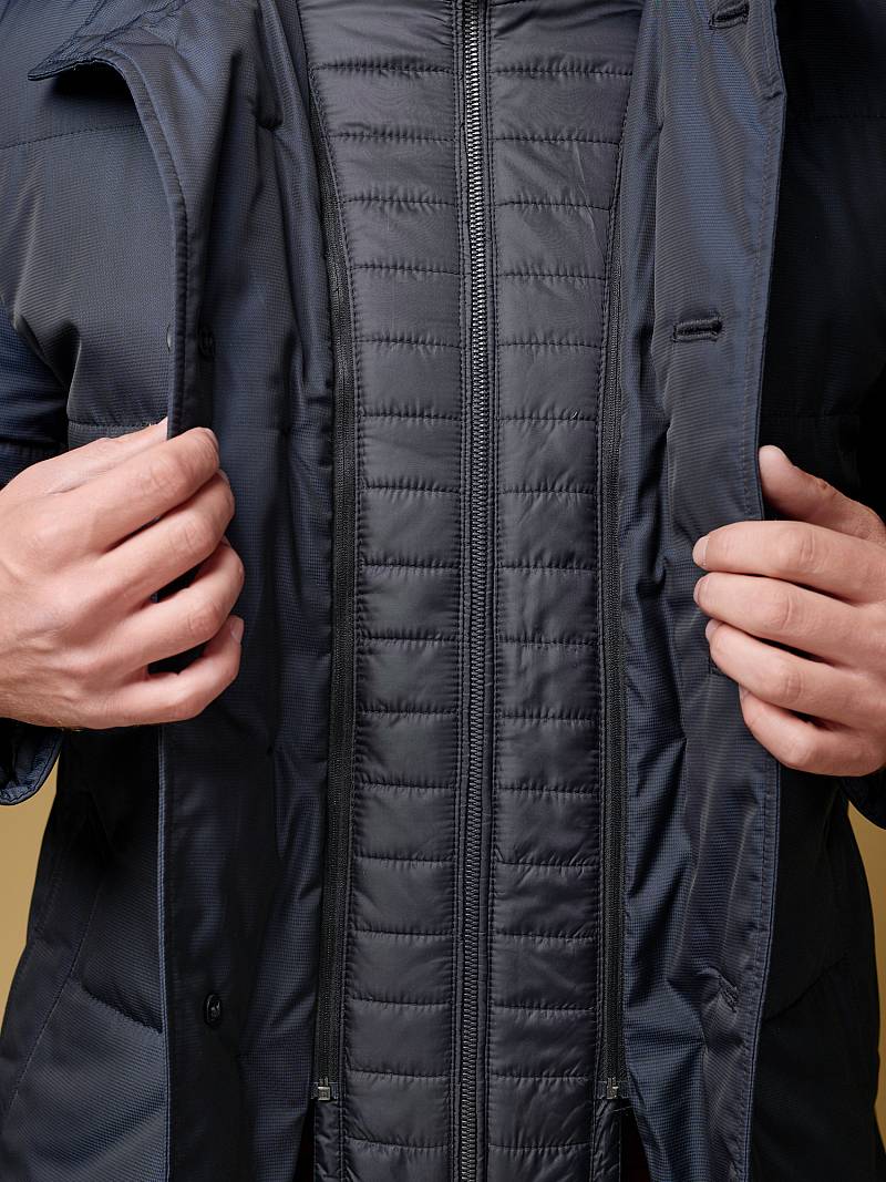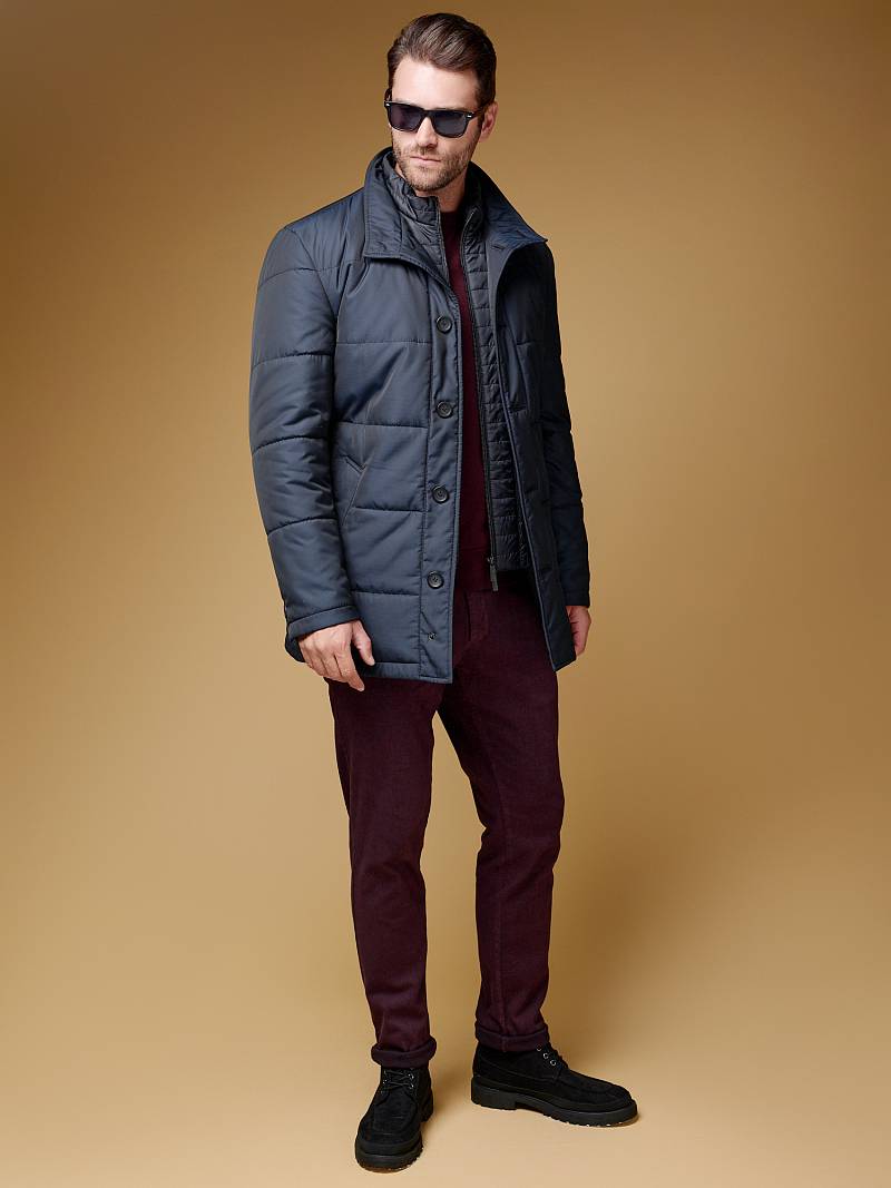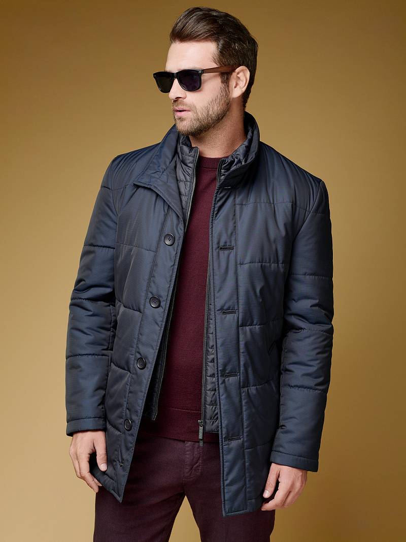Куртка мужская утепленная с отстегивающийся манишкой на молнию. Застежка куртки на 6 пуговиц. Воротник - стойка. Полочки, спинка, рукава- простеганы горизонтальной стежкой. На полочках - два нижних боковых кармана с листочками. В нижней части среднего шва спинки- шлица на 2-х кнопках. Рукава втачные с локтевыми швами. На подкладке - два внутренних прорезных кармана на молниях. Длина по спинке для размера-роста 50/176 - 82см. Ткань верха: 100%полиэстер. Подкладка: 100%полиэстер. Утеплитель: термоплюс 200гр/160гр.