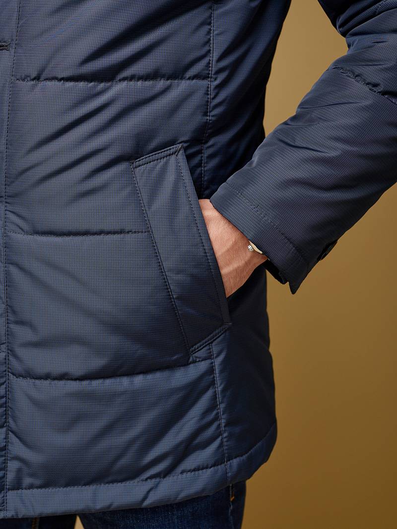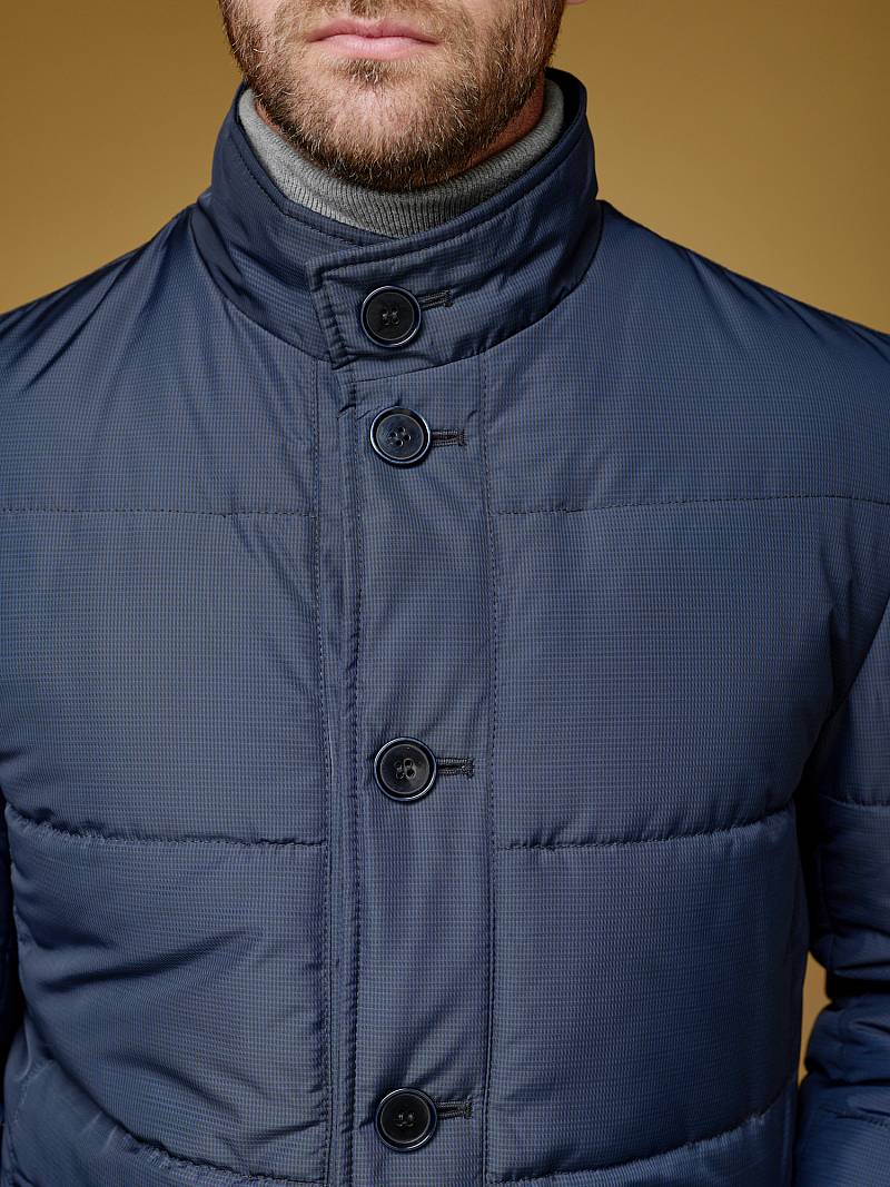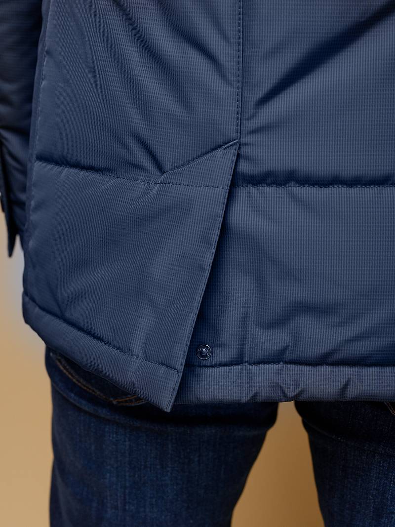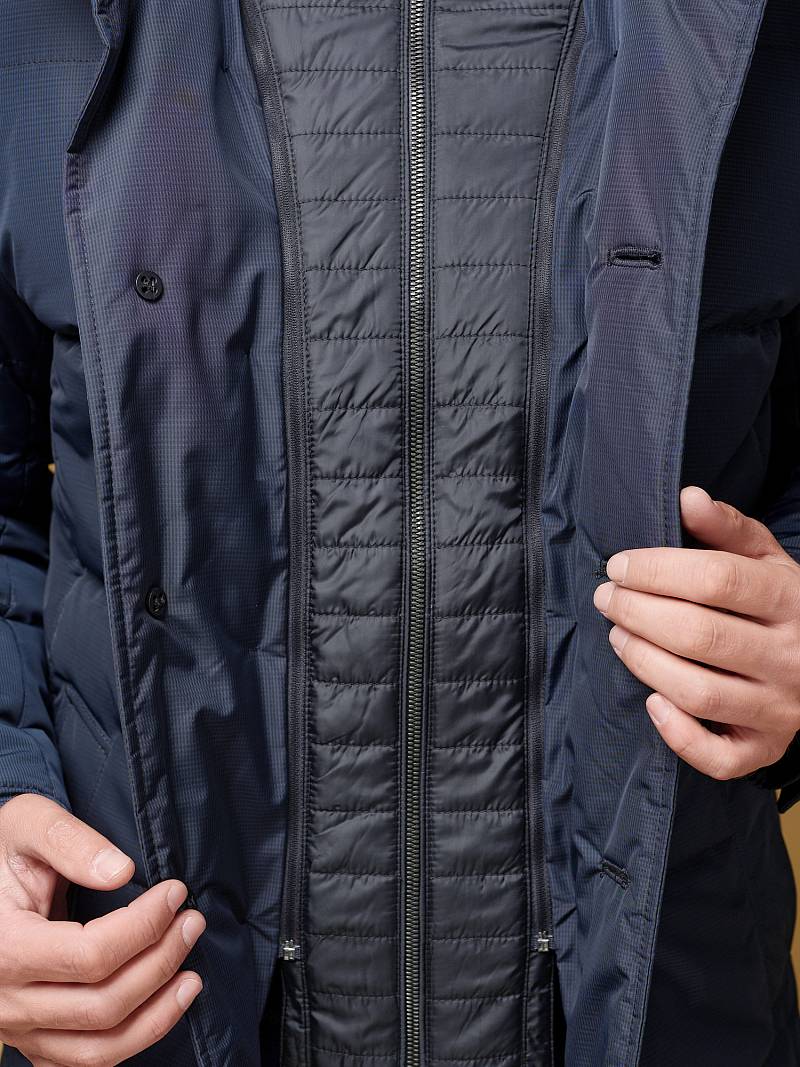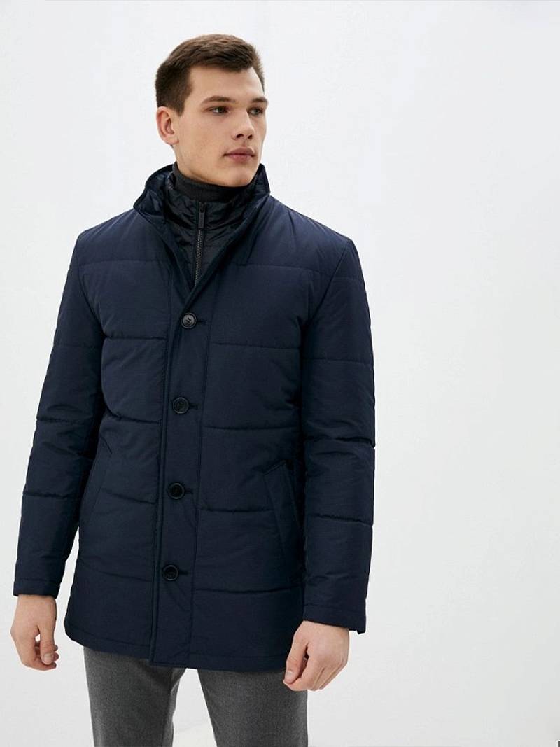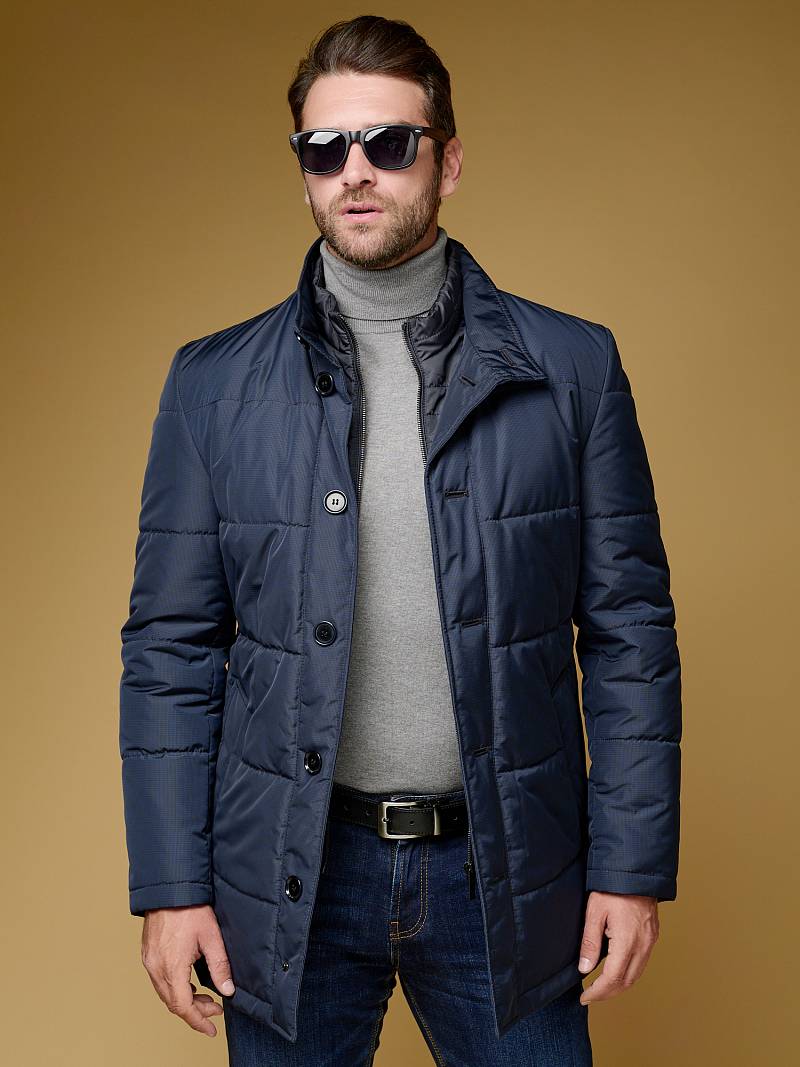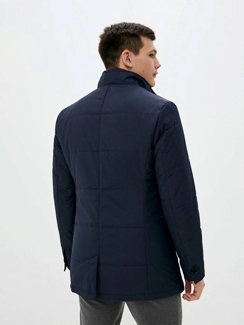 Куртка мужская утепленная с отстегивающийся манишкой на молнию. Застежка куртки на 6 пуговиц. Воротник - стойка. Полочки, спинка, рукава- простеганы горизонтальной стежкой. На полочках - два нижних боковых кармана с листочками. В нижней части среднего шва спинки- шлица на 2-х кнопках. Рукава втачные с локтевыми швами. На подкладке - два внутренних прорезных кармана на молниях. Длина по спинке для размера-роста 50/176 - 82см. Ткань верха: 100%полиэстер. Подкладка: 100%полиэстер. Утеплитель: термоплюс 200гр/160гр.