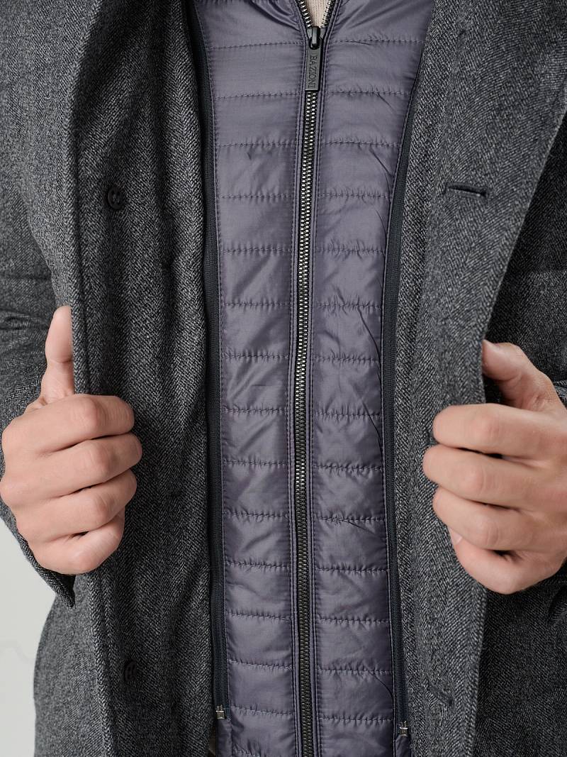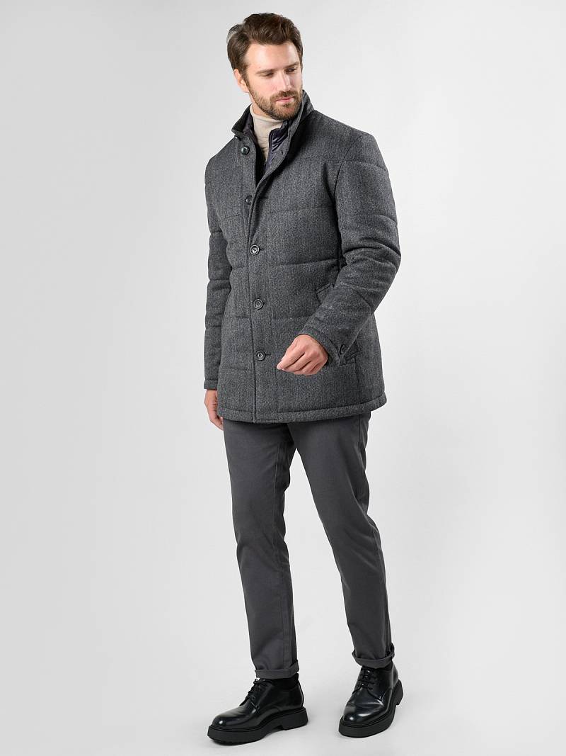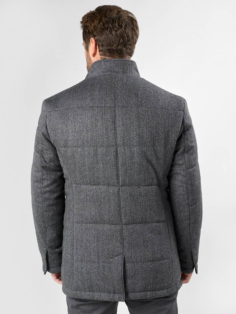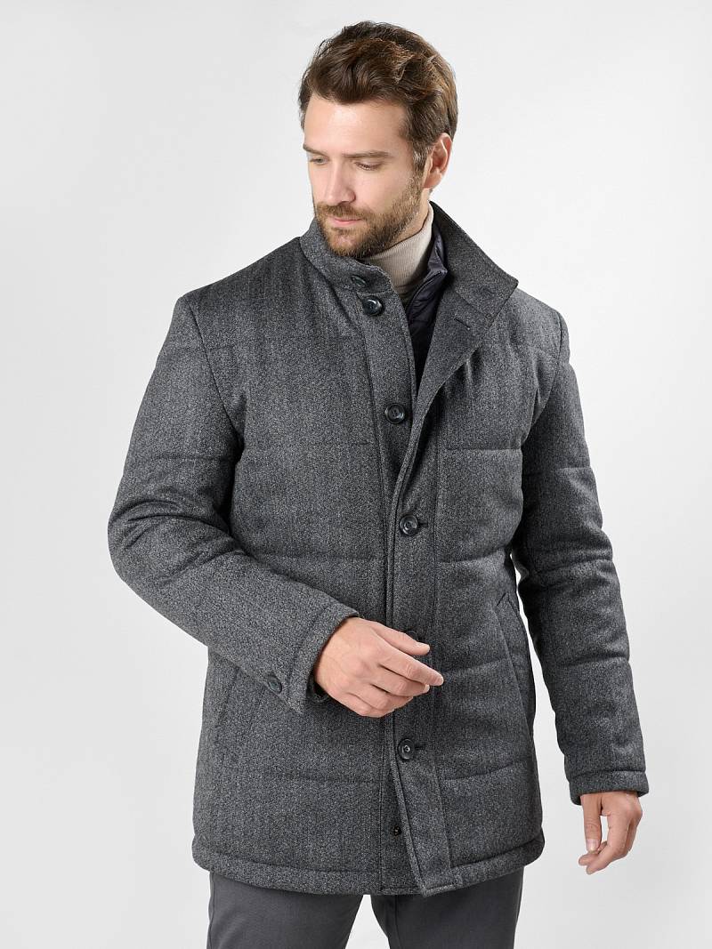 Куртка мужская утепленная с отстегивающийся манишкой на молнию. Застежка куртки на 6 пуговиц. Воротник - стойка. Полочки, спинка, рукава- простеганы горизонтальной стежкой. На полочках - два нижних боковых кармана с листочками. В нижней части среднего шва спинки- шлица на кнопке. Рукава втачные с локтевыми швами. На подкладке - два внутренних прорезных кармана на молниях. Длина по спинке для размера-роста 50/176 - 82см. Ткань верха: 100%шерсть. Подкладка: 100%полиэстер. Утеплитель: термоплюс 200гр/160гр.