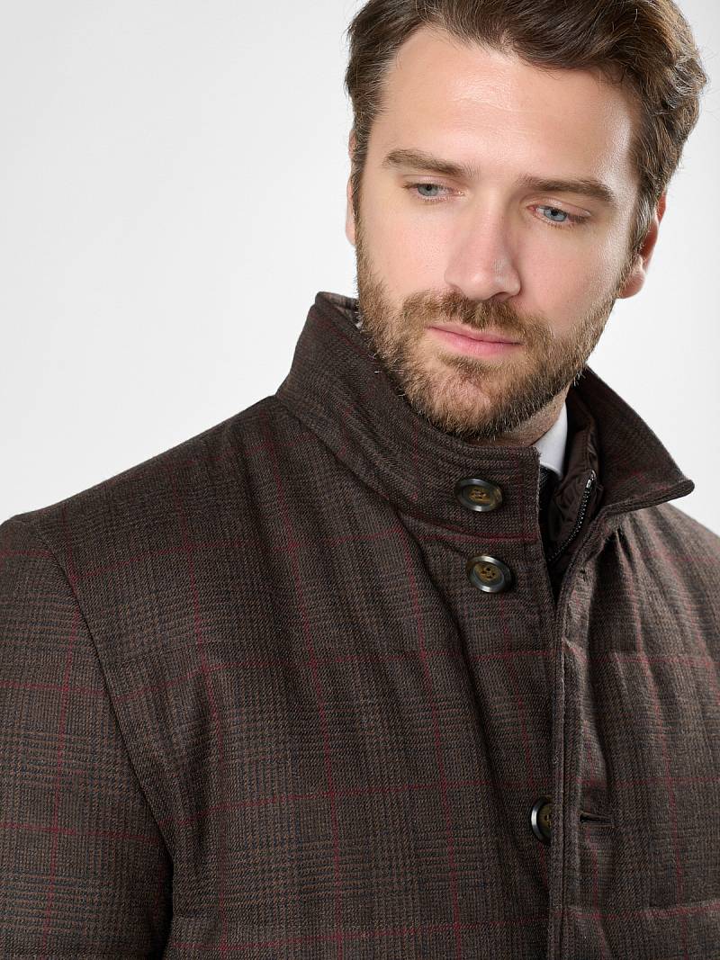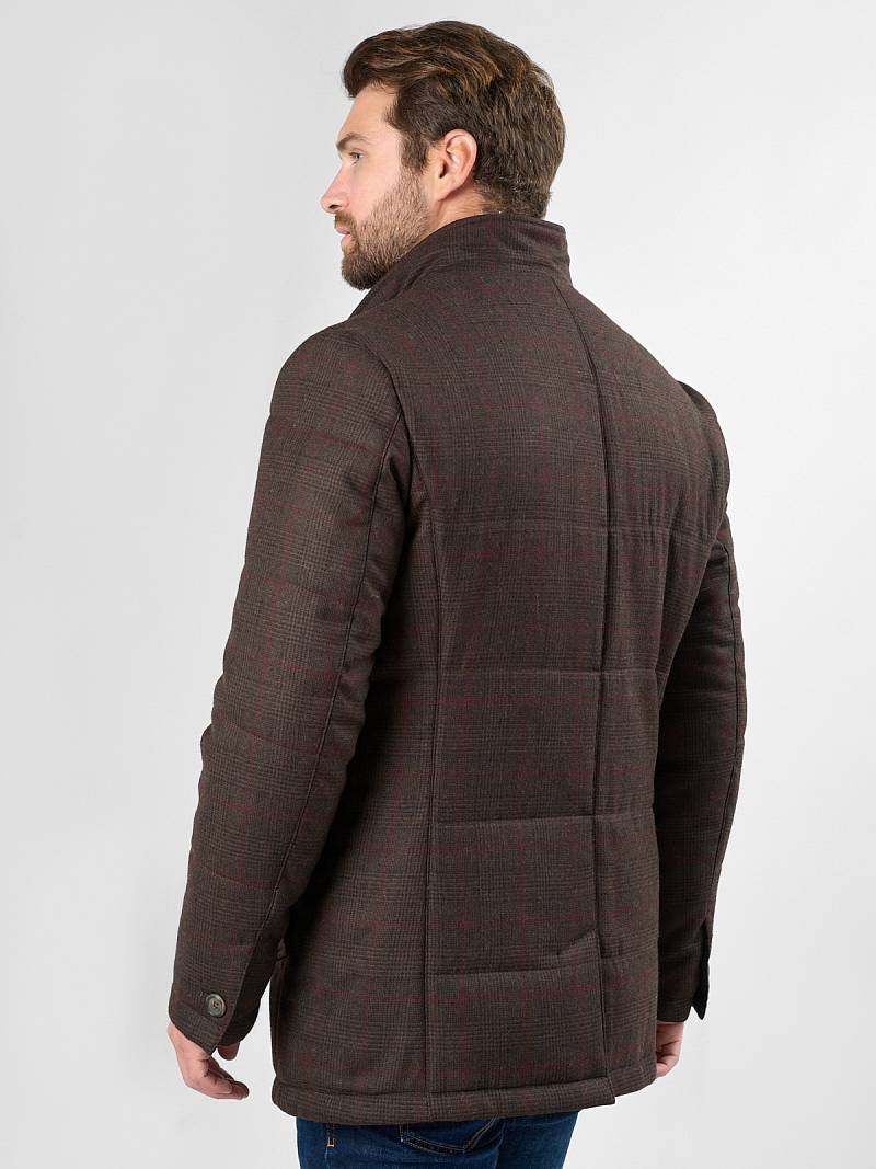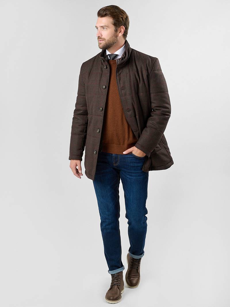 Куртка мужская утепленная с отстегивающийся манишкой на молнию. Застежка куртки на 6 пуговиц. Воротник - стойка. Полочки, спинка, рукава- простеганы горизонтальной стежкой. На полочках - два нижних боковых кармана с листочками. В нижней части среднего шва спинки- шлица на кнопке. Рукава втачные с локтевыми швами. На подкладке - два внутренних прорезных кармана на молниях. Длина по спинке для размера-роста 50/176 - 82см. Ткань верха: 100%шерсть. Подкладка: 100%полиэстер. Утеплитель: термоплюс 200гр/160гр.