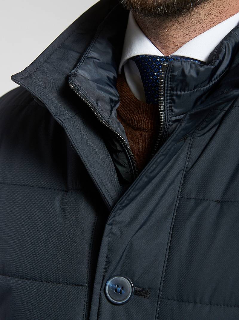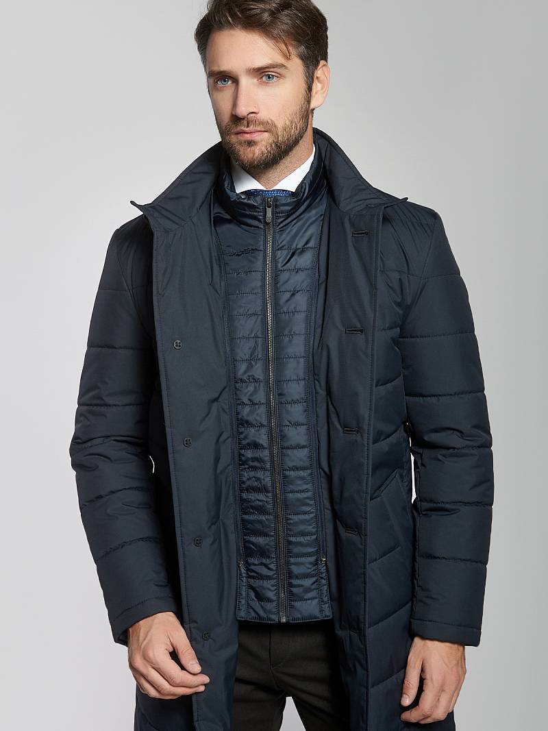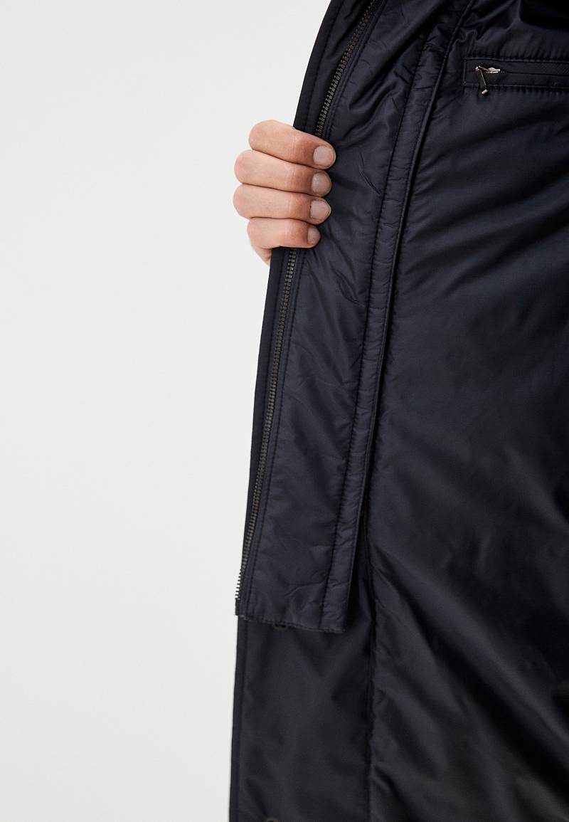 Куртка мужская утепленная с отстегивающийся манишкой на молнию. Застежка куртки на 6 пуговиц. Воротник - стойка. Полочки, спинка, рукава- простеганы горизонтальной стежкой. На полочках - два нижних боковых кармана с листочками. В нижней части среднего шва спинки- шлица на 2-х кнопках. Рукава втачные с локтевыми швами. На подкладке - два внутренних прорезных кармана на молниях. Длина по спинке для размера-роста 50/176 - 95см. Ткань верха: 100%полиэстер. Подкладка: 100%полиэстер. Утеплитель: термоплюс 200гр./160гр