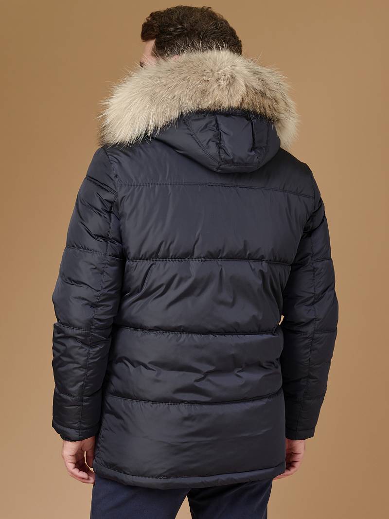 Куртка мужская утепленная (пуховик) с капюшоном из плащевой ткани с центральной застежкой на молнию и ветрозащитную планку на 4 пуговицы. Капюшон отстегивающийся c опушкой из натурального меха, воротник - стойка. Простеганные двойной отделочной строчкой - полочки и спинка- с кок
