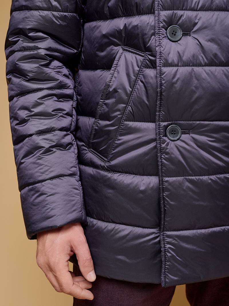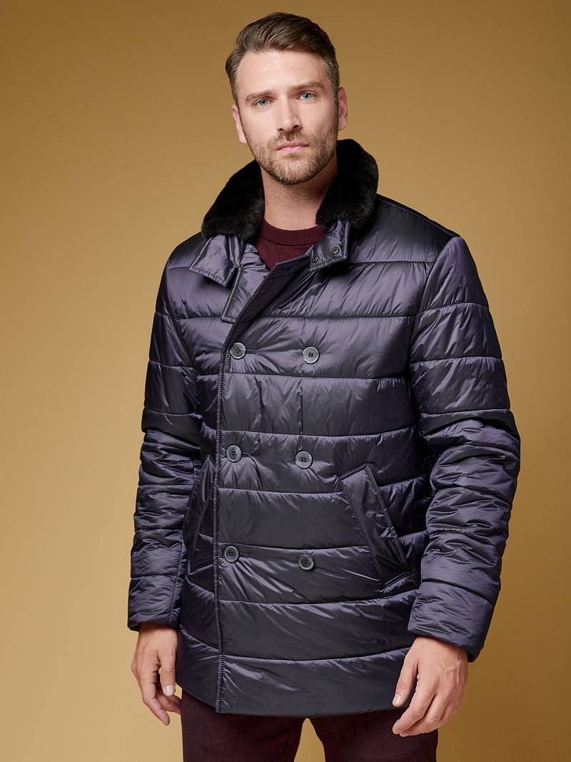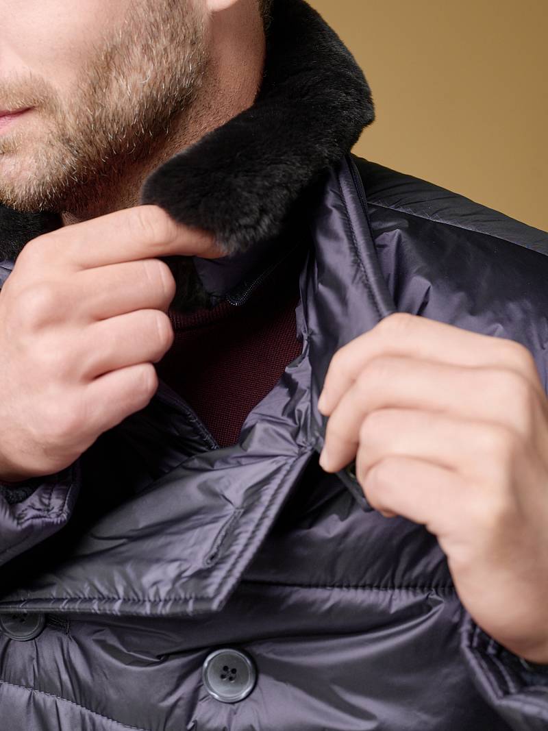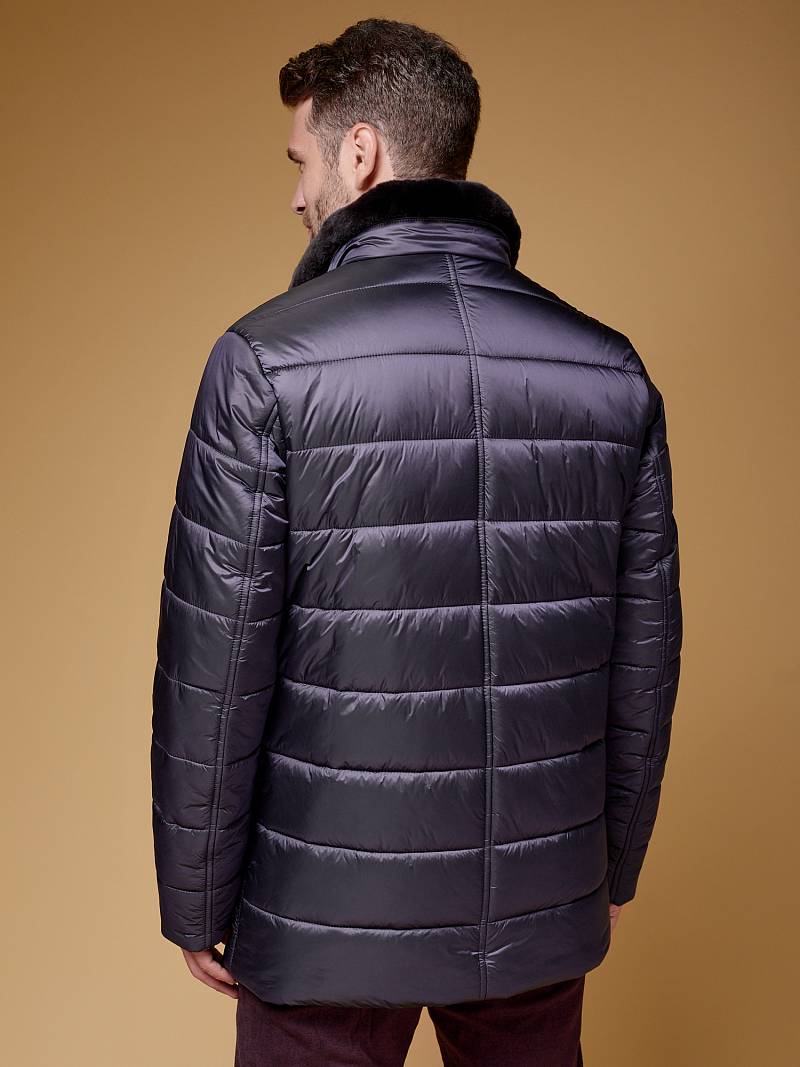 Куртка мужская двубортная стеганая из курточной ткани. Инновационная пуходержащая ткань верха с обработкой wr, cire (ветро и влаго защита). - имеет благородный блеск, легкая и практичная. Изделие с лацканами пиджачного типа и воротником -стойкой, застежка доверху на пуговицы. На стойке отстегивающийся меховой воротник из натурального меха - кролик REX. Полочки, спинка, рукава простеганы, на полочках - два удобных кармана с листочкой на скрытых магнитах. Мешковина карманов из велюра, придает мягкость, создает тепло и комфорт в изделии. Рукава втачные с локтевыми швами, по низу теплые трикотажные манжеты . Технологичная внутренняя подкладка с защитой от миграции утеплителя, на подкладке - два вместительных внутренних кармана для документов с застежкой молнией. Длина по спинке-82см. Ткань верха: 100%нейлон. Подкладка: 100%полиэстер. Утеплитель: термоплюс 250гр/210гр. Воротник: натуральный мех - кролик REX
