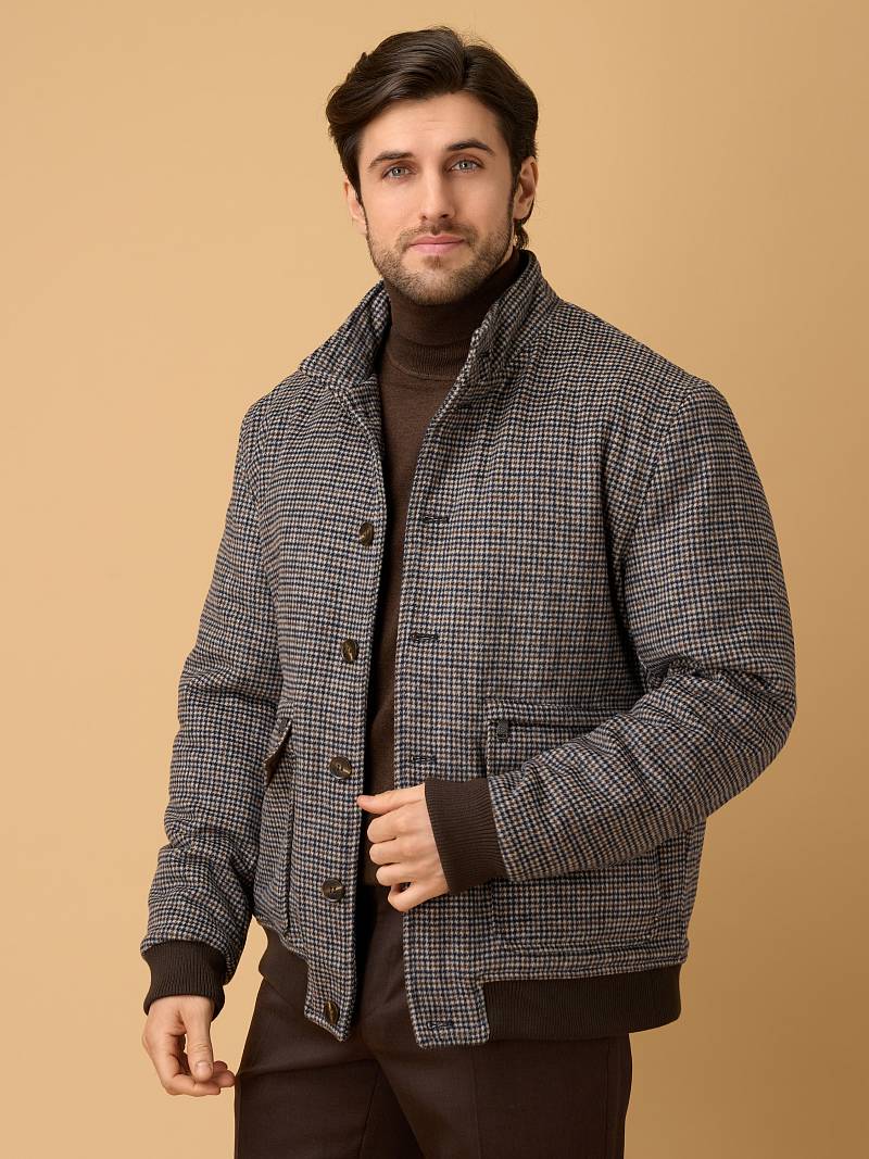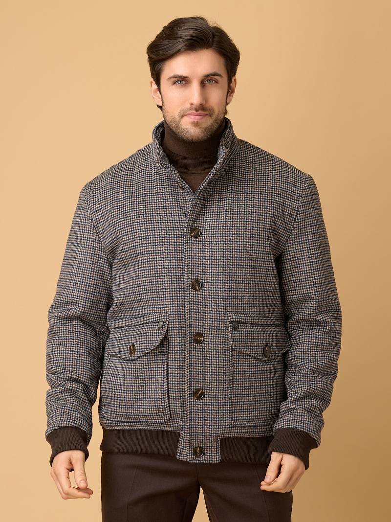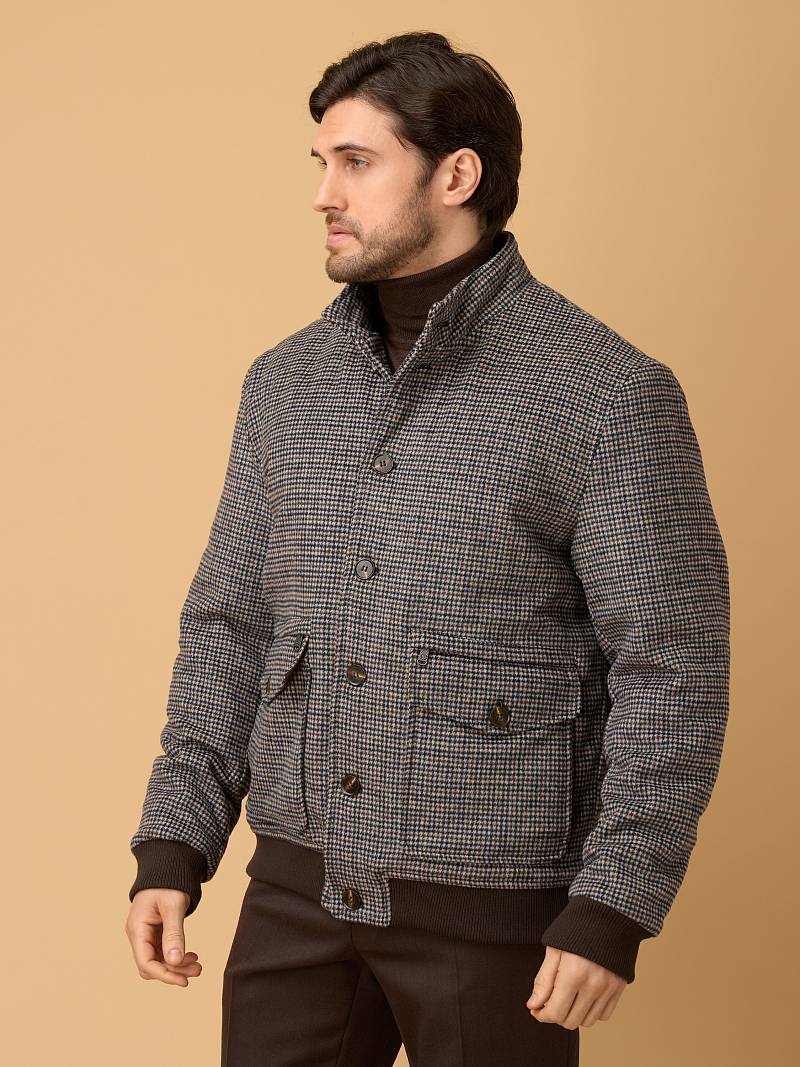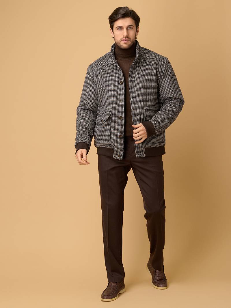 Представляем стильную и функциональная куртку‑бомбер из 100% натуральной плотной и мягкой шерсти, универсального серо-коричневогоо цвета с оригинальным узором "гусиные лапки", сочетающую комфорт, практичность и современный дизайн. Модель отлично подходит для прохладной погоды сезона осень-зима, сохраняя тепло и обеспечивая свободу движений. Застежка куртки - ряд прочных пуговиц по центру — классический вариант для бомберов, обеспечивающий надёжную фиксацию и стильный ретро‑акцент. Воротник - стойка плотно облегает шею и защищает от ветра. Большой накладной карман, расположенный в нижней части куртки, дополнен клапаном на пуговице для надёжности. Он вместительный и удобный для хранения объёмных предметов (перчаток, кошелька, смартфона). Карман на молнии над накладным карманом компактный, но функциональный, он идеален для ценных мелочей (ключа, проездного, банковской карты). Молния обеспечивает надёжную защиту от выпадения. Для сохранения тепла и комфорта манжеты на рукавах и низ куртки собраны на широкую резинку с фактурой в рубчик. Дополнительное тепло обеспечивает стеганая подкладка, на которой расположены два внутренних кармана на молниях. Внутри куртки выполнена отделка контрастным кантом. Эта куртка идеально подходит тем, кто ищет непринуждённый стиль, но с вниманием к деталям. Она будет комфортной спутницей для пары классических или кэжуальных брюк, в комбинации с трикотажем, которые представлены в нашем магазине. Дизайнеры марки BAZIONI тщательно выбирают и используют ткани и прикладные материалы только от передовых производителей