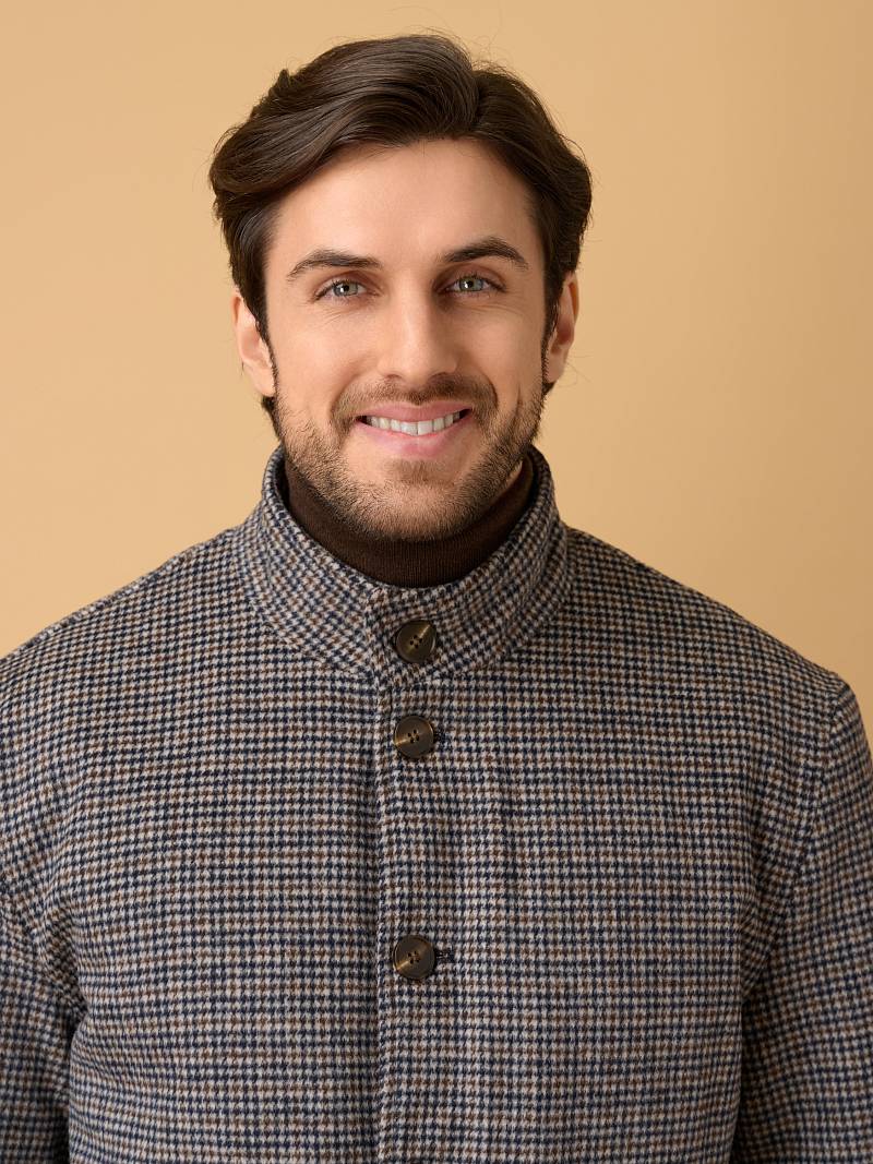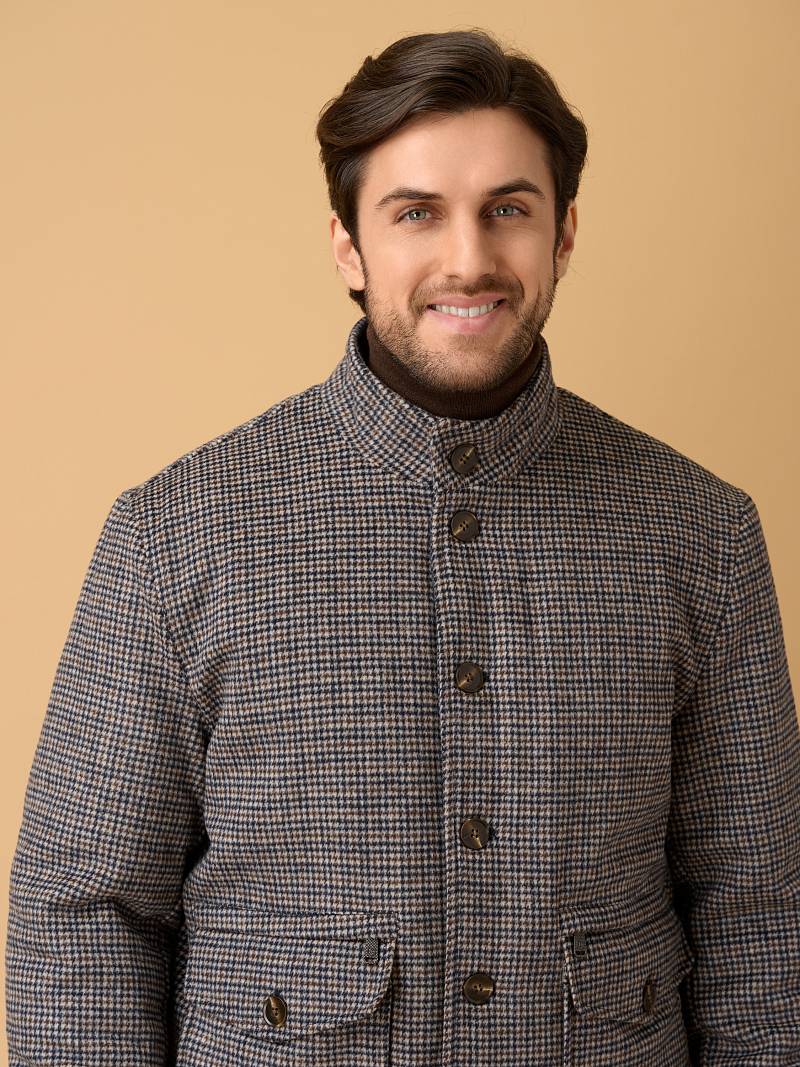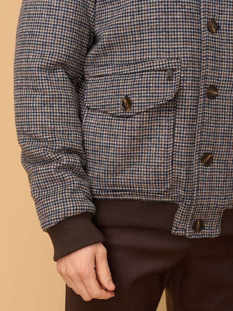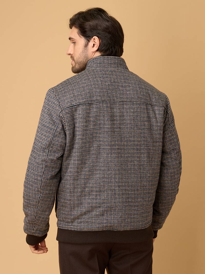 Представляем стильную и функциональная куртку‑бомбер из 100% натуральной плотной и мягкой шерсти, универсального серо-коричневогоо цвета с оригинальным узором "гусиные лапки", сочетающую комфорт, практичность и современный дизайн. Модель отлично подходит для прохладной погоды сезона осень-зима, сохраняя тепло и обеспечивая свободу движений. Застежка куртки - ряд прочных пуговиц по центру — классический вариант для бомберов, обеспечивающий надёжную фиксацию и стильный ретро‑акцент. Воротник - стойка плотно облегает шею и защищает от ветра. Большой накладной карман, расположенный в нижней части куртки, дополнен клапаном на пуговице для надёжности. Он вместительный и удобный для хранения объёмных предметов (перчаток, кошелька, смартфона). Карман на молнии над накладным карманом компактный, но функциональный, он идеален для ценных мелочей (ключа, проездного, банковской карты). Молния обеспечивает надёжную защиту от выпадения. Для сохранения тепла и комфорта манжеты на рукавах и низ куртки собраны на широкую резинку с фактурой в рубчик. Дополнительное тепло обеспечивает стеганая подкладка, на которой расположены два внутренних кармана на молниях. Внутри куртки выполнена отделка контрастным кантом. Эта куртка идеально подходит тем, кто ищет непринуждённый стиль, но с вниманием к деталям. Она будет комфортной спутницей для пары классических или кэжуальных брюк, в комбинации с трикотажем, которые представлены в нашем магазине. Дизайнеры марки BAZIONI тщательно выбирают и используют ткани и прикладные материалы только от передовых производителей
