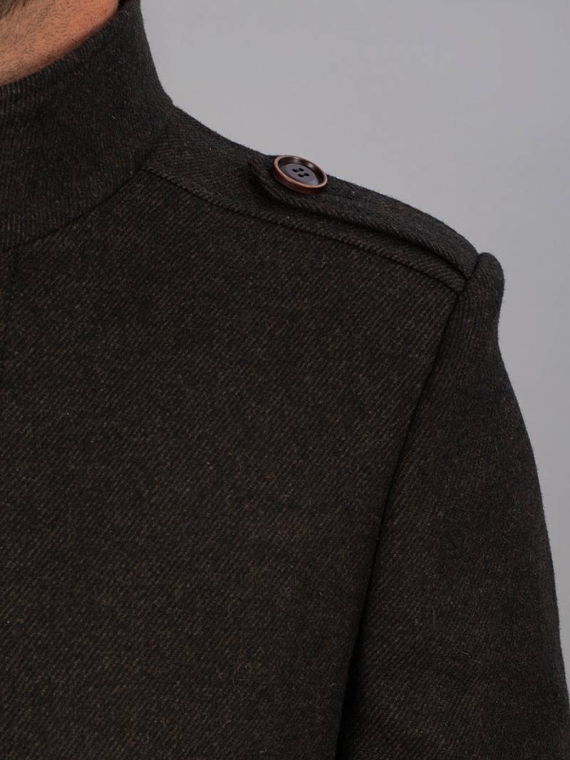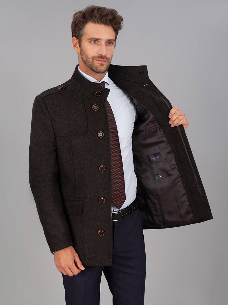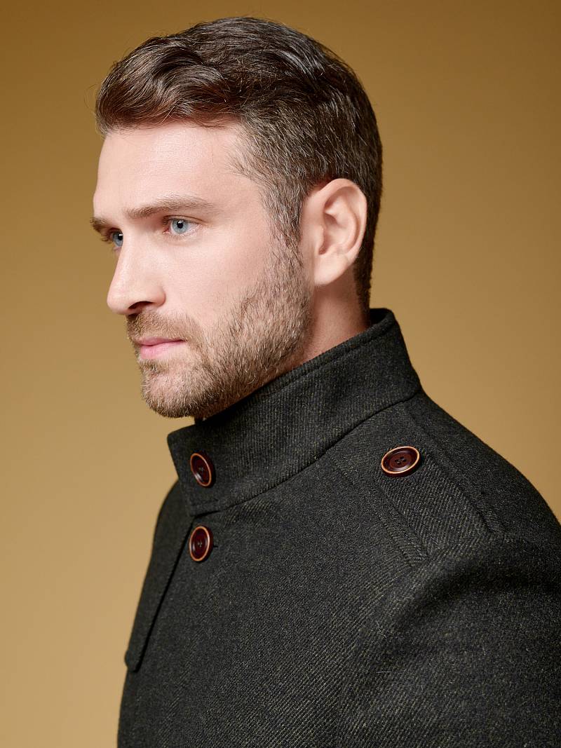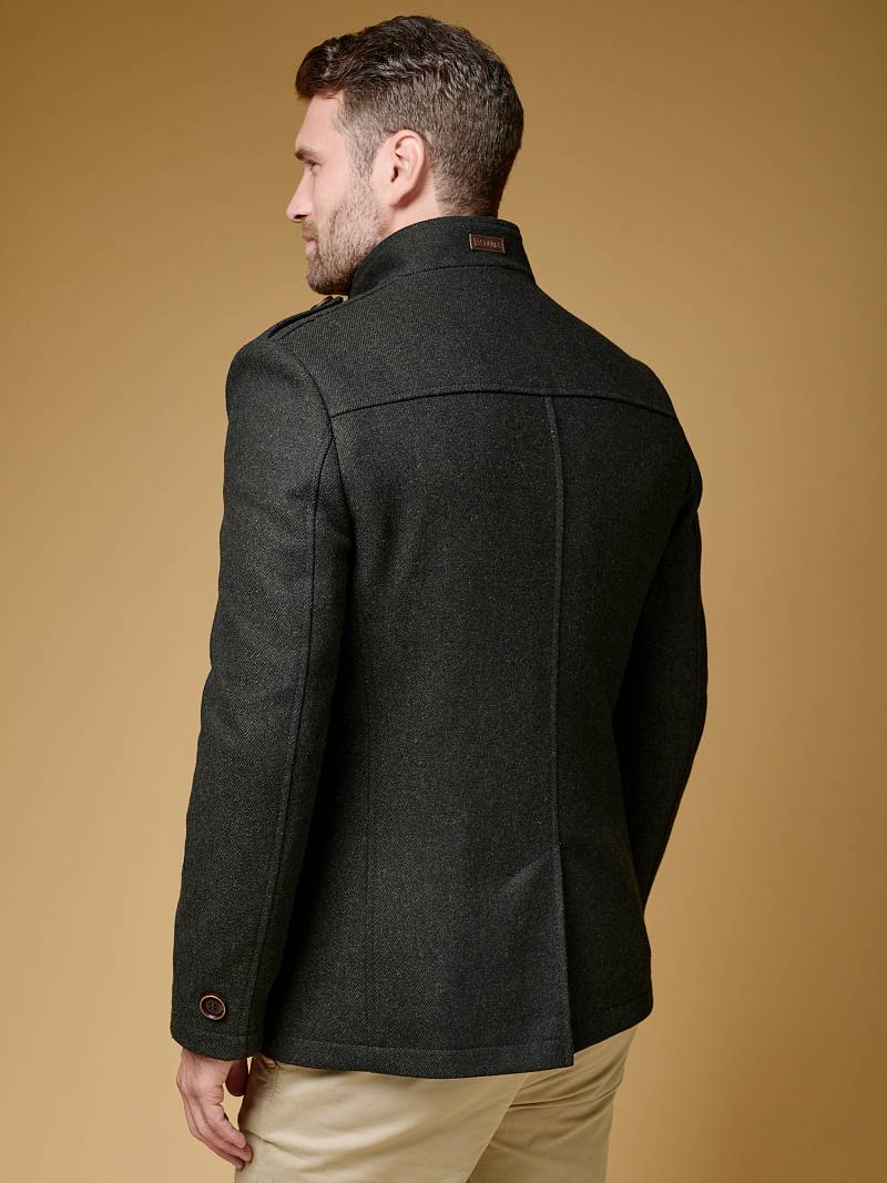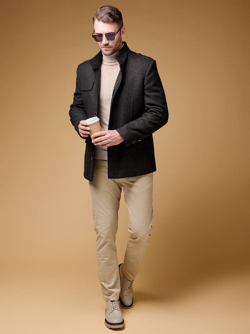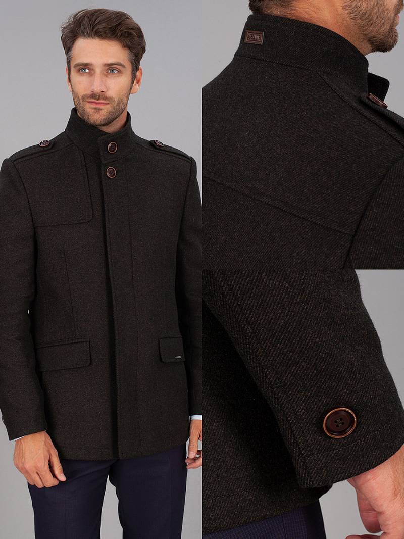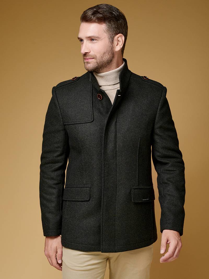 Пальто мужское утепленное прямого силуэта, воротник стойка, погоны, центральная супатная застёжка. Боковые карманы с клапаном. Рукав втачной двухшовный. Спинка с отрезной кокеткой, средним швом и одной шлицей. На подкладке два внутренних кармана на молнии. Длина изделия по спинке для роста 176 - 78см. Ткань верха: 100% шерсть. Подкладка: 50% вискоза, 50% полиэстер. Утеплитель: Термоплюс 160гр.