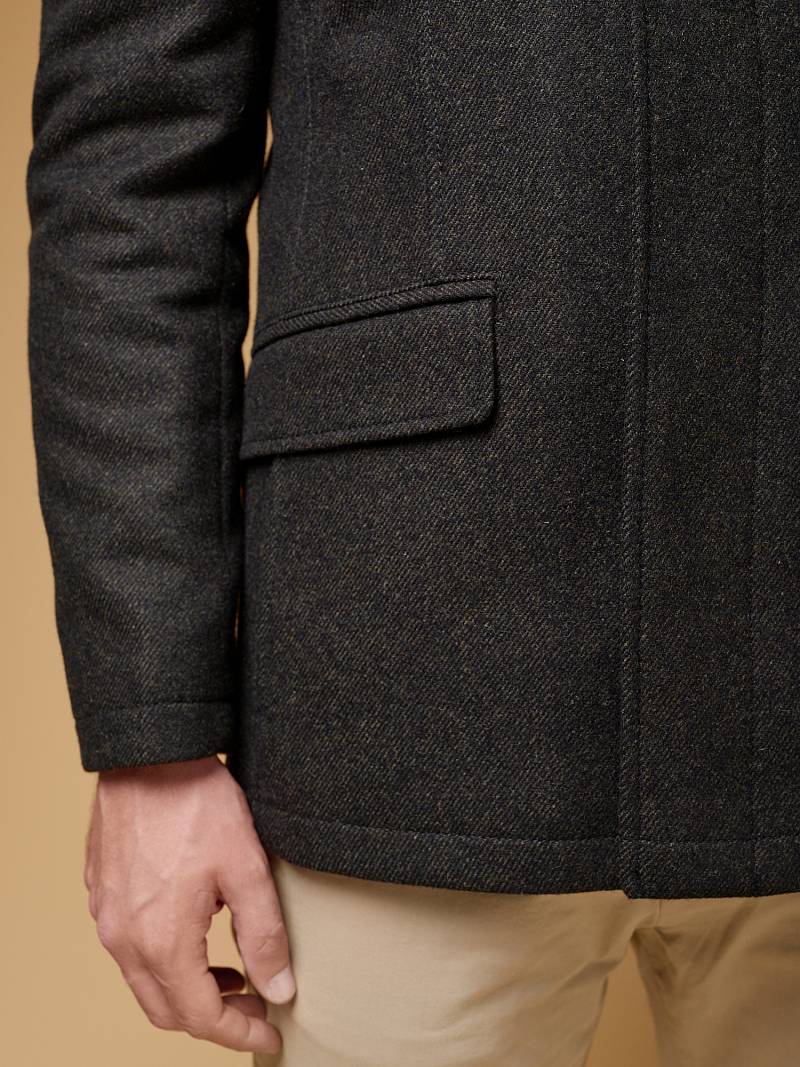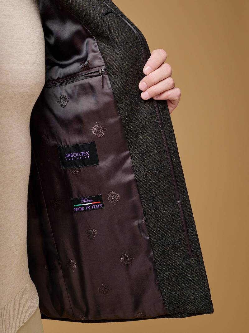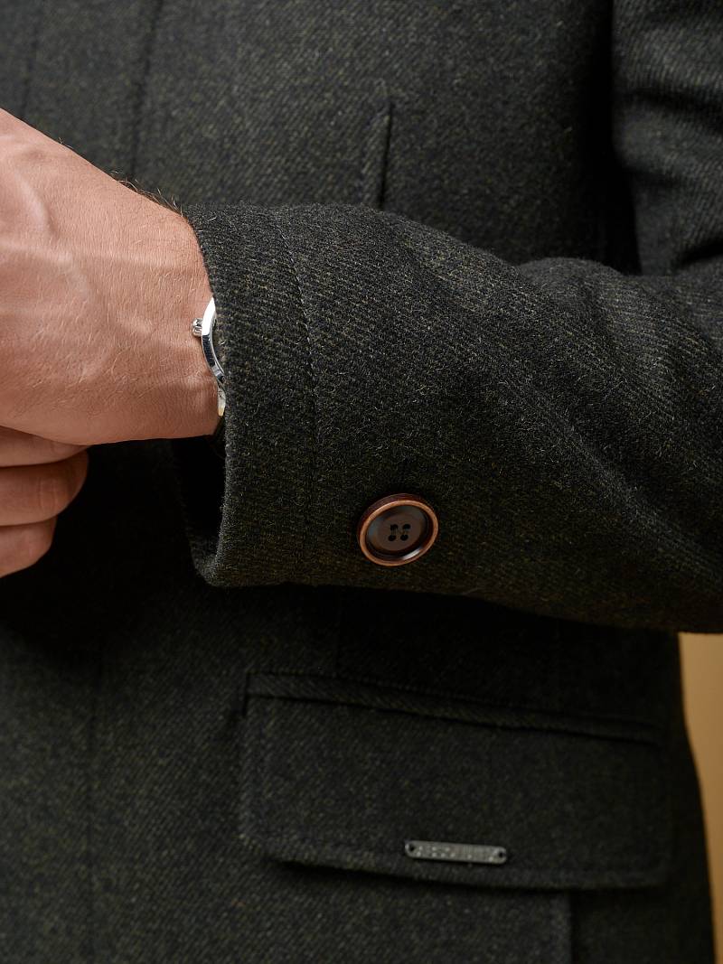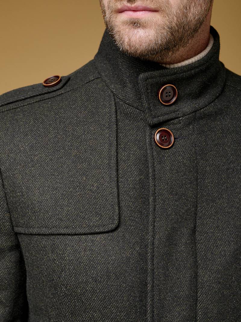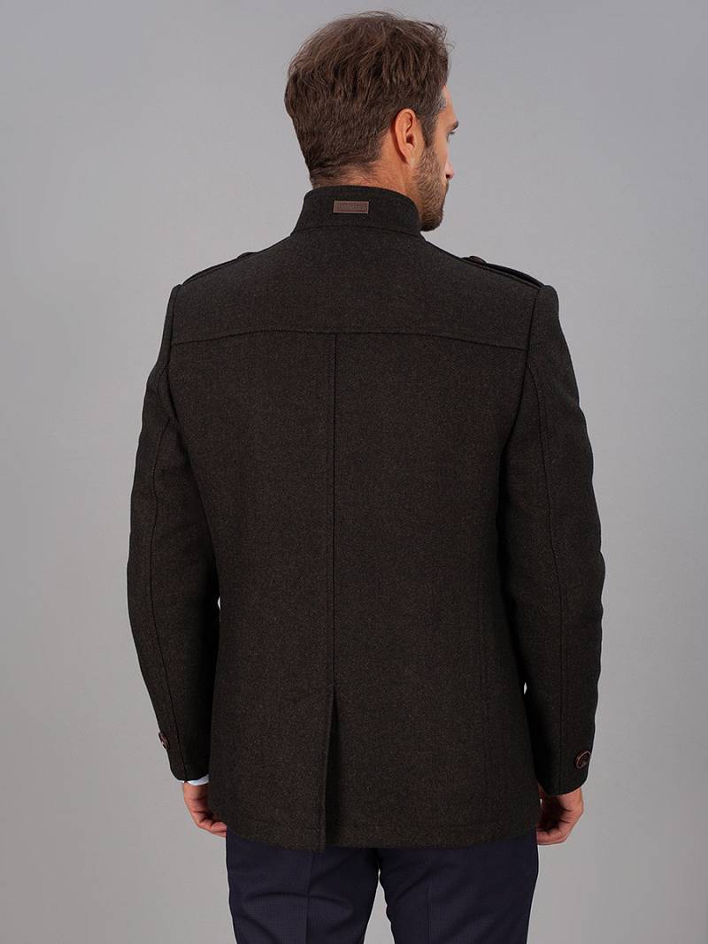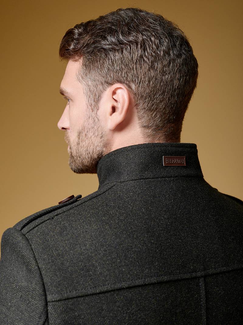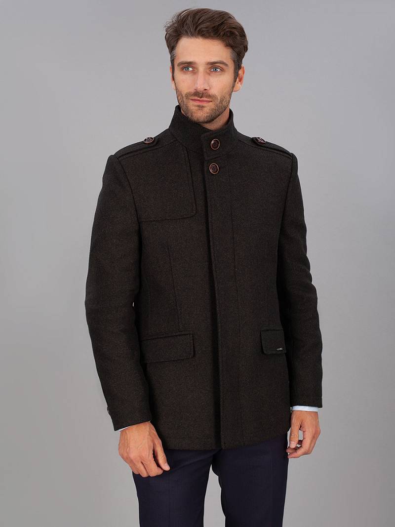 Пальто мужское утепленное прямого силуэта, воротник стойка, погоны, центральная супатная застёжка. Боковые карманы с клапаном. Рукав втачной двухшовный. Спинка с отрезной кокеткой, средним швом и одной шлицей. На подкладке два внутренних кармана на молнии. Длина изделия по спинке для роста 176 - 78см. Ткань верха: 100% шерсть. Подкладка: 50% вискоза, 50% полиэстер. Утеплитель: Термоплюс 160гр.