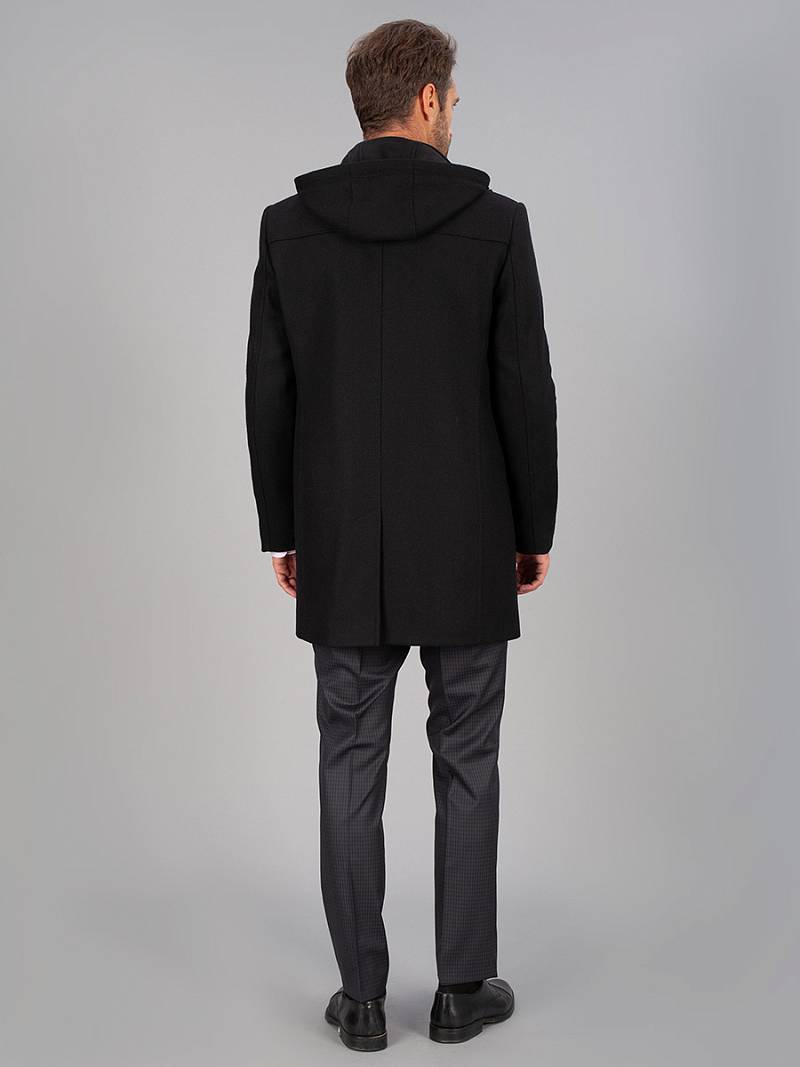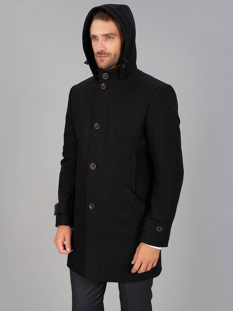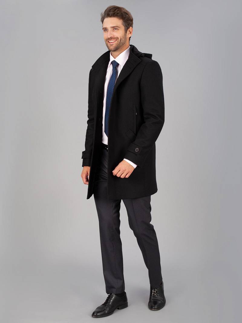 Пальто мужское утепленное с центральной застежкой на пуговицы, воротник-стойка, отстегивающийся капюшон, боковые карманы- прорезные застегивающиеся на молнию и прорезные с листочкой, спинка и полочка с отрезными кокетками, В нижней части среднего шва спинки-одна шлица на потайной кнопке. На подкладке два внутренних кармана: один - на пуговице, второй на молнии. Длина изделия по спинке для роста 176 - 90см. Ткань верха: 100% шерсть. Подкладка: 50% вискоза, 50% полиэстер. Утеплитель: Термоплюс 100гр