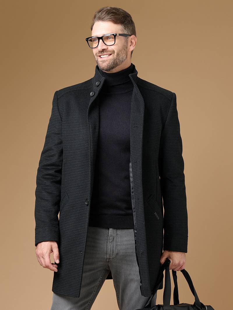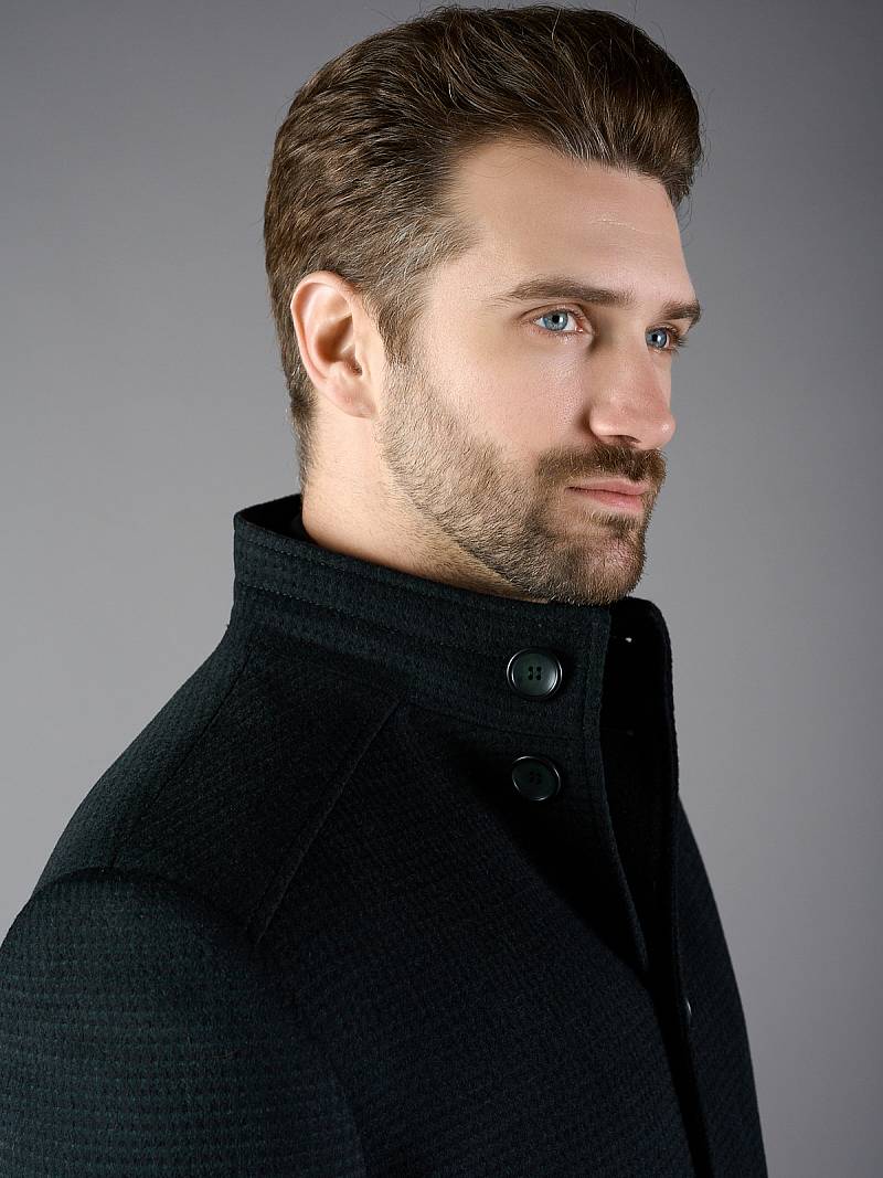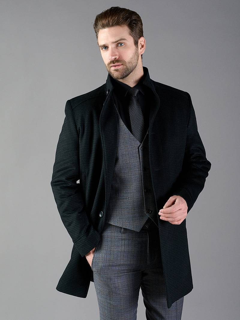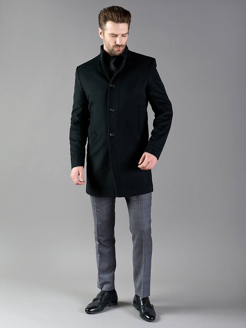 Пальто мужское утепленное с центральной застежкой на пуговицы, воротник-стойка, боковые карманы- прорезные застегивающиеся на молнию и прорезные с листочкой, спинка и полочка с отрезными кокетками, В нижней части среднего шва спинки одна шлица на потайной кнопке.
