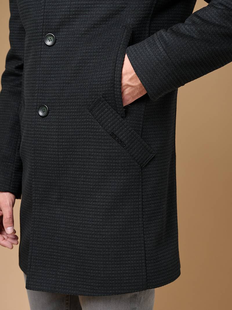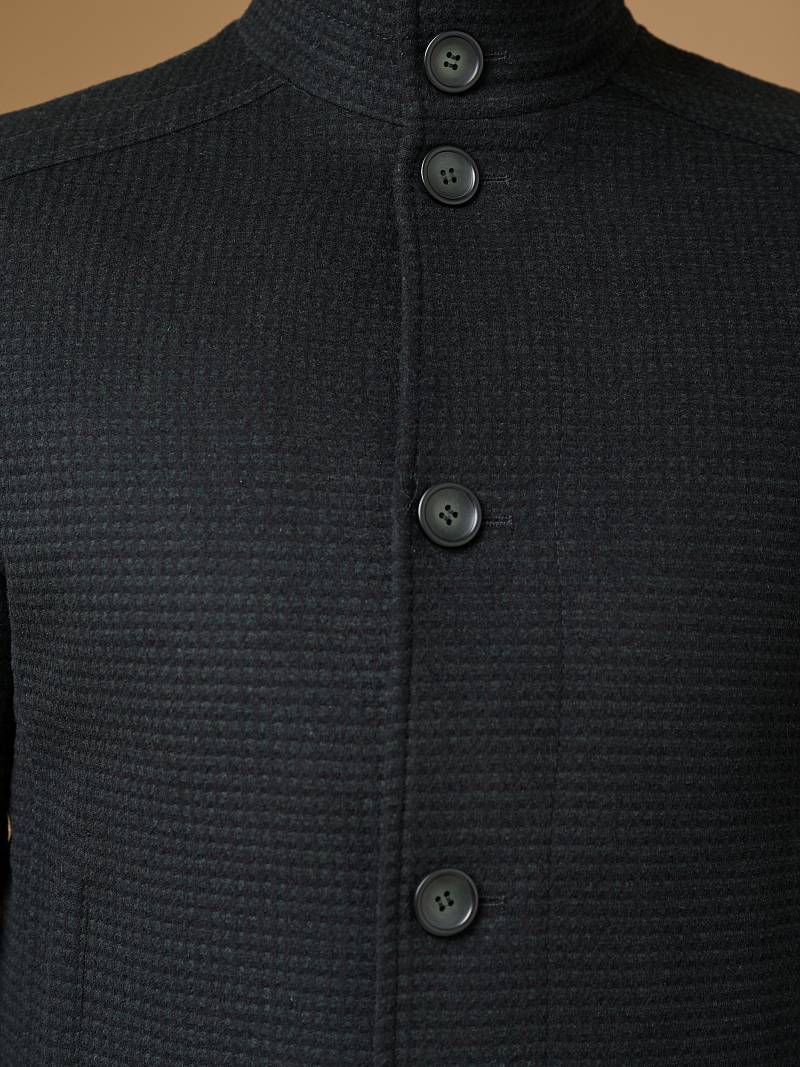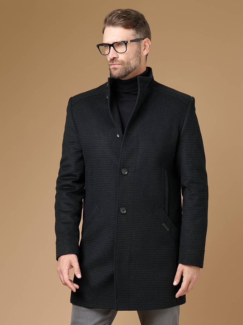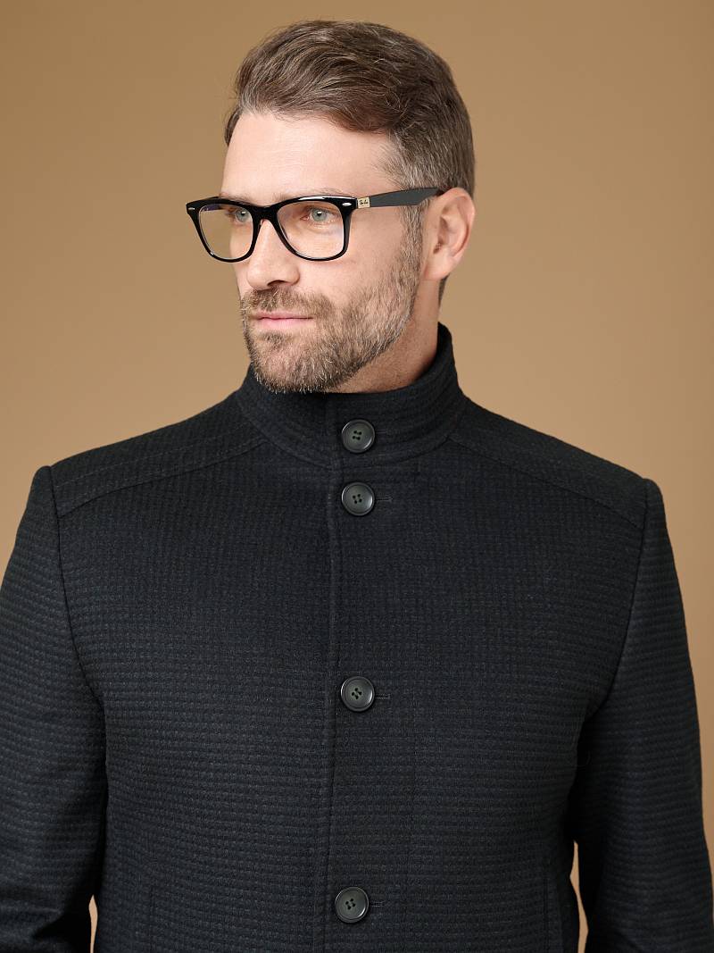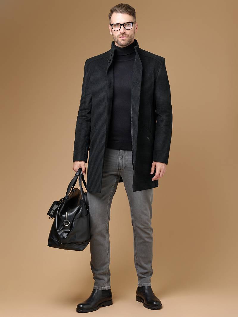 Пальто мужское утепленное с центральной застежкой на пуговицы, воротник-стойка, боковые карманы- прорезные застегивающиеся на молнию и прорезные с листочкой, спинка и полочка с отрезными кокетками, В нижней части среднего шва спинки одна шлица на потайной кнопке.