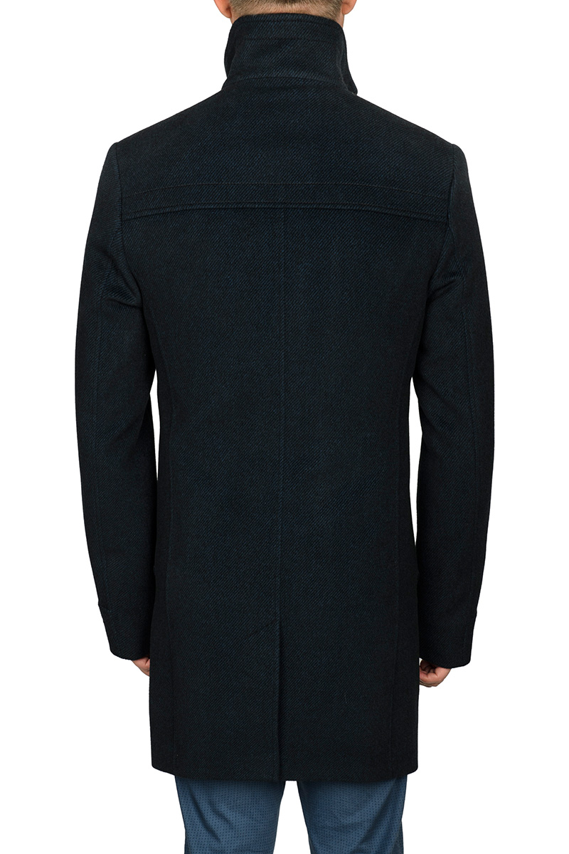 Пальто мужское с потайной -супатной застежкой на пуговицы. Воротник - стойка. Полочки и спинка с кокетками. На полочках - карманы- прорезные на молнию и прорезные с листочкой, Спинка со средним швом и одной шлицей. Рукава втачные с локтевым швом.