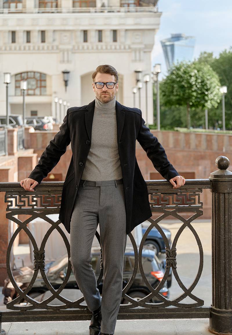 Пальто мужское утепленное с английским воротником. Полочки с кокетками без плечевых швов. В рельефных швах полочек - верхние прорезные карманы на молнию, нижние боковые прорезные карманы с листочками - наклонные. Спинка со средним швом и шлицей и рельефными швами. Рукава втачные, по низу передней части рукавов - манжеты с пуговицами. Подкладка комбинированная, отрезная по линии талии. В швах притачивания подбортов - нагрудные внутренние карманы на молниях..