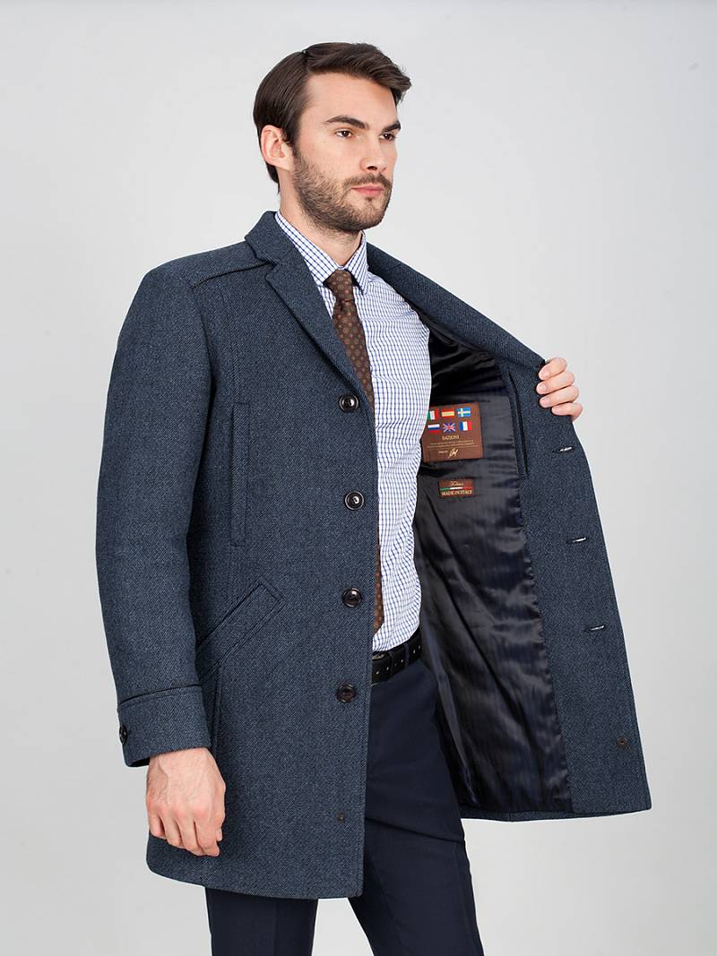 Пальто мужское утепленное с английским воротником. Полочки с кокетками без плечевых швов. В рельефных швах полочек - верхние прорезные карманы на молнию, нижние боковые прорезные карманы с листочками - наклонные. Спинка со средним швом и шлицей и рельефными швами. Рукава втачные, по низу передней части рукавов - манжеты с пуговицами. В швах притачивания подбортов - нагрудные внутренние карманы на молниях.