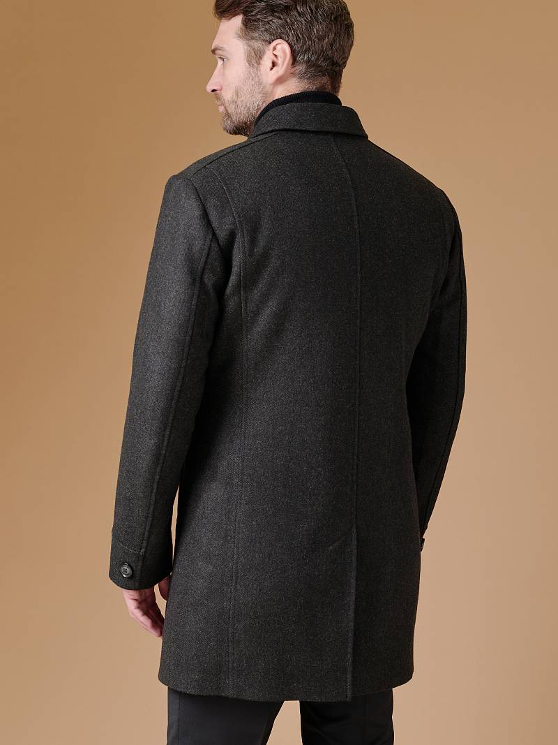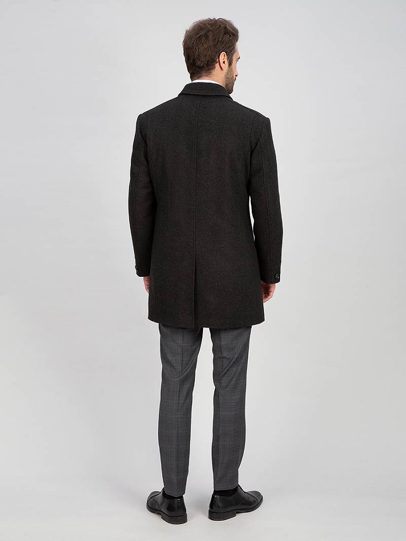 Пальто мужское утепленное с английским воротником. Полочки с кокетками без плечевых швов. В рельефных швах полочек - верхние прорезные карманы на молнию, нижние боковые прорезные карманы с листочками - наклонные. Спинка со средним швом и шлицей и рельефными швами. Рукава втачные, по низу передней части рукавов - манжеты с пуговицами. В швах притачивания подбортов - нагрудные внутренние карманы на молниях..