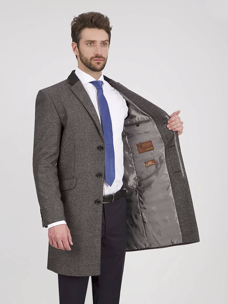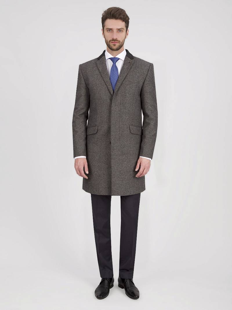 Пальто мужское утепленное полуприлегающего силуэта с потайной застежкой на 3 пуговицы. Воротник - английский с лацканами. На лацкане - декоративная петля. Полочки и спинка с рельефами. На передних половинках пальто - два нижних кармана с клапанами в рамку. По спинке - в среднем шве - шлица. Рукава втачные, по низу рукавов - шлица на пуговицах. Отделочная строчка проложена по борту, воротнику, лацканам, также по клапанам карманов.