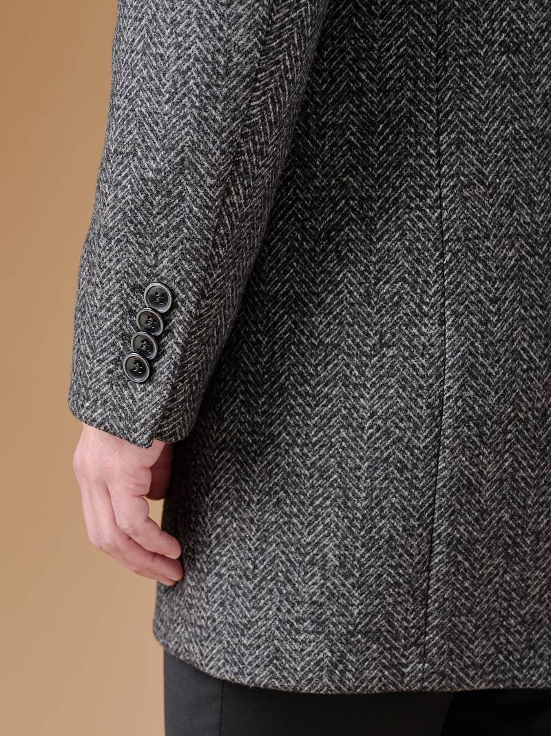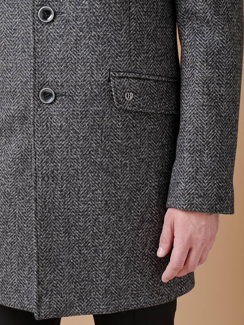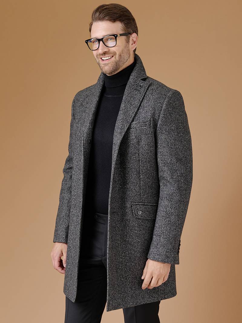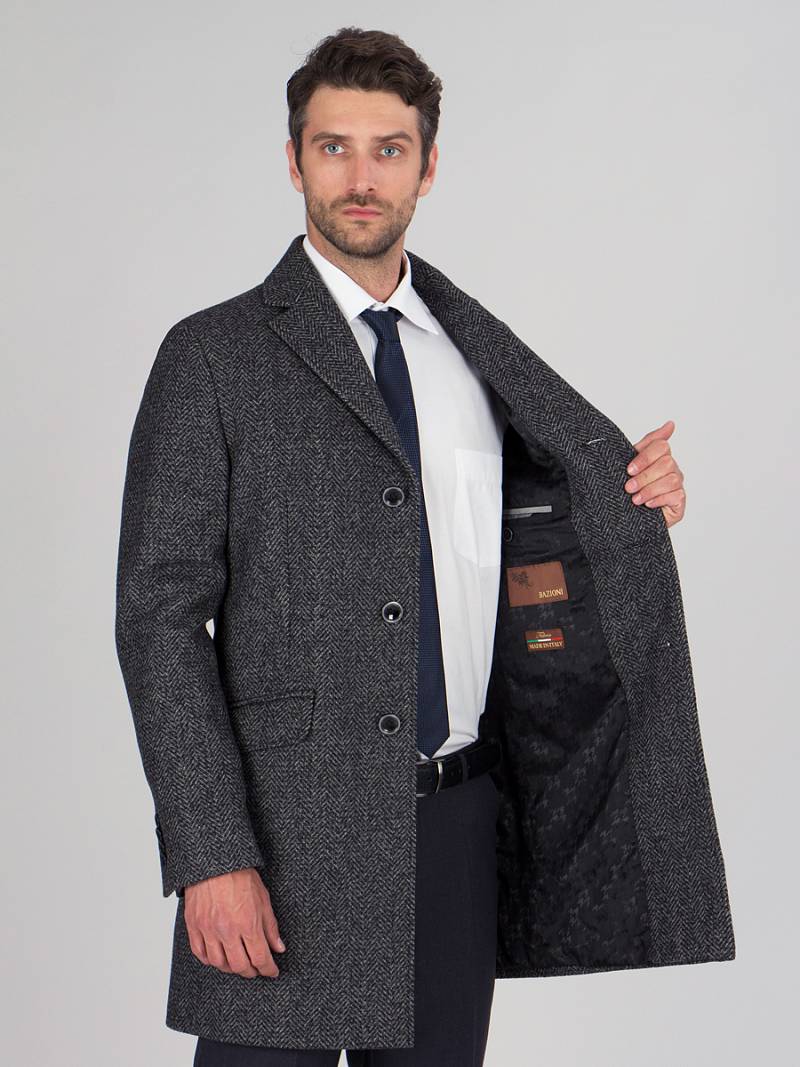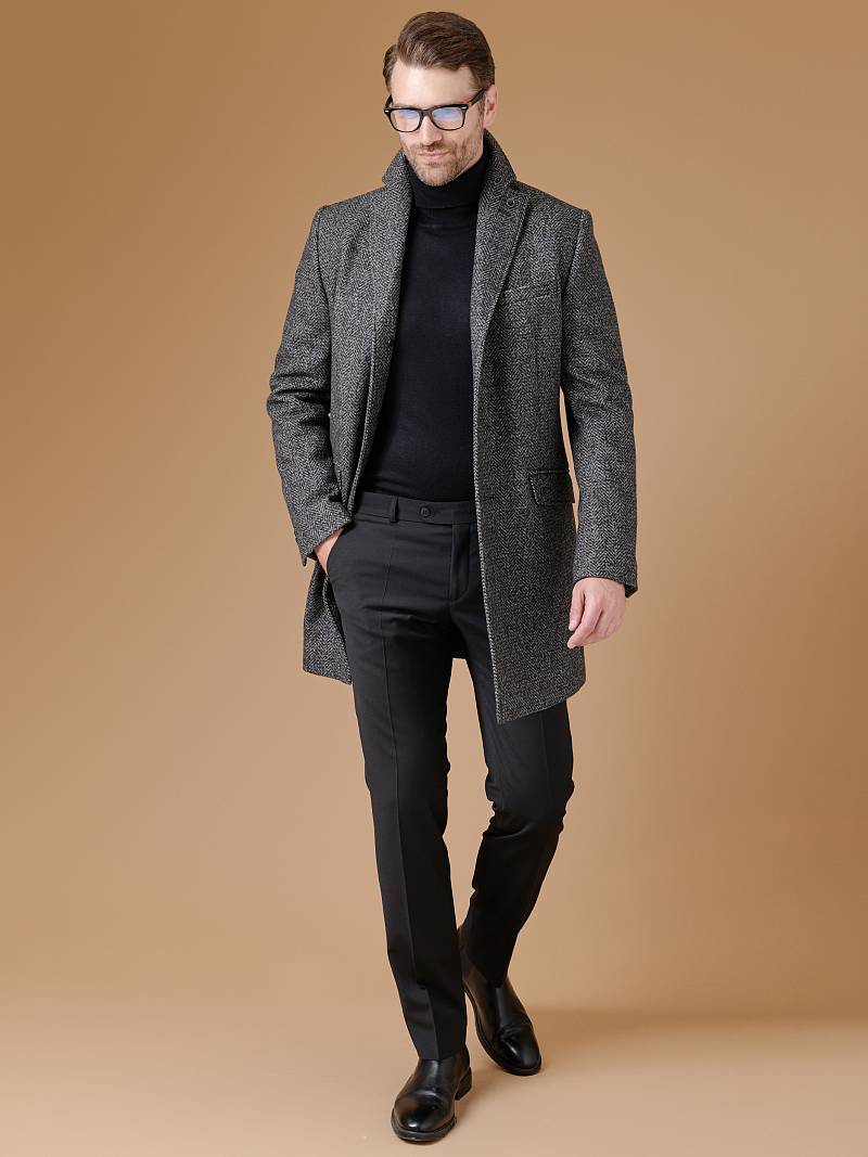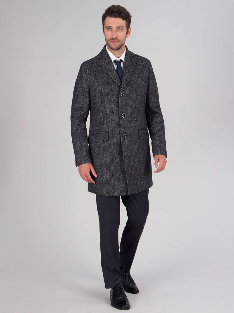 Пальто мужское с лацканами, застежка на 3 пуговицы, фасонная петля на лацкане. На полочках - верхний нагрудный карман с листочкой и два нижних боковых кармана с клапанами. Спинка со шлицей в среднем шве.