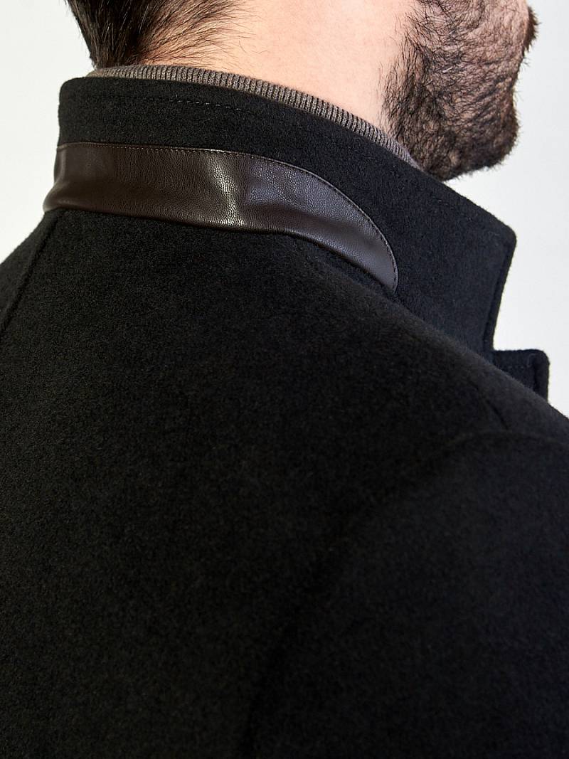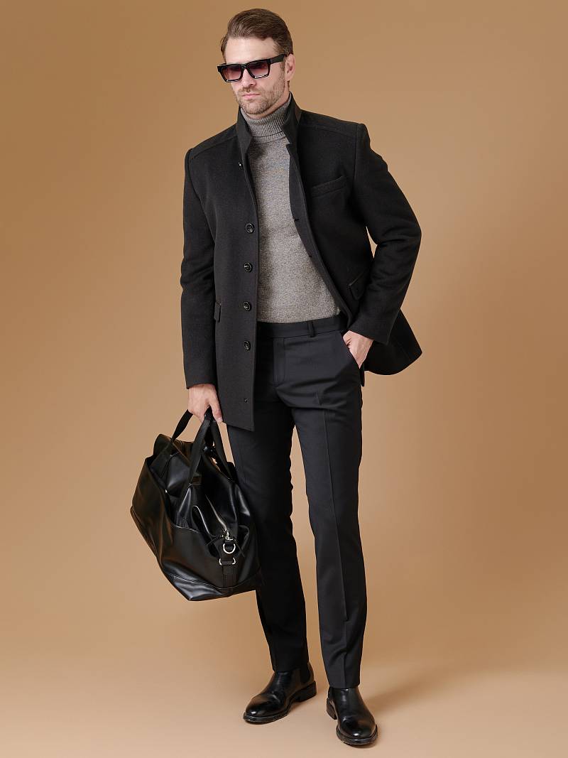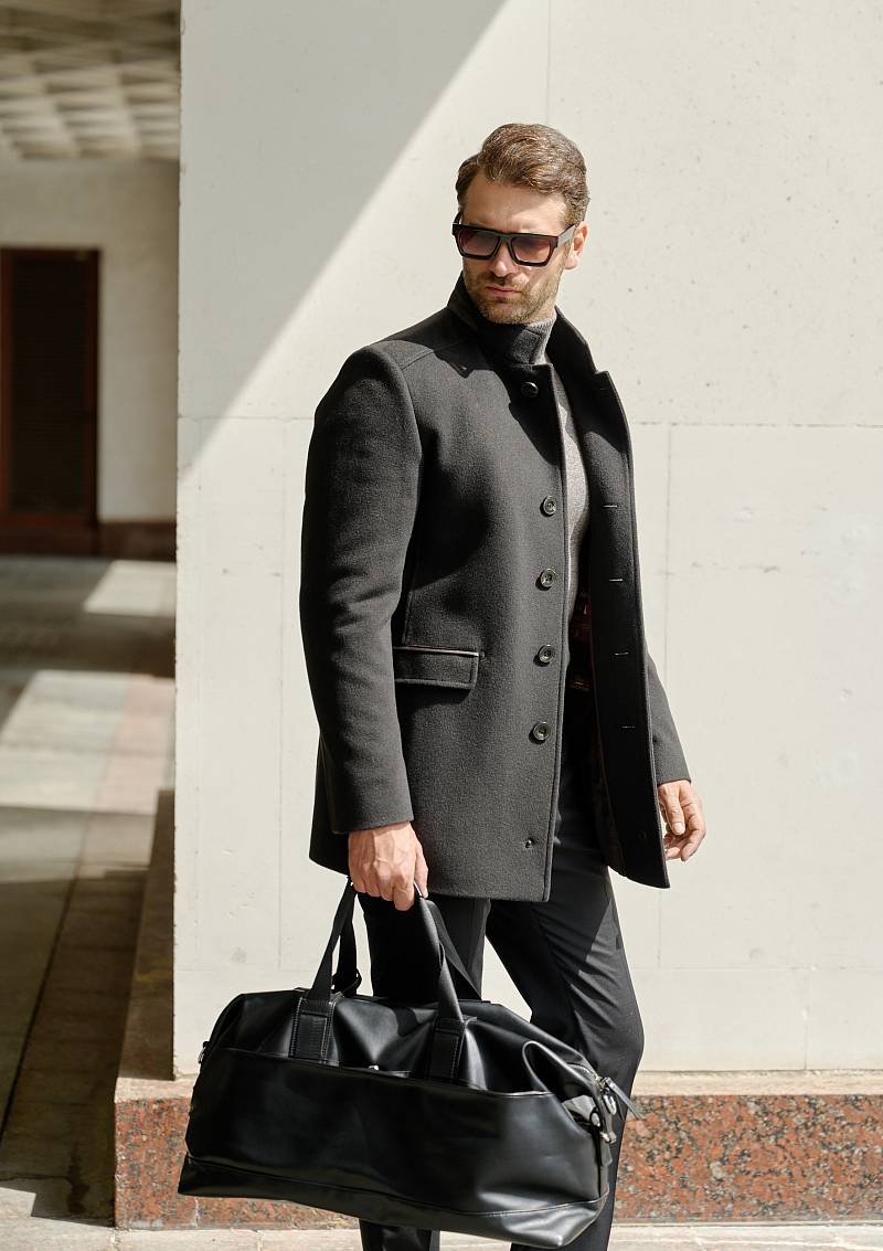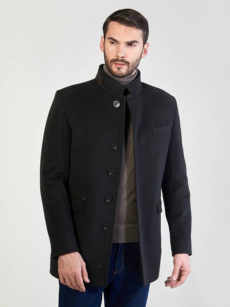 Пальто мужское утепленное, с застежкой на пуговицы, воротник-стойка. На полочках - нагрудный карман с листочкой и два нижних кармана с клапанами. Отделка - деталь на воротнике и детали в шлице рукавов. Длина изделия по спинке для роста 176 - 82см. Ткань верха: 100% шерсть. Подкладка: 50% вискоза, 50% полиэстер. Утеплитель: Термоплюс 100гр