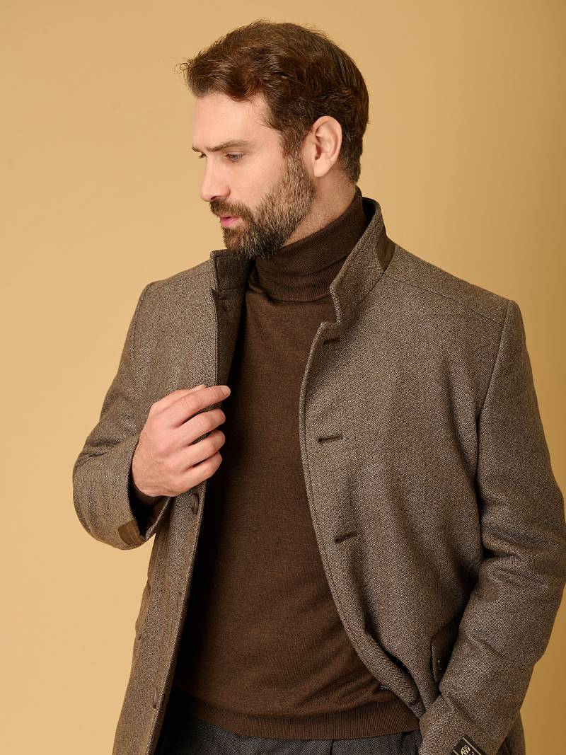 Мужское утепленное пальто (ПОЛУПРИЛЕГАЮЩИЙ СИЛУЭТ). Дизайнеры марки BAZIONI создали классическое пальто из осенне-зимней коллекции, вдохновившись главным принципам марки — стиль и качество, неподверженные времени. Благодаря выверенным лекалам и кропотливой сборке деталей силуэт вещи получился четким, а посадка комфортной. Для создания модели использовали 100% шерстяную ткань высокого качества которую дополнительно утеплили, по этому пальто получилось легким и теплым одновременно. Однобортное пальто с воротником-стойкой дополнено боковыми карманами с клапанами и двумя карманами в боковых швах. По воротнику и рукавам использовали отделку из кожи. Пальто обработано шелковой подкладкой с двумя внутренними карманами. Дизайнеры марки BAZIONI тщательно подходят к выбору материалов. Пуговицы подбираются и красятся индивидуально под каждую ткань, а прикладные материалы используют только от передовых производителей. Утеплитель: спинка-полочка-100г, рукава-60г. Пальто мужское, классическое, под джины, повседнев
