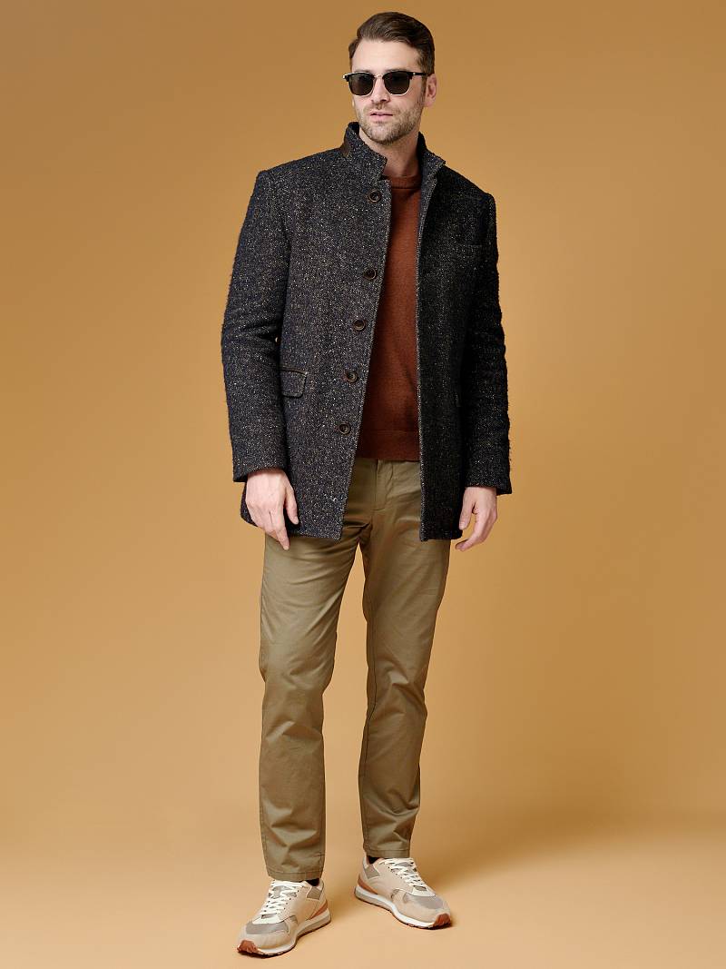 Пальто мужское утепленное, с застежкой на пуговицы, воротник-стойка. На полочках - нагрудный карман с листочкой и два нижних кармана с клапанами. Отделка - деталь на воротнике и детали в шлице рукавов. Длина изделия по спинке для роста 176 - 82см. Ткань верха: 100%шерсть. Подкладка: 50%вискоза 50%полиэстер. Утеплитель: термоплюс 100гр