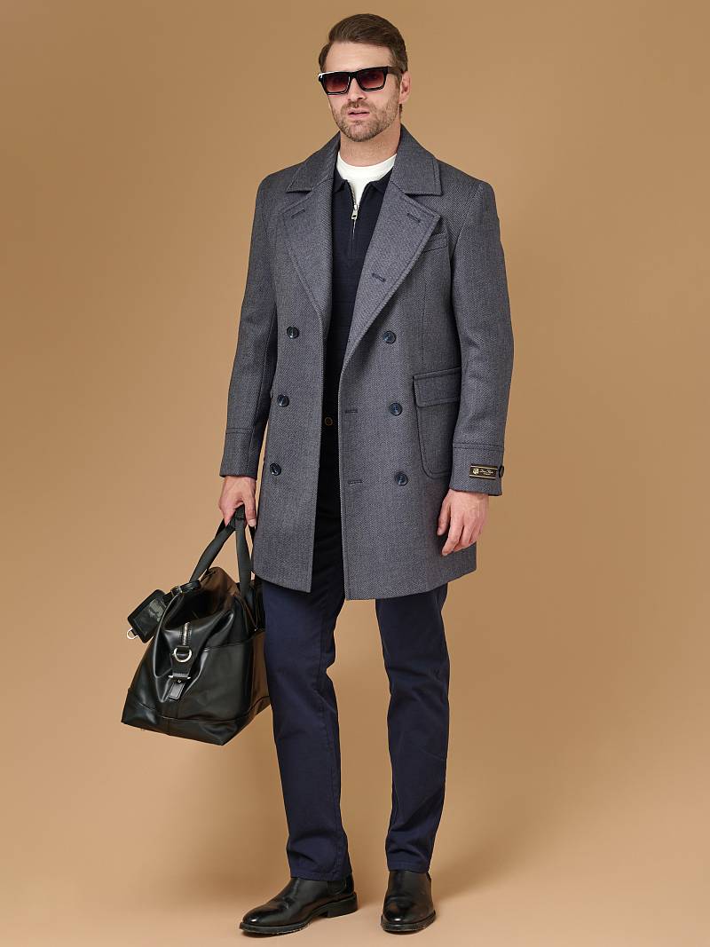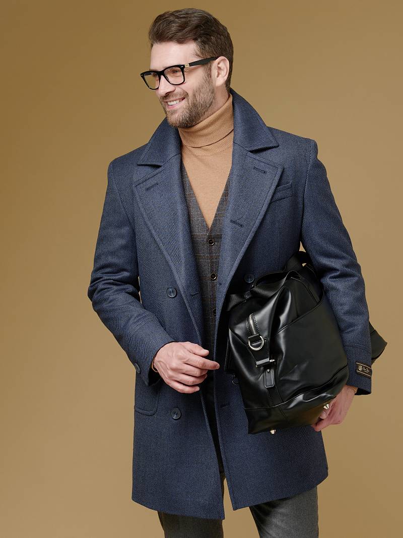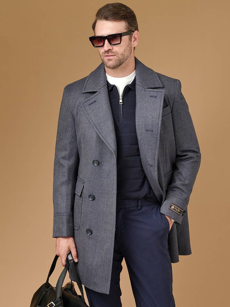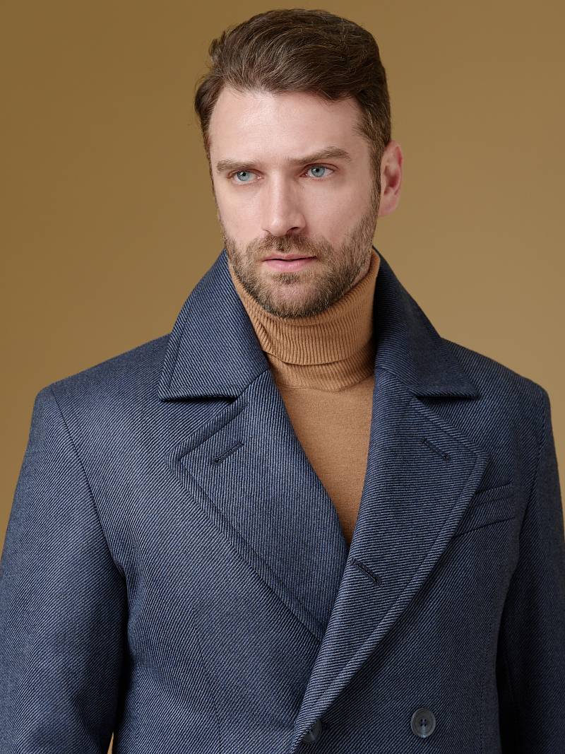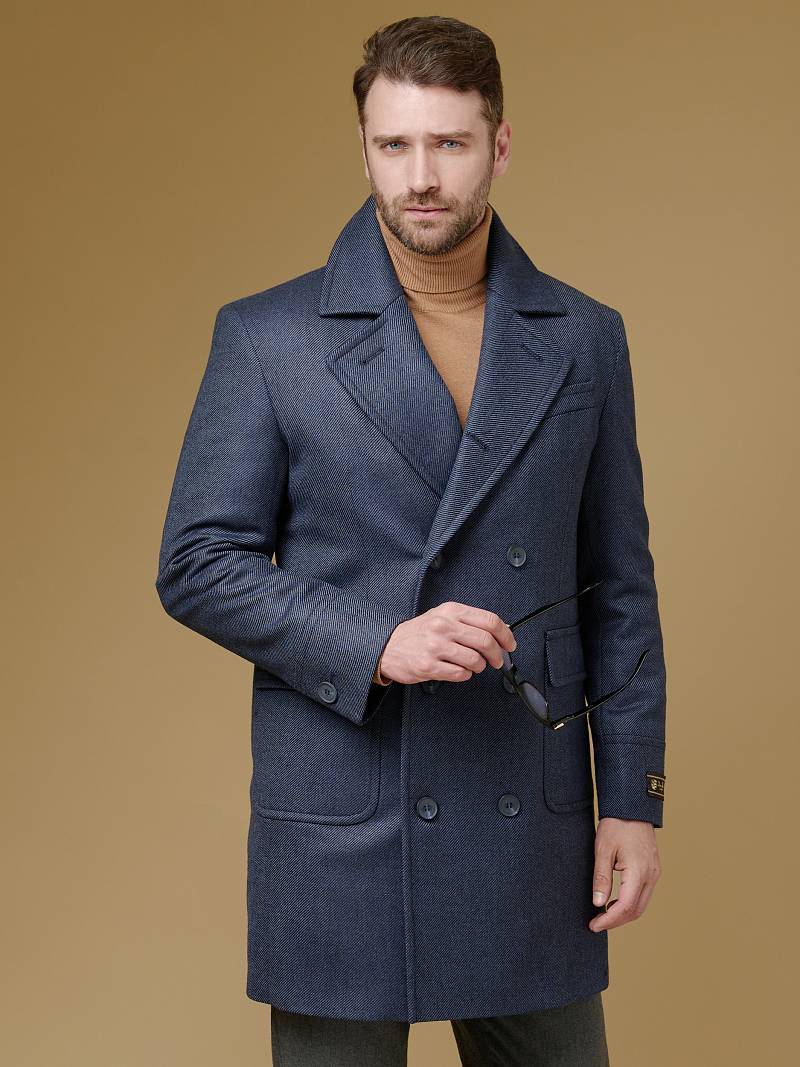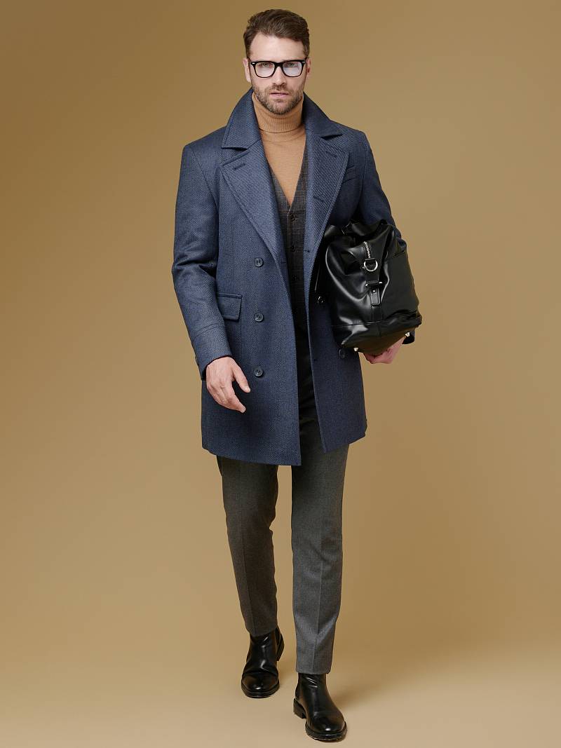 Classic Fit (ПОЛУПРИЛЕГАЮЩИЙ СИЛУЭТ). Классическое двубортное утепленное пальто с застежкой на пуговицы, с нагрудным карманом листочкой и двумя боковыми накладными карманами с клапанами. Рукав втачной, двухшовный, внизу рукава притачной манжет с декоративной пуговицей. По спинке расположена одна шлица. Отделочная сторочка проходит по краю борта, воротнику, лацкану, боковым карманам и среднему шву спинки. На подкладке расположены два внутренних кармана. Утеплитель-Термоплюс 100гр.