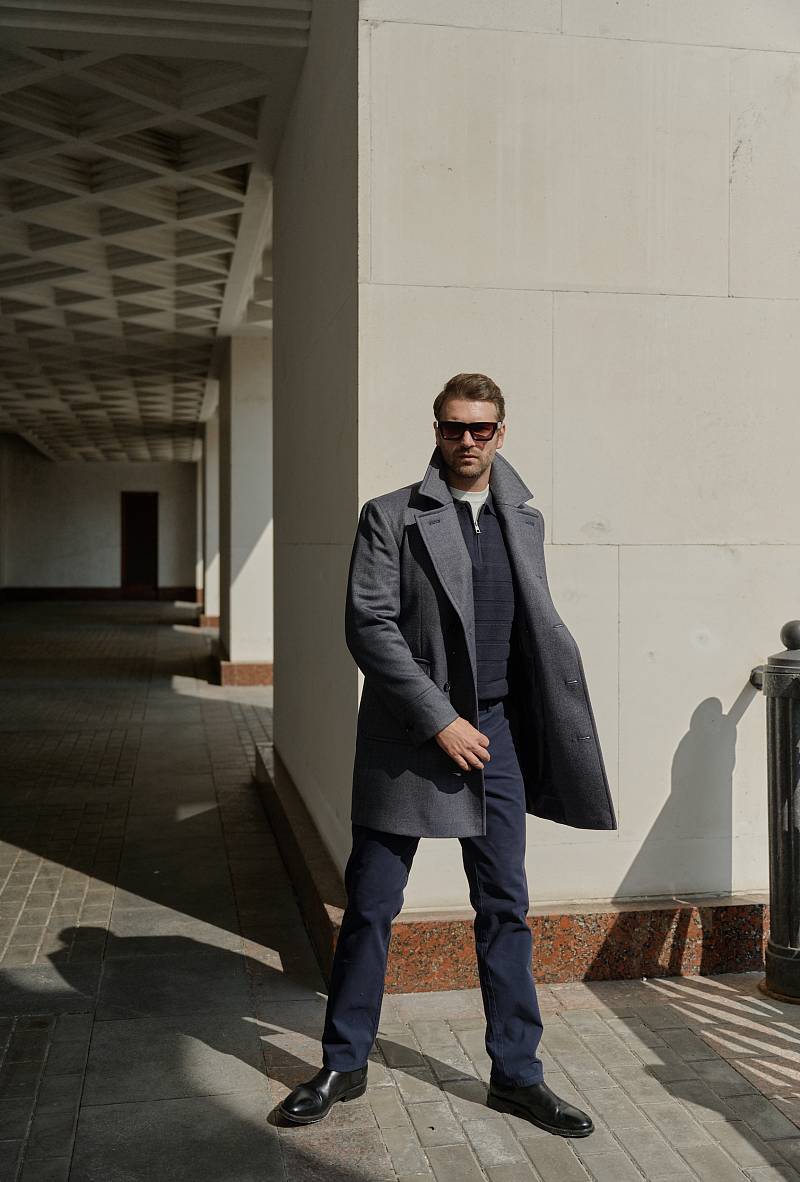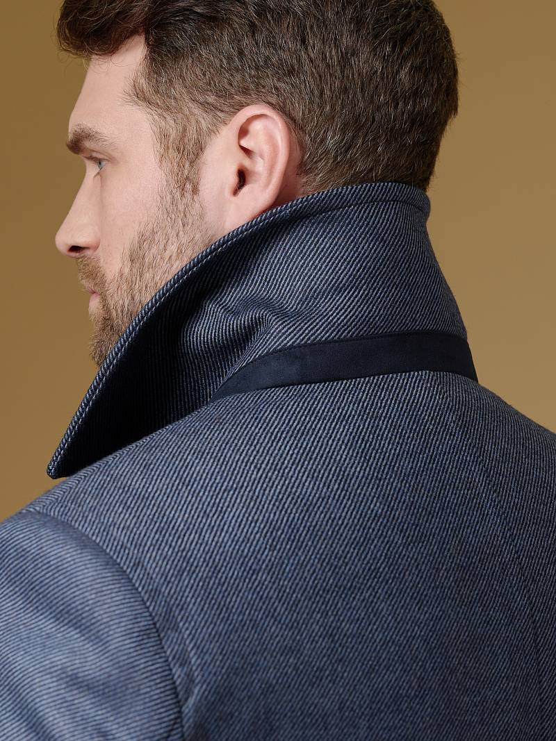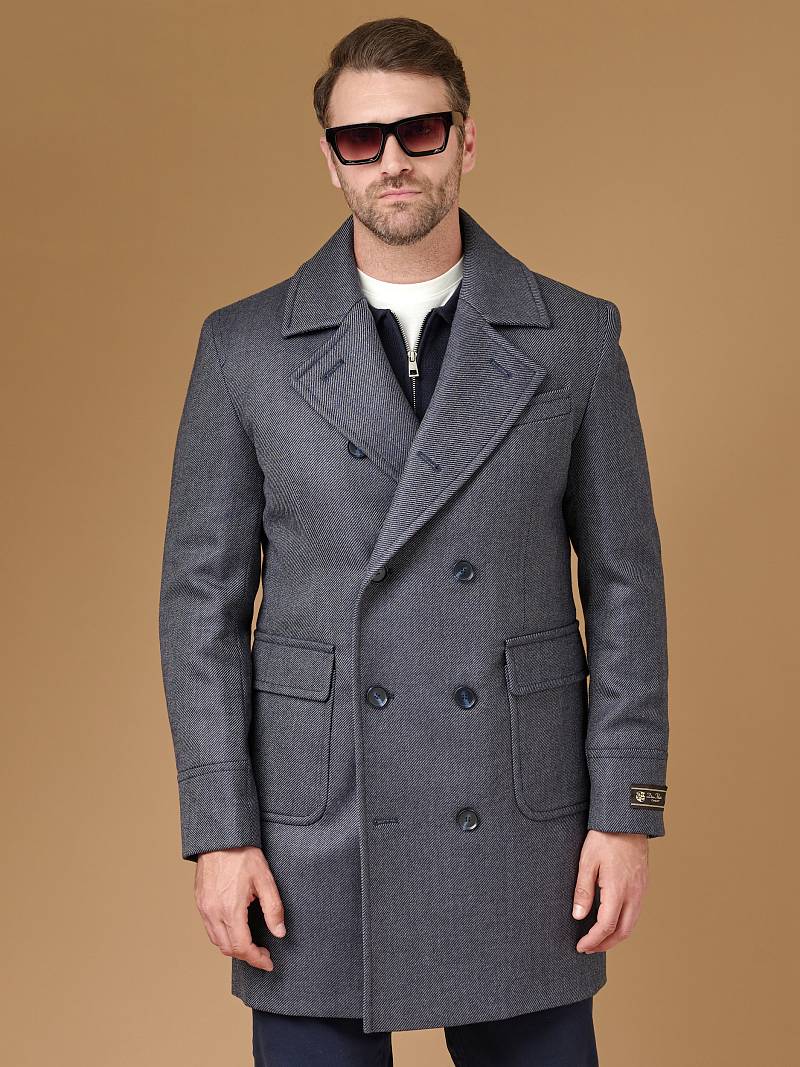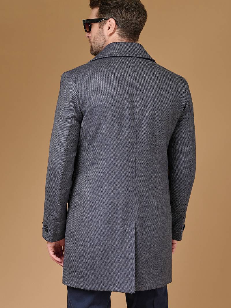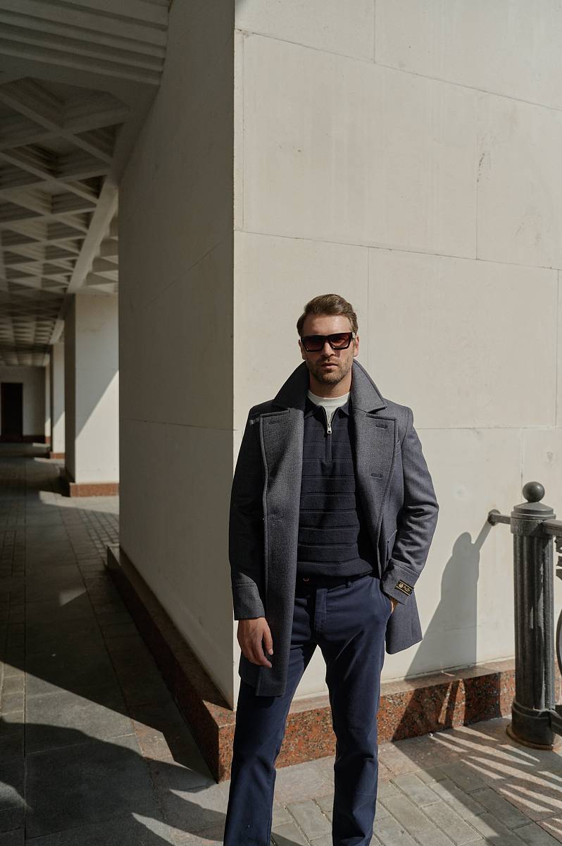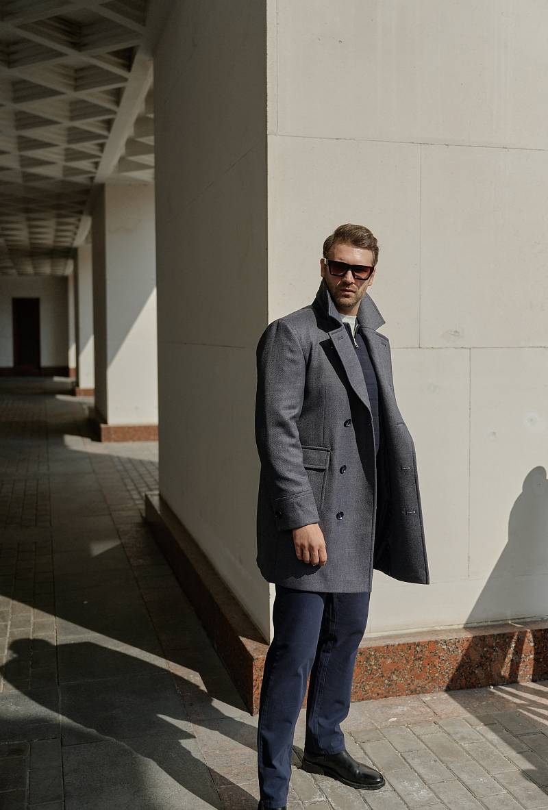 Classic Fit (ПОЛУПРИЛЕГАЮЩИЙ СИЛУЭТ). Классическое двубортное утепленное пальто с застежкой на пуговицы, с нагрудным карманом листочкой и двумя боковыми накладными карманами с клапанами. Рукав втачной, двухшовный, внизу рукава притачной манжет с декоративной пуговицей. По спинке расположена одна шлица. Отделочная сторочка проходит по краю борта, воротнику, лацкану, боковым карманам и среднему шву спинки. На подкладке расположены два внутренних кармана. Утеплитель-Термоплюс 100гр.