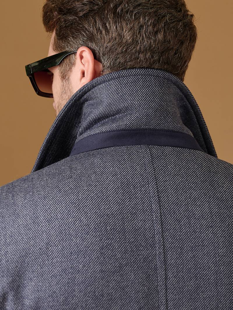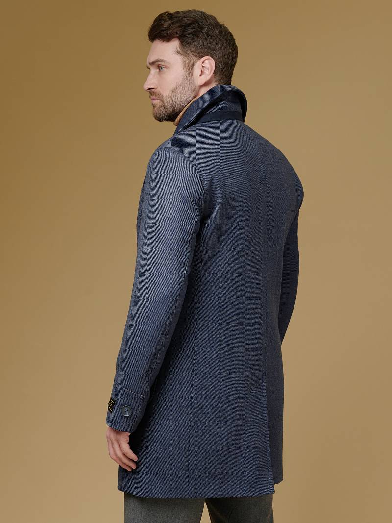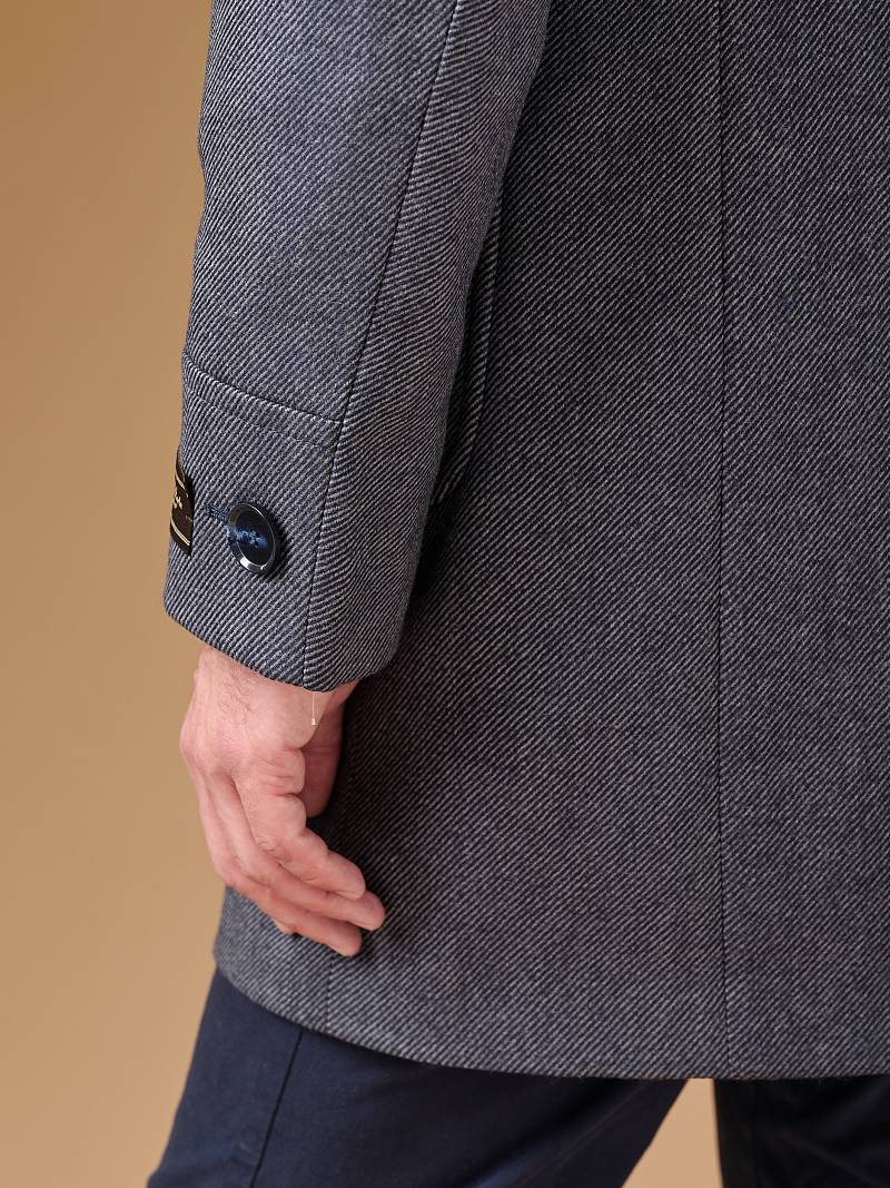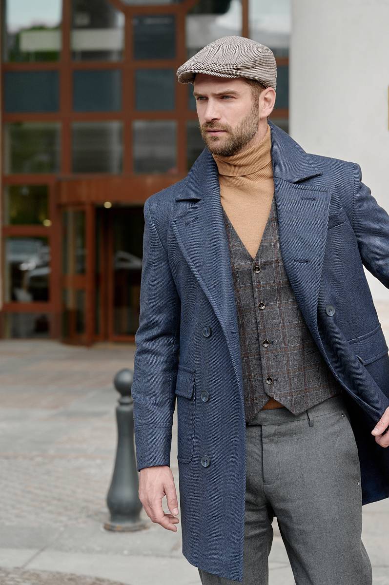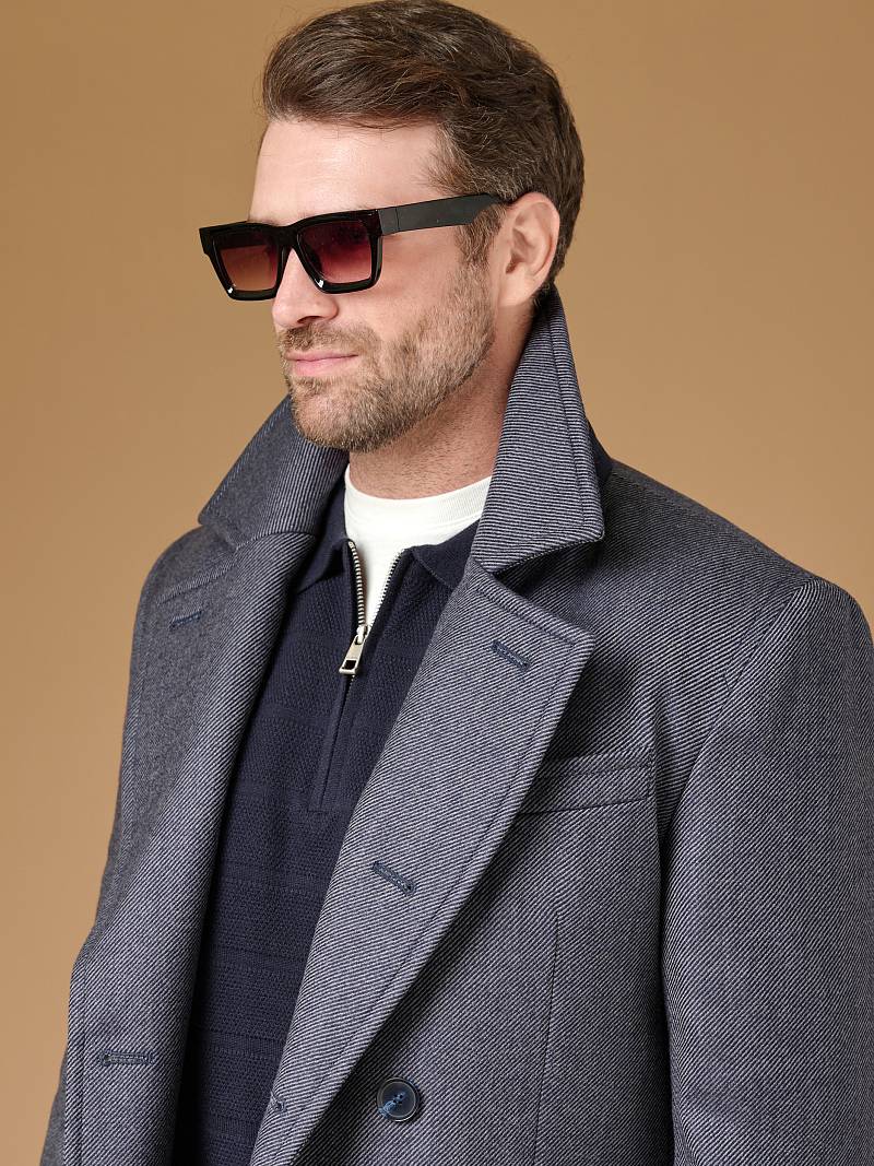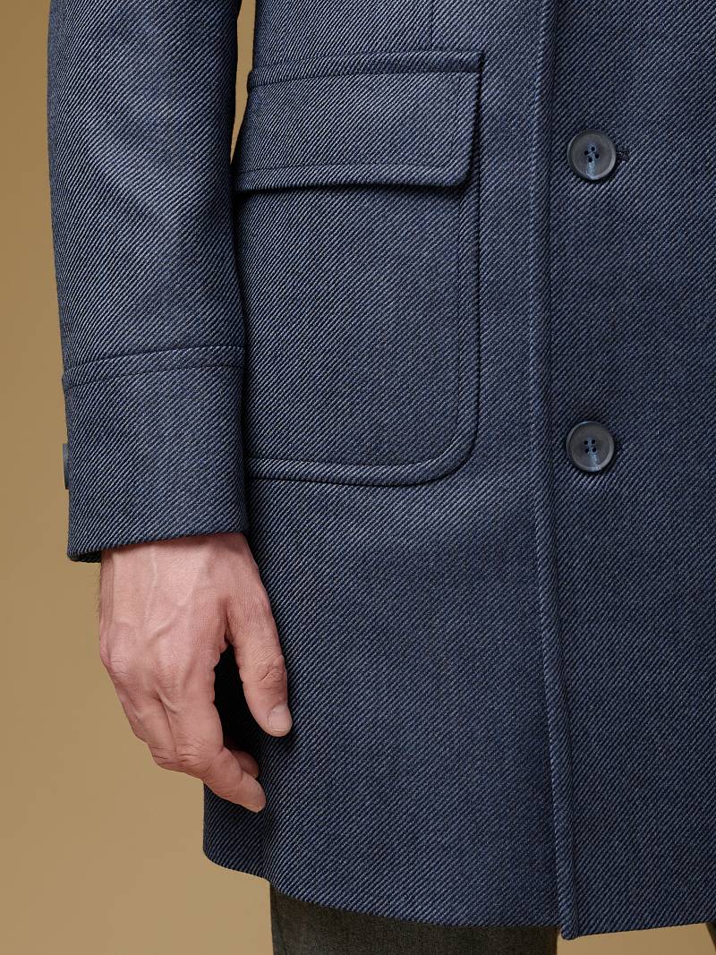 Classic Fit (ПОЛУПРИЛЕГАЮЩИЙ СИЛУЭТ). Классическое двубортное утепленное пальто с застежкой на пуговицы, с нагрудным карманом листочкой и двумя боковыми накладными карманами с клапанами. Рукав втачной, двухшовный, внизу рукава притачной манжет с декоративной пуговицей. По спинке расположена одна шлица. Отделочная сторочка проходит по краю борта, воротнику, лацкану, боковым карманам и среднему шву спинки. На подкладке расположены два внутренних кармана. Утеплитель-Термоплюс 100гр.