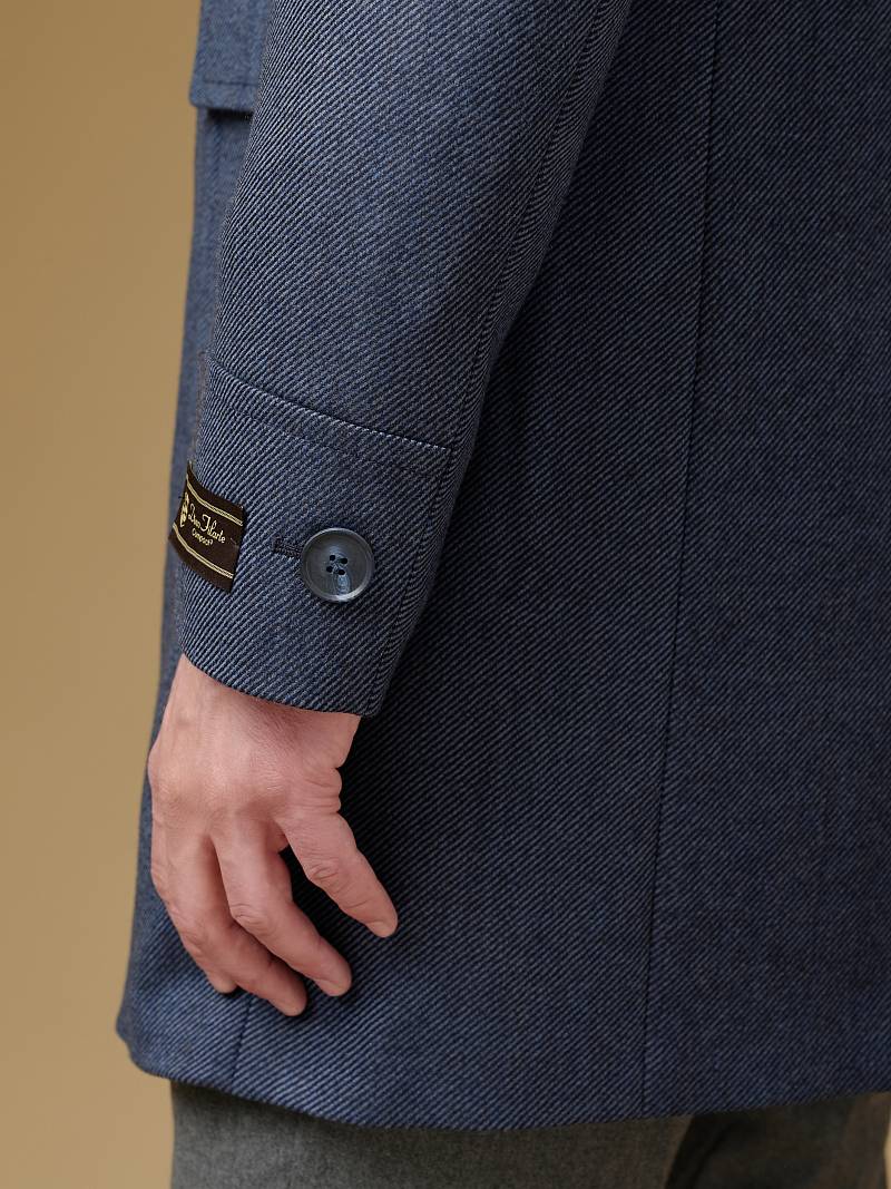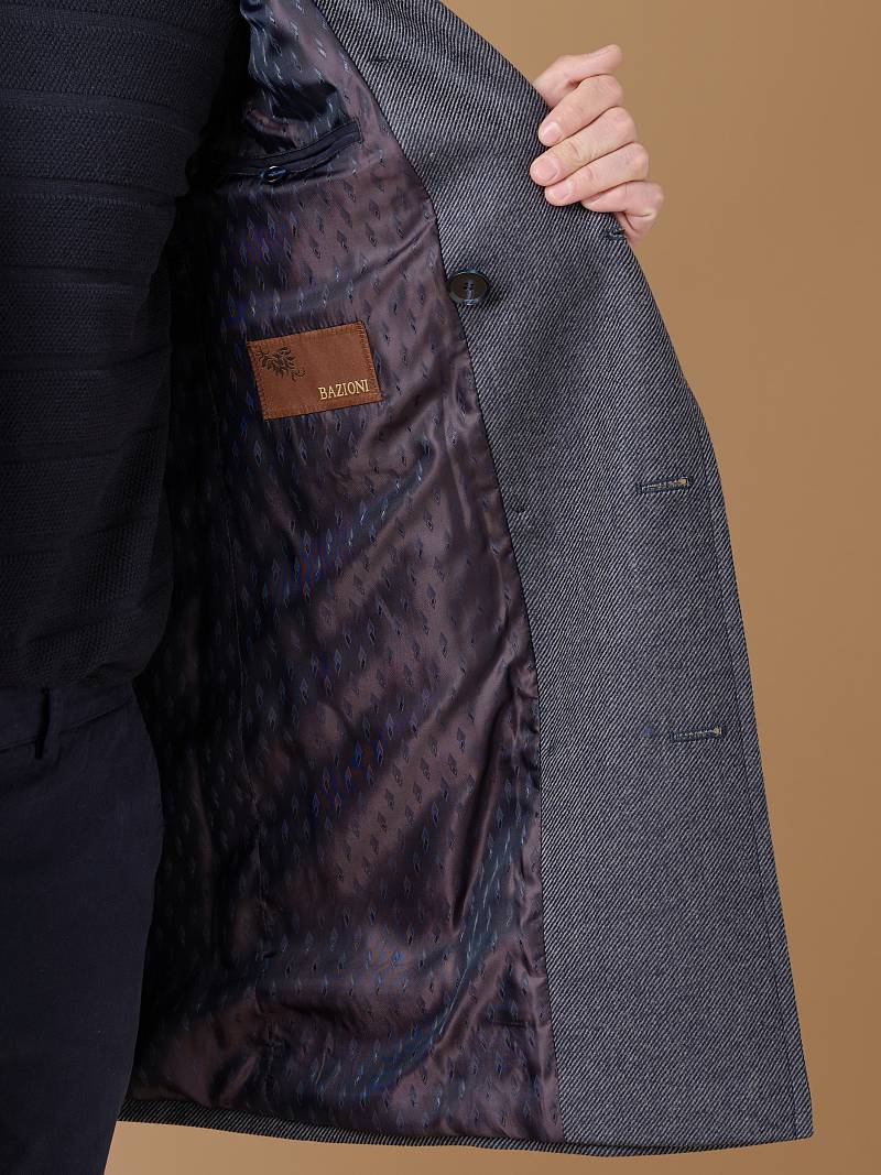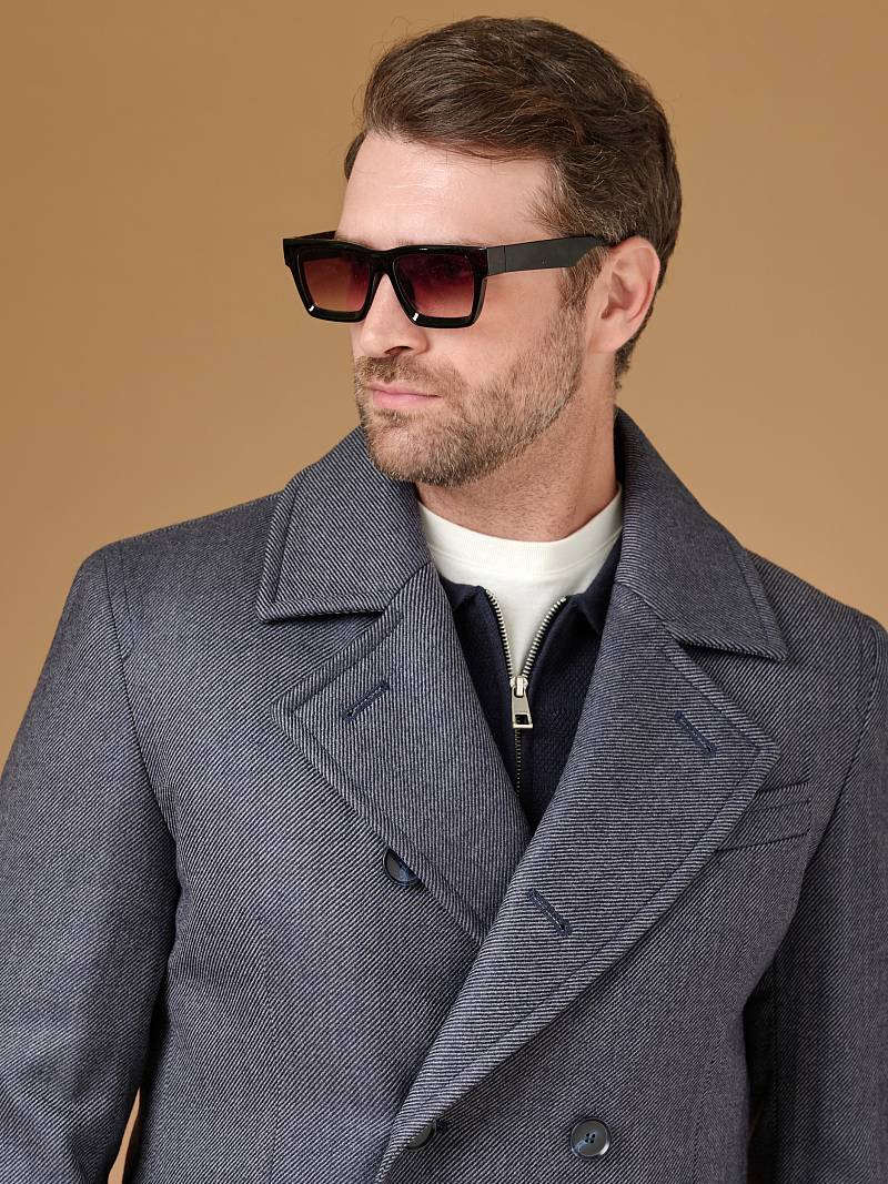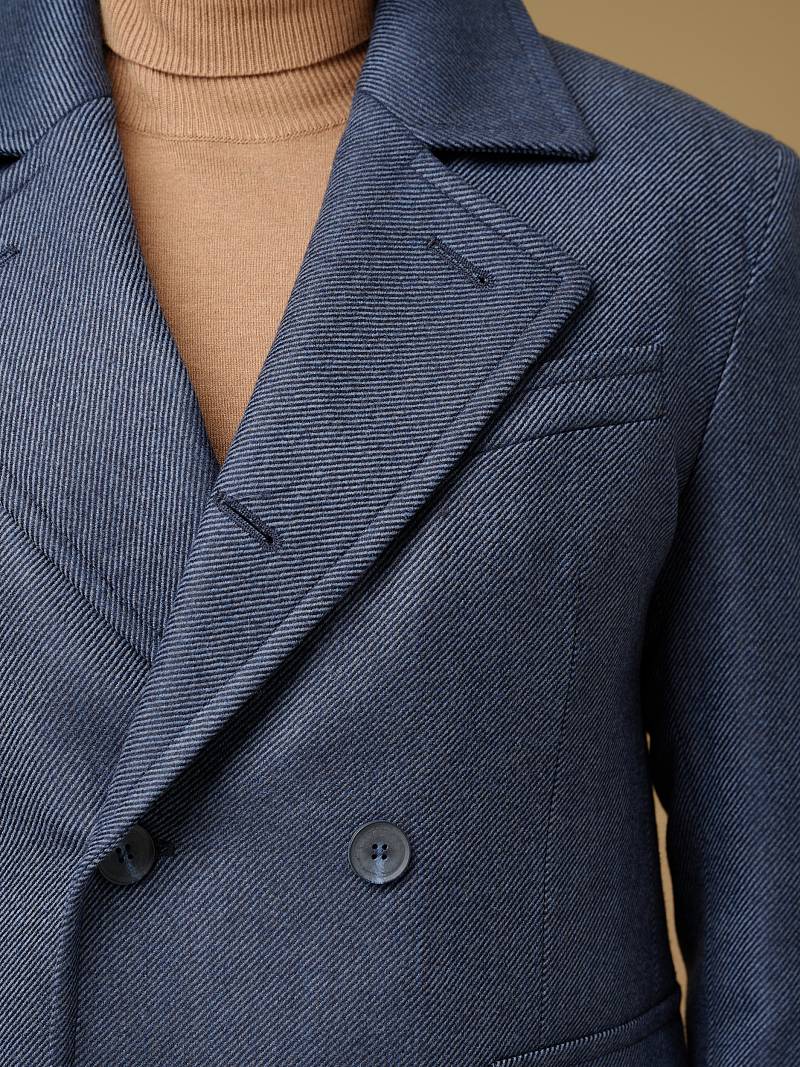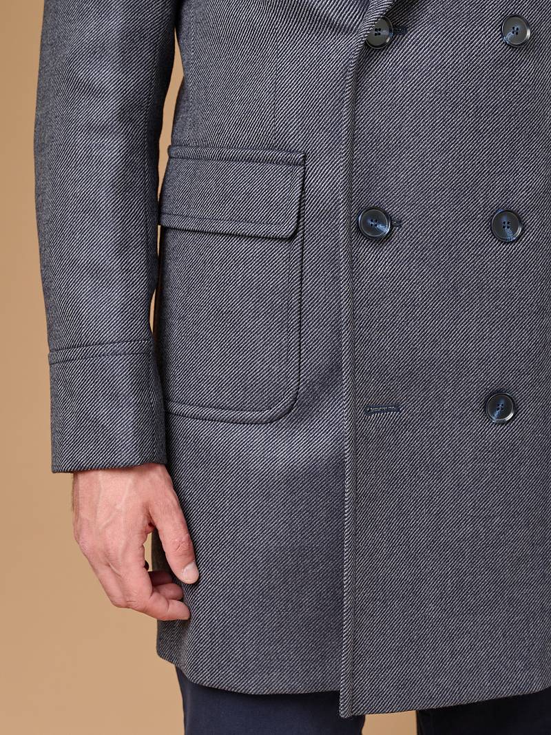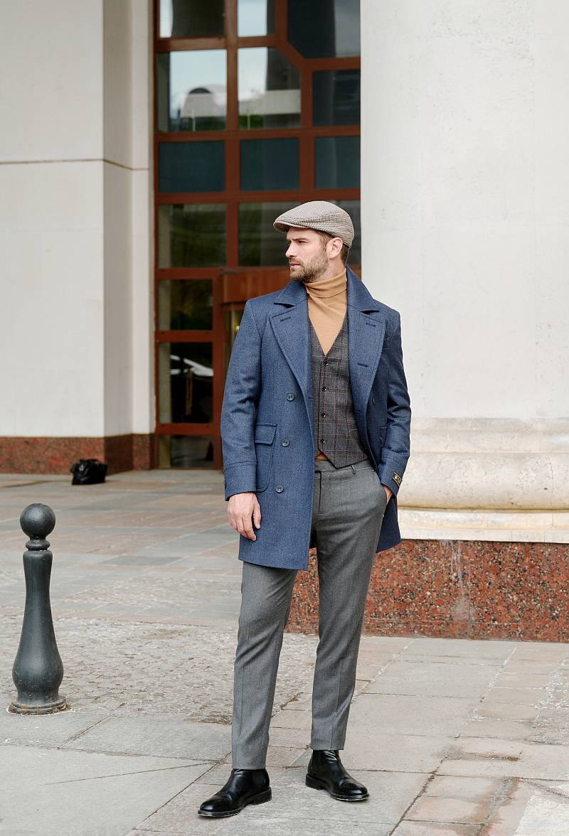 Classic Fit (ПОЛУПРИЛЕГАЮЩИЙ СИЛУЭТ). Классическое двубортное утепленное пальто с застежкой на пуговицы, с нагрудным карманом листочкой и двумя боковыми накладными карманами с клапанами. Рукав втачной, двухшовный, внизу рукава притачной манжет с декоративной пуговицей. По спинке расположена одна шлица. Отделочная сторочка проходит по краю борта, воротнику, лацкану, боковым карманам и среднему шву спинки. На подкладке расположены два внутренних кармана. Утеплитель-Термоплюс 100гр.