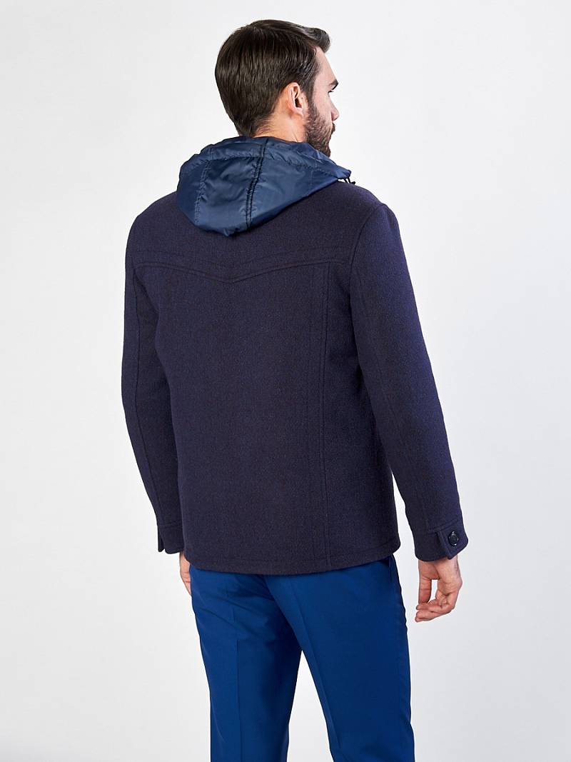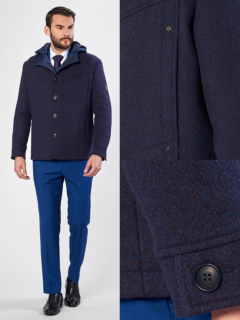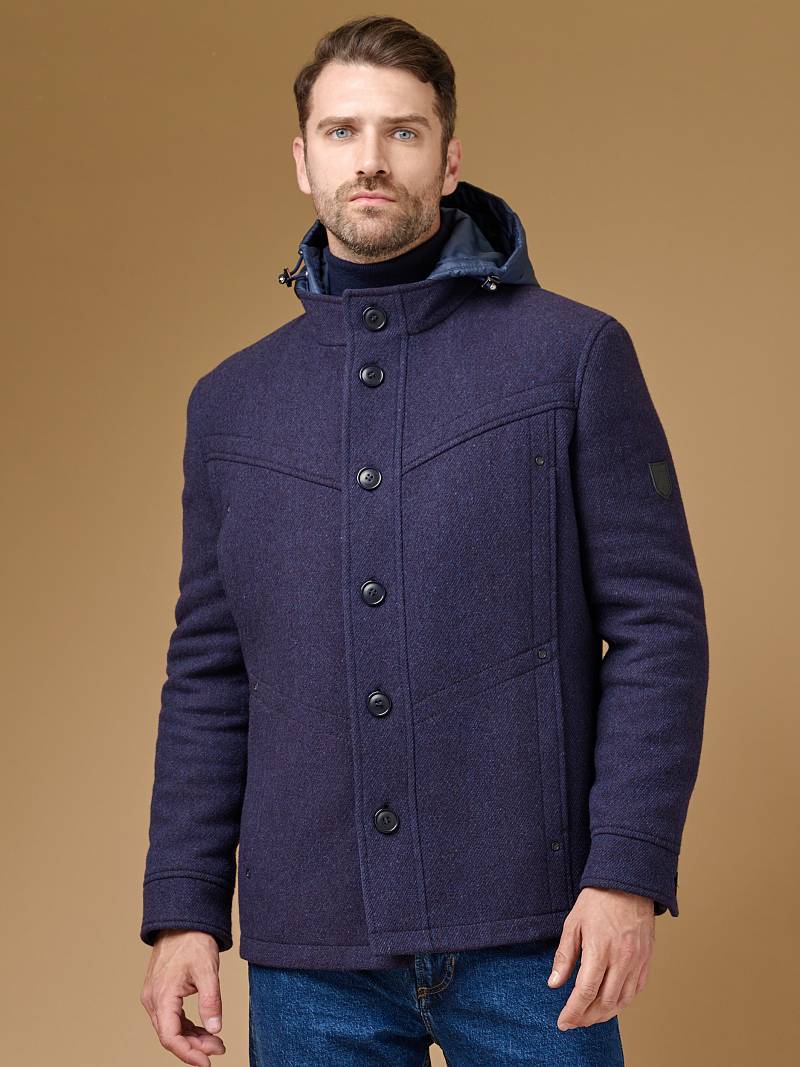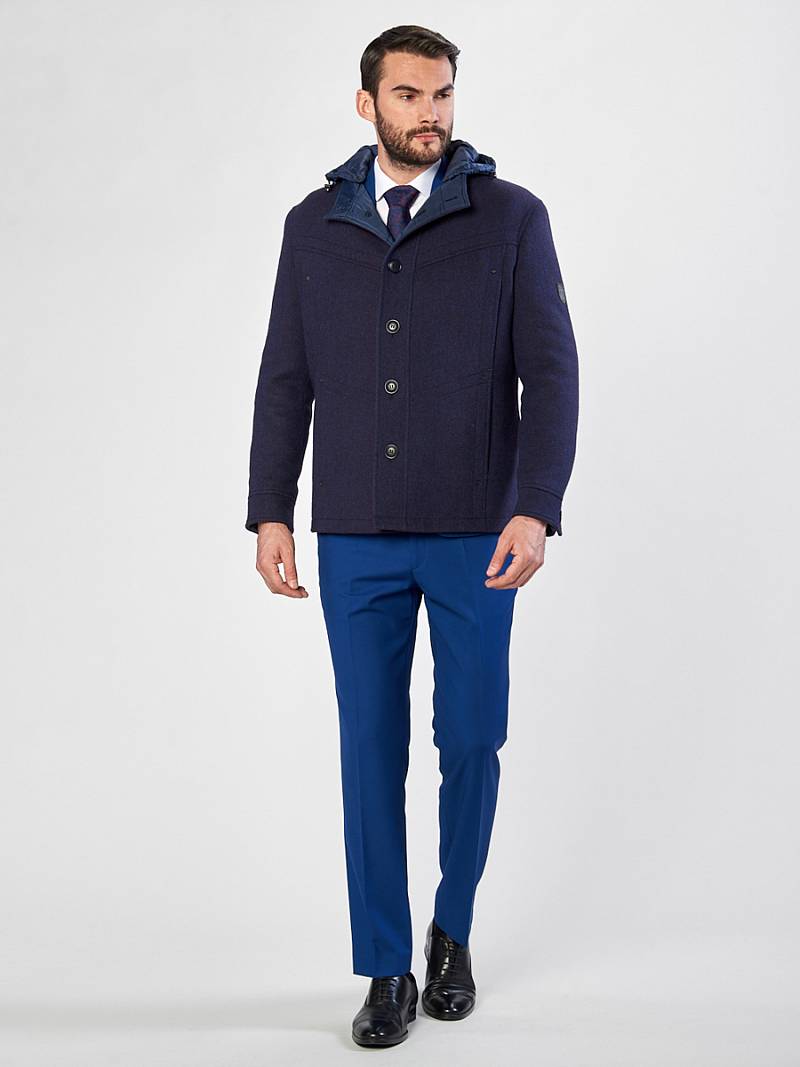 Пальто мужское укороченное с застежкой на пуговицы и с отстегивающимся капюшоном из отделки. Полочка и спинка с фигурными кокетками и рельефами. В рельефе полочек - верхние и нижние карманы на магнитах, рельеф полочек украшен декоративными хольнитенами. Рукава втачные двушовные с притачными манжетами по низу на пуговицу. Длина изделия по спинке для роста 176 - 74см. Ткань верха: 100% шерсть. Подкладка: 50% вискоза, 50% полиэстер. Термоплюс 80гр