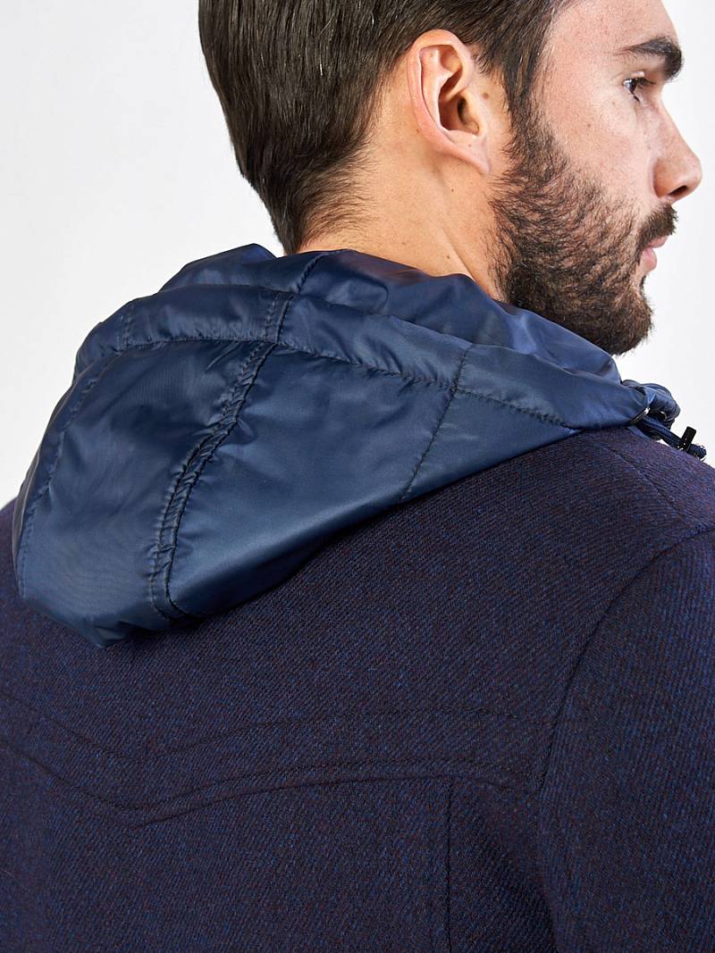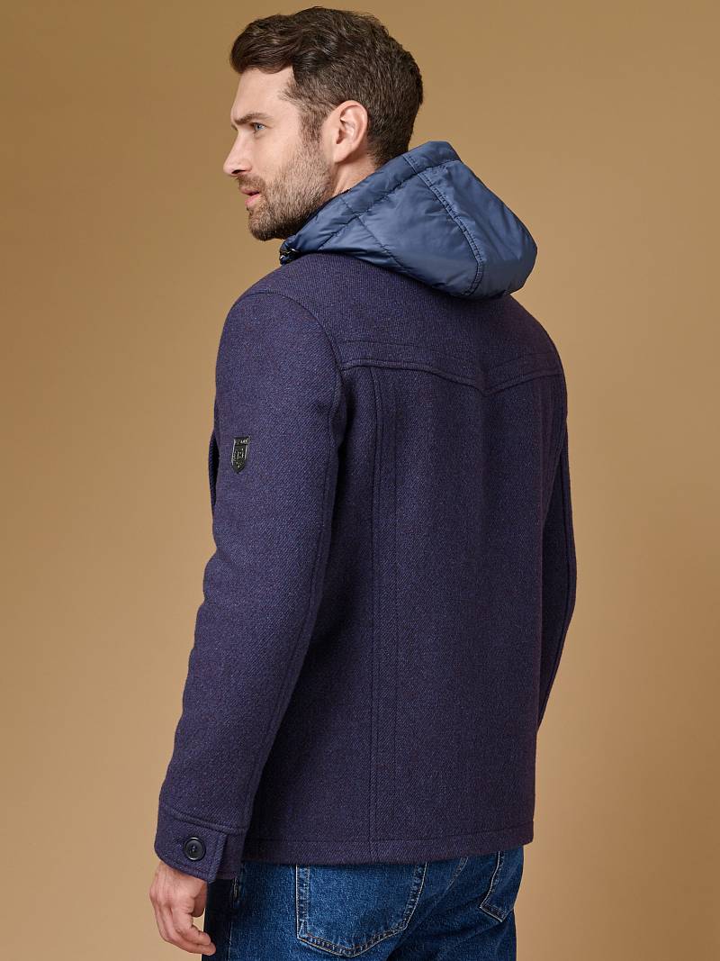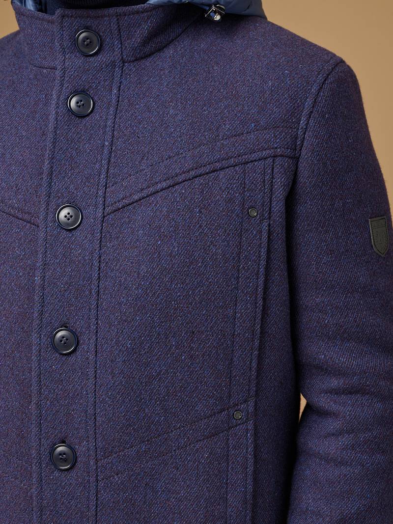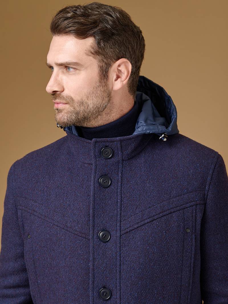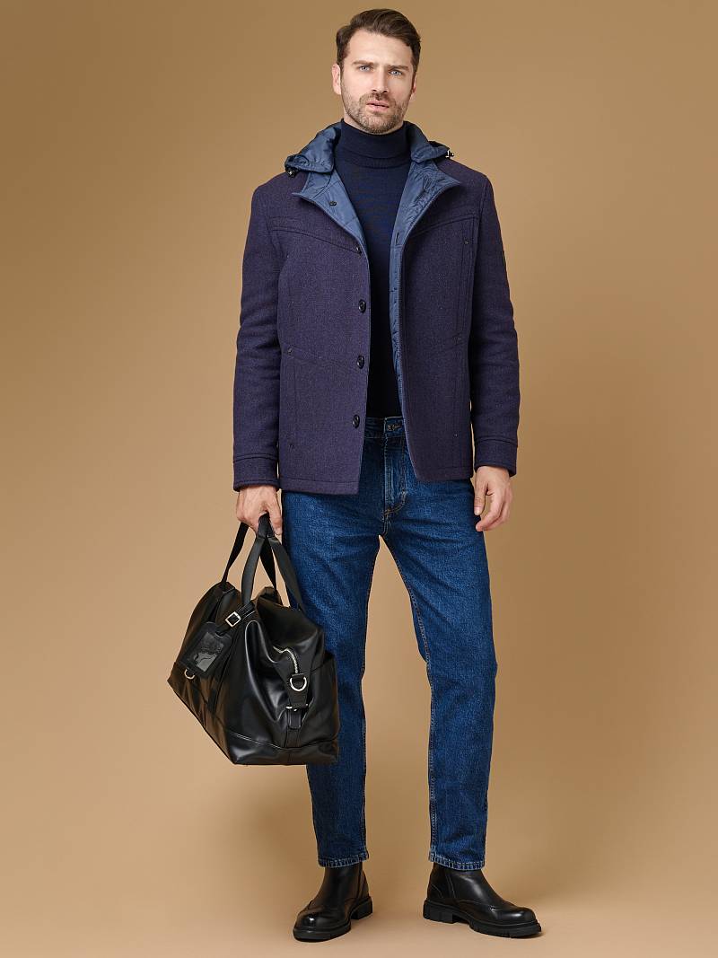 Пальто мужское укороченное с застежкой на пуговицы и с отстегивающимся капюшоном из отделки. Полочка и спинка с фигурными кокетками и рельефами. В рельефе полочек - верхние и нижние карманы на магнитах, рельеф полочек украшен декоративными хольнитенами. Рукава втачные двушовные с притачными манжетами по низу на пуговицу. Длина изделия по спинке для роста 176 - 74см. Ткань верха: 100% шерсть. Подкладка: 50% вискоза, 50% полиэстер. Термоплюс 80гр