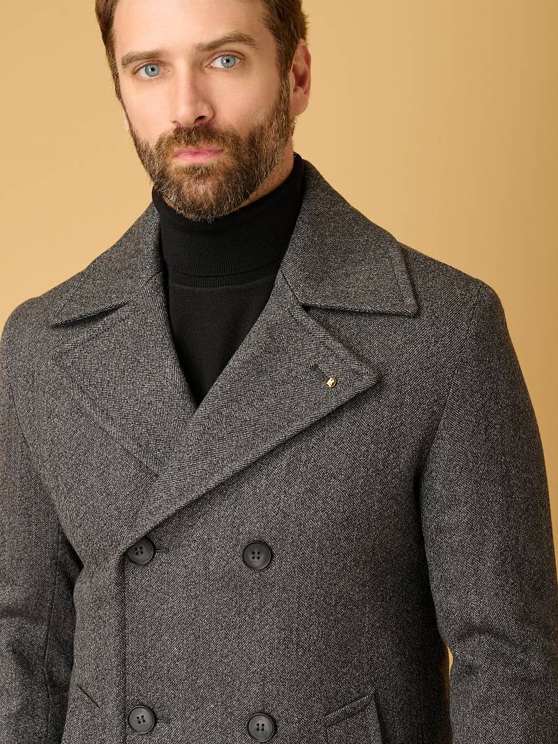 Slim Fit (ПРИТАЛЕННЫЙ СИЛУЭТ). Бушлат двубортный утепленный с застежкой на пуговицы, с двумя наклонными боковыми карманами "листочка". По спинке расположена одна шлица. Внутри на подкладке расположены два внутренних кармана. Отделочная сторочка проходит по краю борта, воротнику и лацкану. Термоплюс 100 гр.