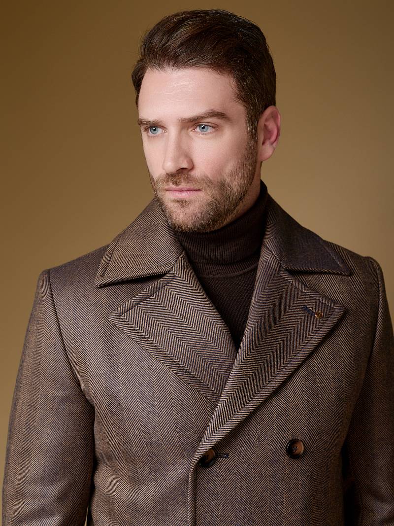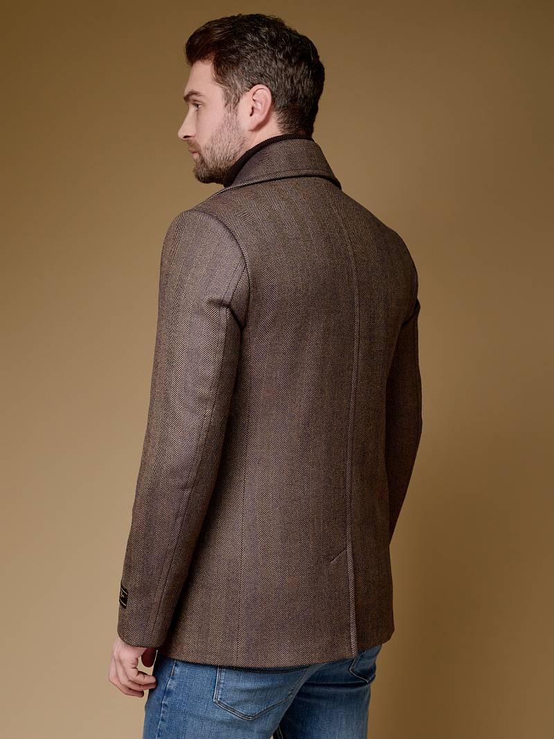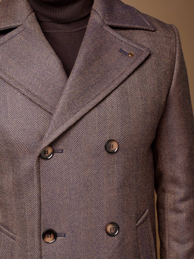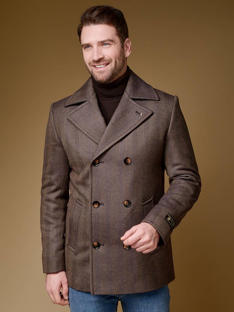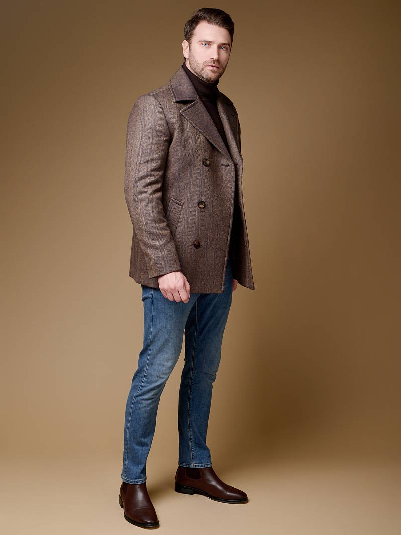 Slim Fit (ПРИТАЛЕННЫЙ СИЛУЭТ). Бушлат двубортный утепленный с застежкой на пуговицы, с двумя наклонными боковыми карманами "листочка". По спинке расположена одна шлица. Внутри на подкладке расположены два внутренних кармана. Отделочная сторочка проходит по краю борта, воротнику и лацкану. Термоплюс 100 гр.