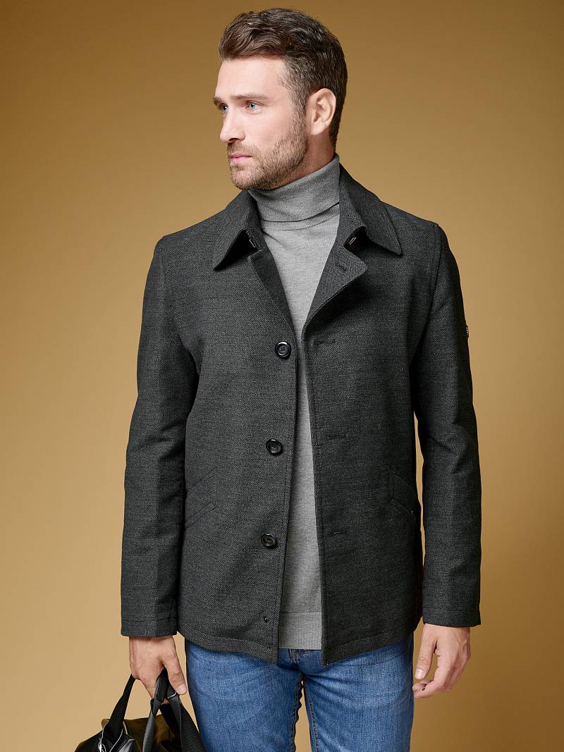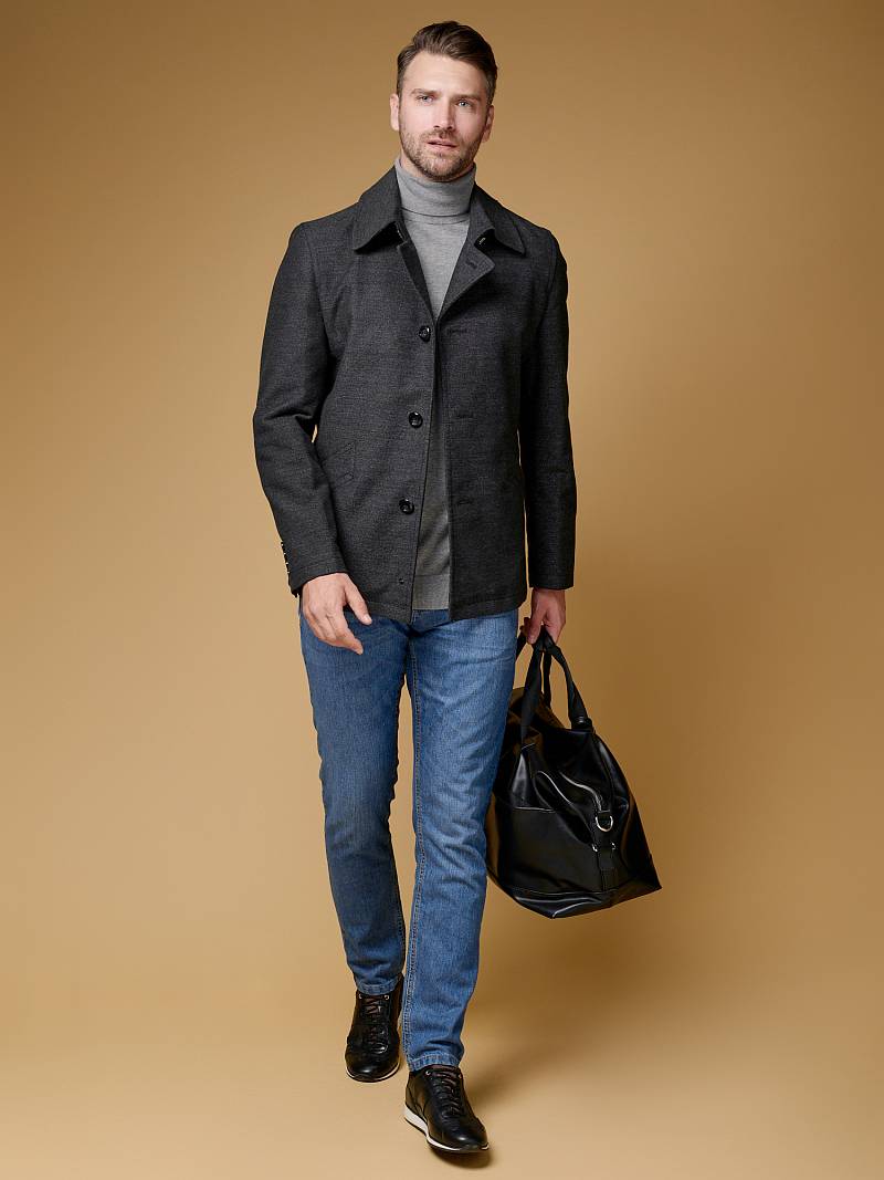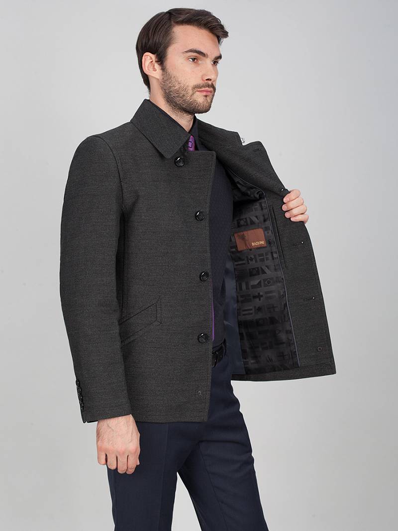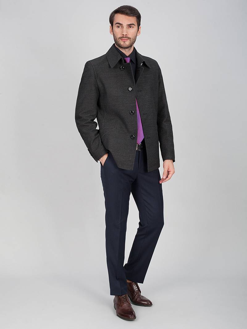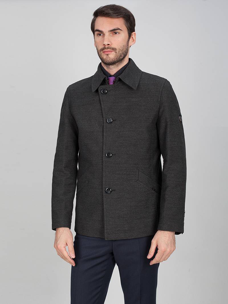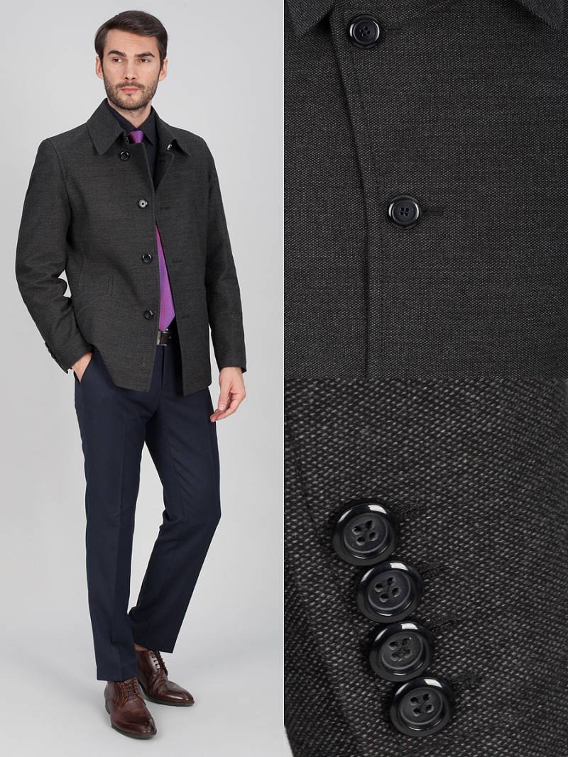 Укороченное мужское пальто с центральной застежкой на 3пуговицы. с отрезными боковыми частями. Кокетка спинки, шлица в среднем шве спинки, воротник-отложной со стойкой, рукав втачной, в нижней части со шлицей, боковой карман-листочка с втачными концами.