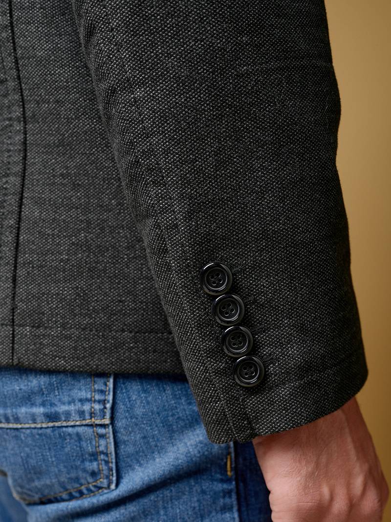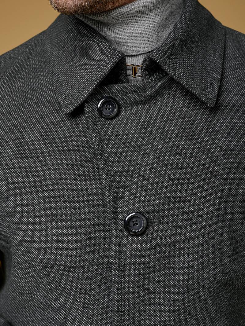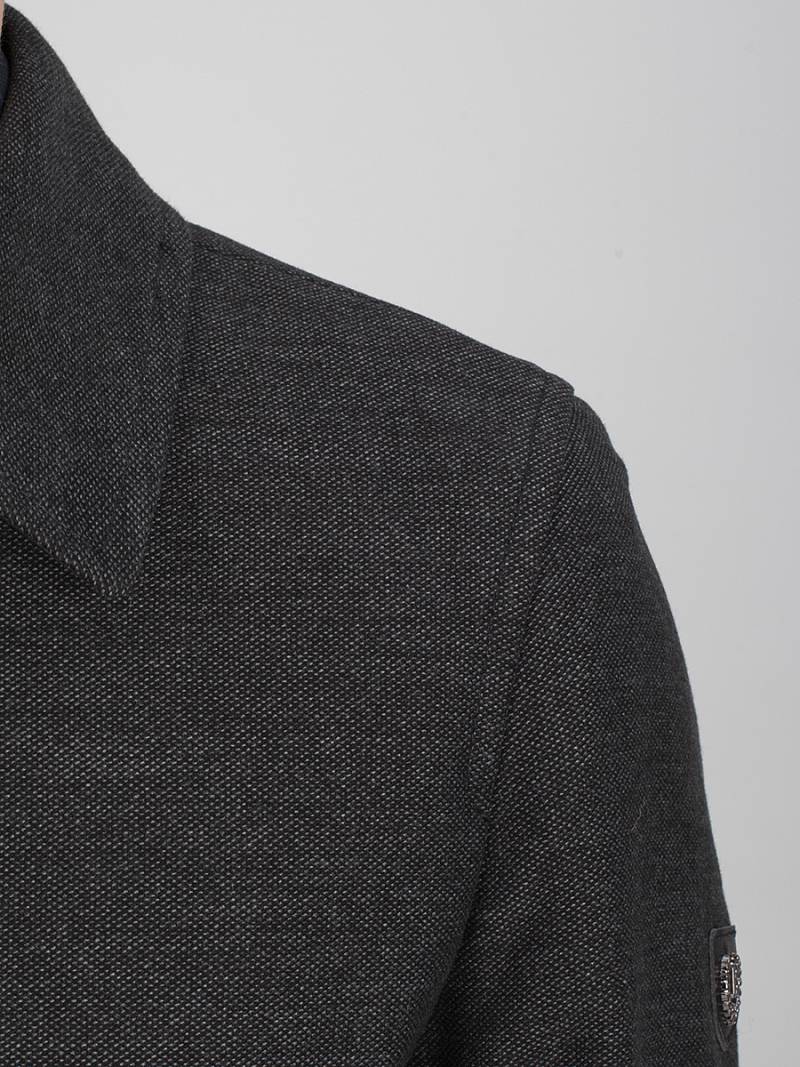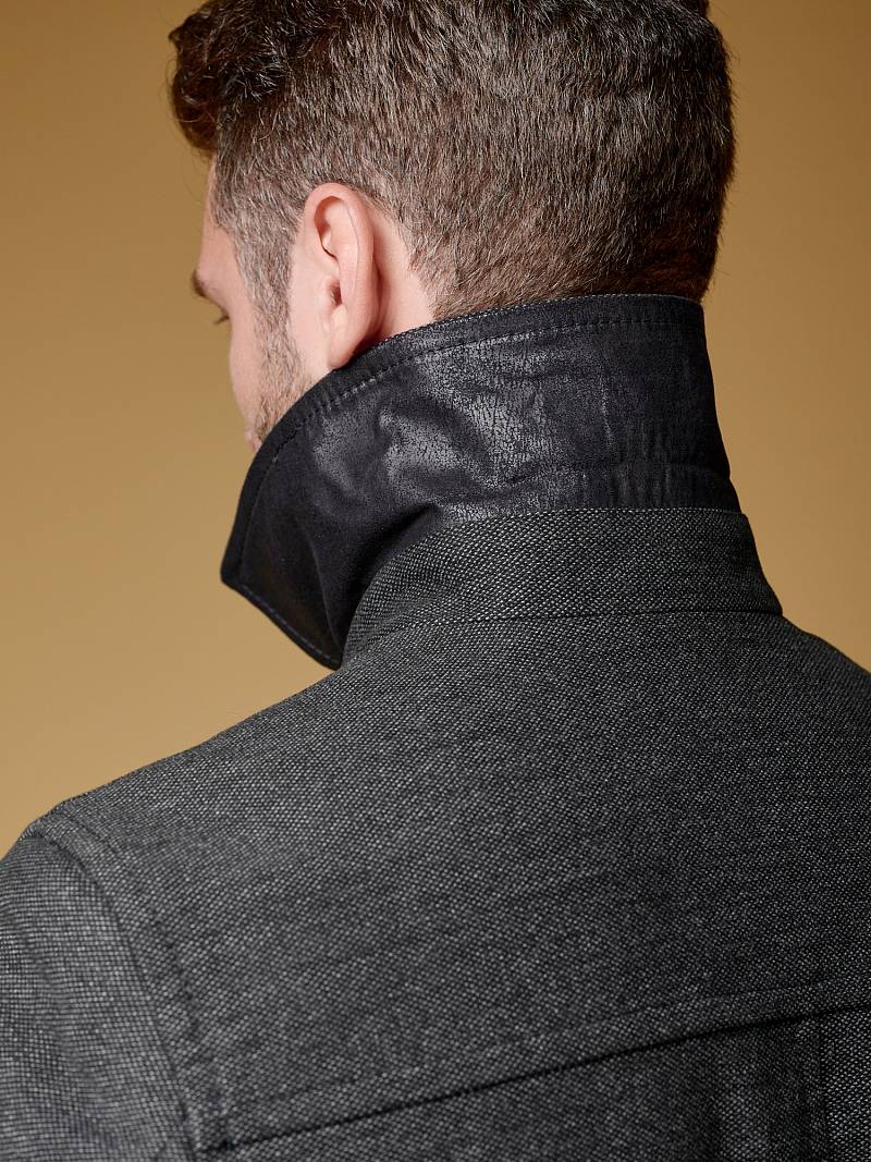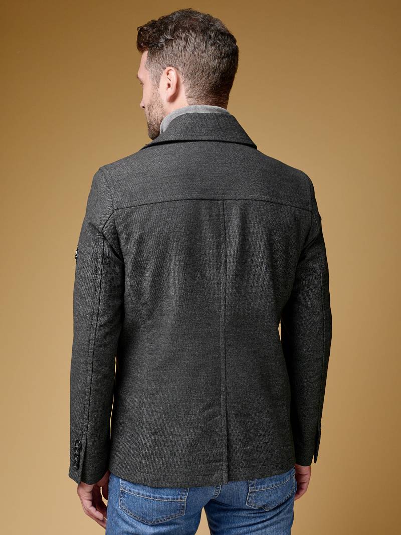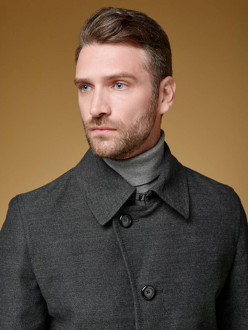 Укороченное мужское пальто с центральной застежкой на 3пуговицы. с отрезными боковыми частями. Кокетка спинки, шлица в среднем шве спинки, воротник-отложной со стойкой, рукав втачной, в нижней части со шлицей, боковой карман-листочка с втачными концами.
