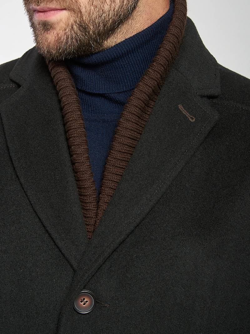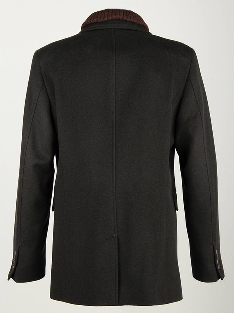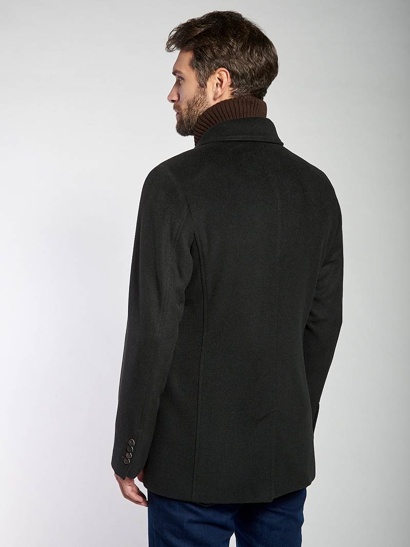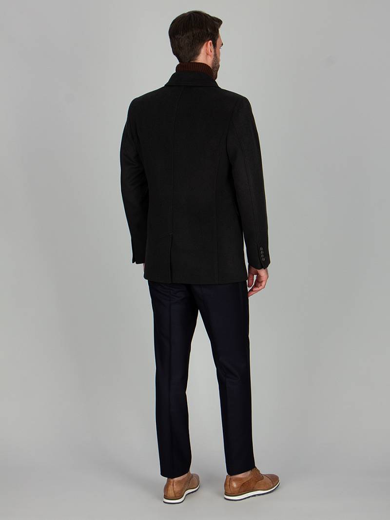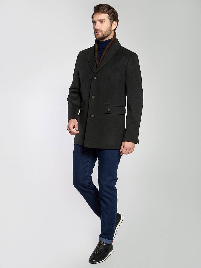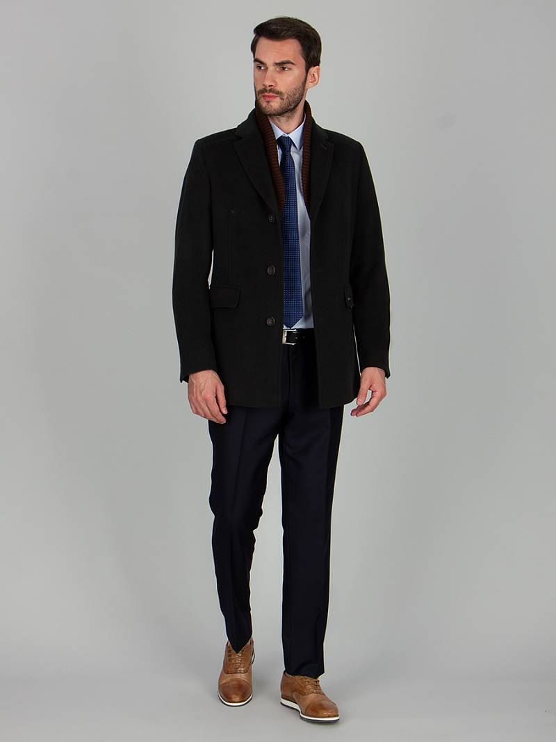 Пальто мужское, центральная застёжка на 3 пуговицы, Воротник английский +воротник трикотажный отстегивается на молнии, боковые карманы с клапаном, рукав втачной, спинка со средним швом, одна шлица. На подкладке два внутренних кармана на пуговицах. Длина изделия по спинке для роста 176 - 82см. Ткань верха: 100%шерсть. Подкладка: 50%вискоза 50%полиэстер.