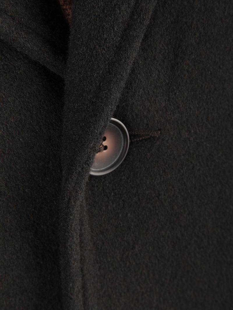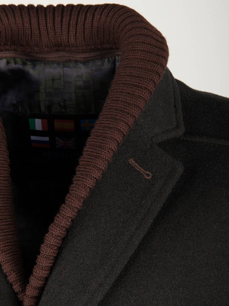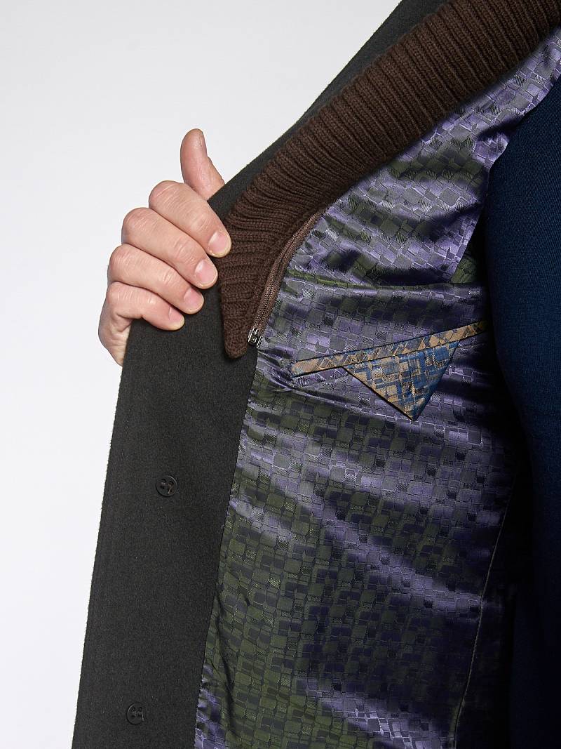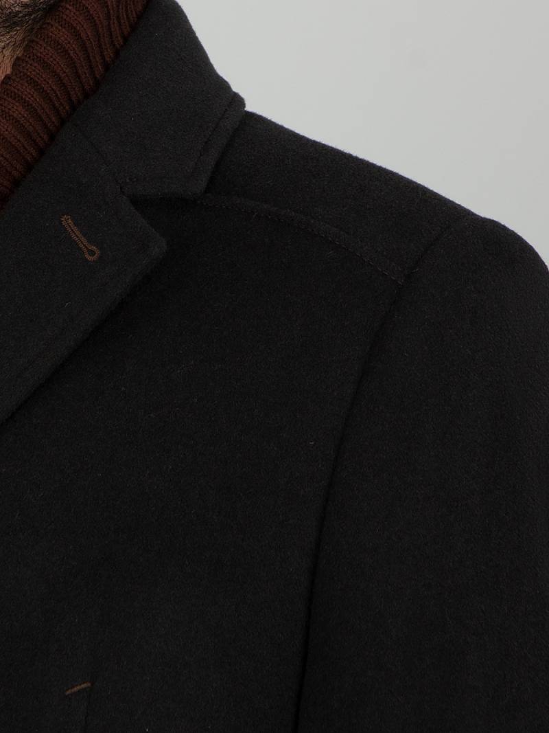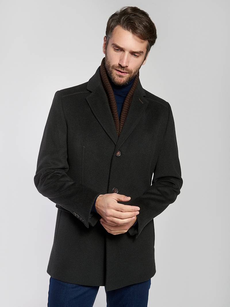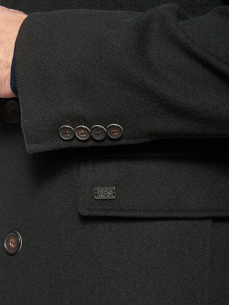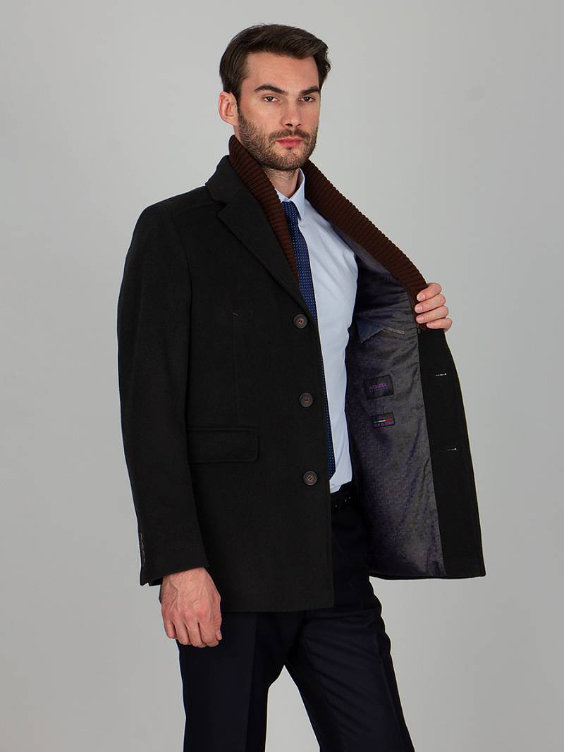Пальто мужское, центральная застёжка на 3 пуговицы, Воротник английский +воротник трикотажный отстегивается на молнии, боковые карманы с клапаном, рукав втачной, спинка со средним швом, одна шлица. На подкладке два внутренних кармана на пуговицах. Длина изделия по спинке для роста 176 - 82см. Ткань верха: 100%шерсть. Подкладка: 50%вискоза 50%полиэстер.