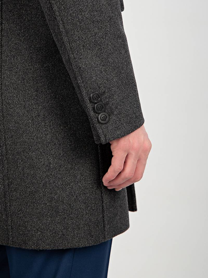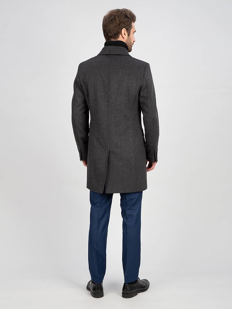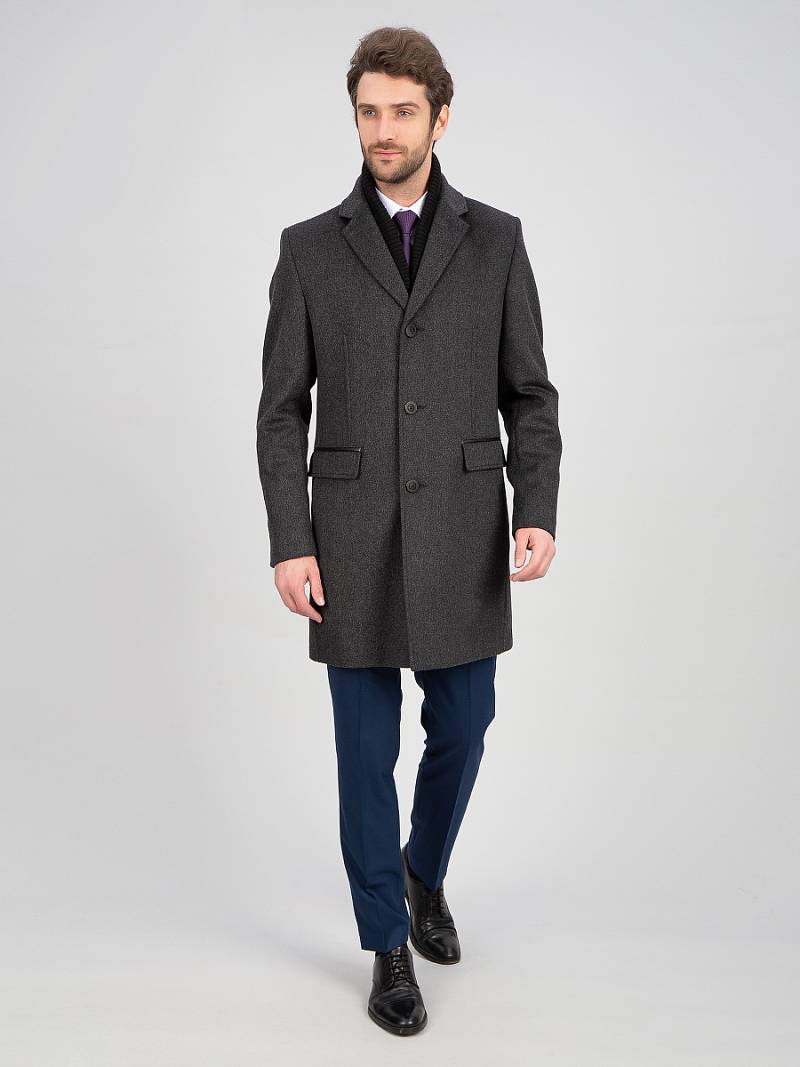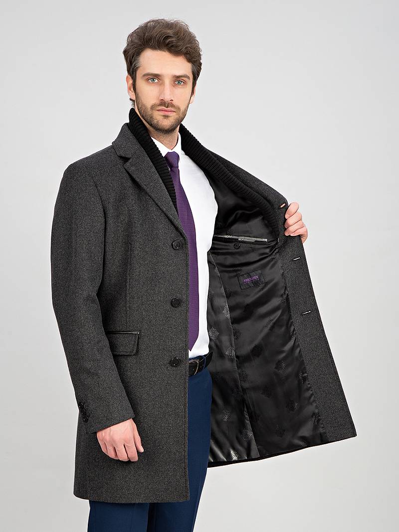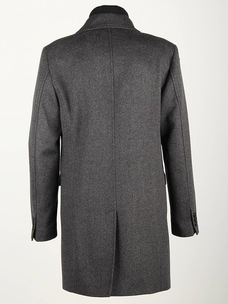 Пальто мужское, Центральная застёжка на 3 пуговицы, Воротник английский + воротник трикотажный остёгивающийся, Карманы "в рамку" с клапаном + Карманы в рельефе , Спинка со средним швом и одной шлицей, Рукава втачные с локтевым швом, по низу рукавов шлица и 4 пуговицы. На подкладке два кармана "в рамку" на пуговицах.