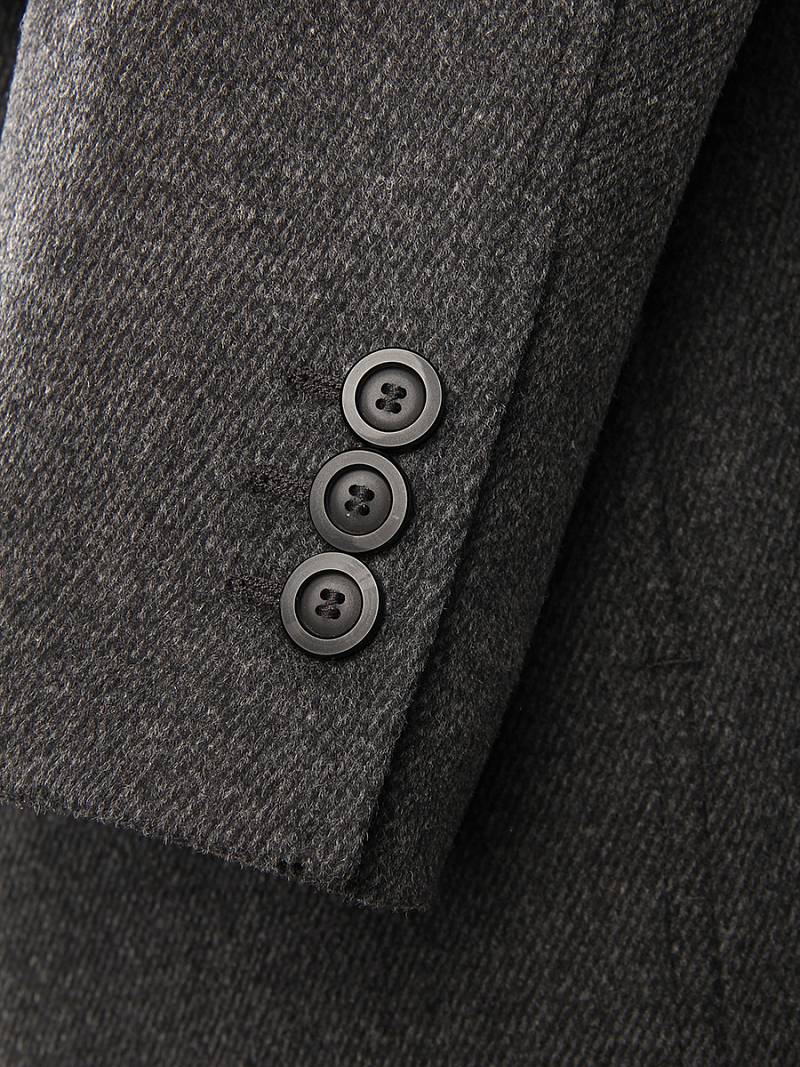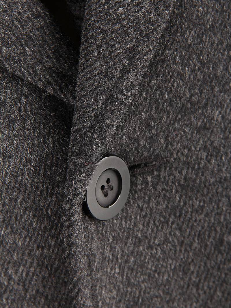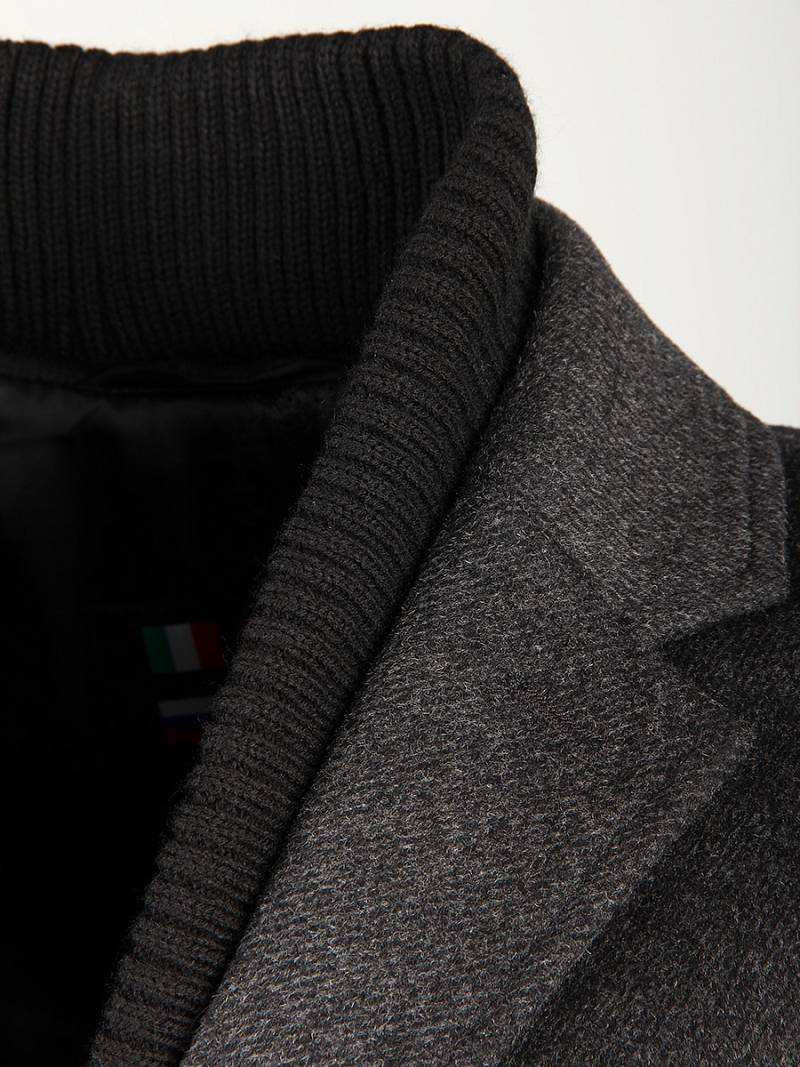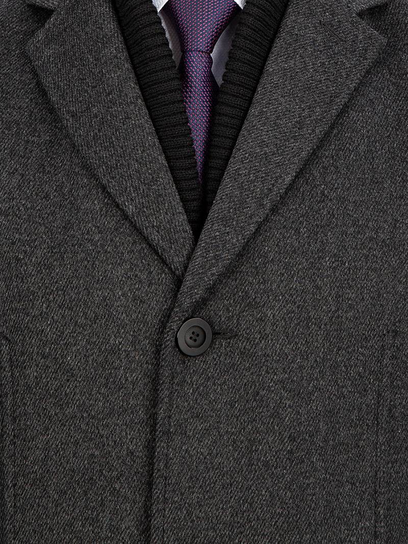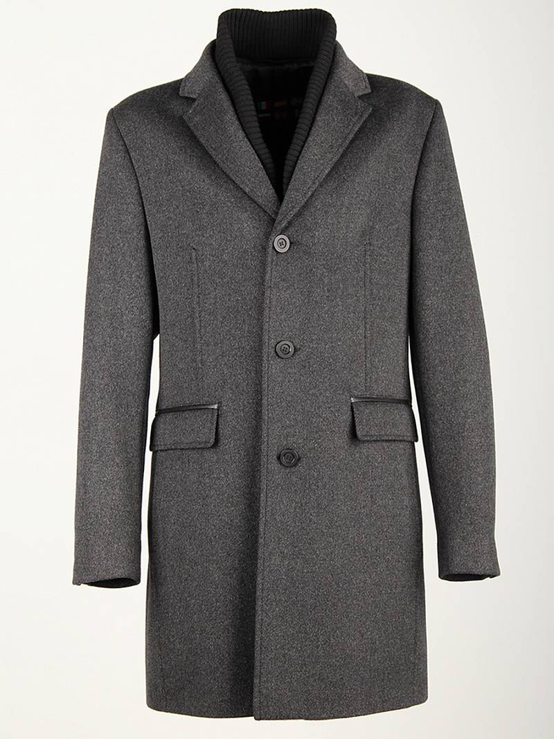 Пальто мужское, Центральная застёжка на 3 пуговицы, Воротник английский + воротник трикотажный остёгивающийся, Карманы "в рамку" с клапаном + Карманы в рельефе , Спинка со средним швом и одной шлицей, Рукава втачные с локтевым швом, по низу рукавов шлица и 4 пуговицы. На подкладке два кармана "в рамку" на пуговицах.