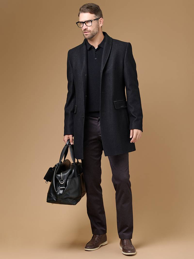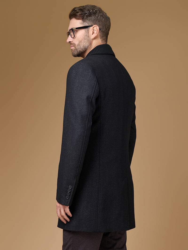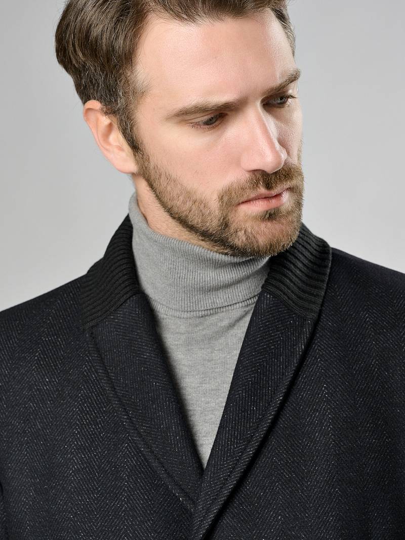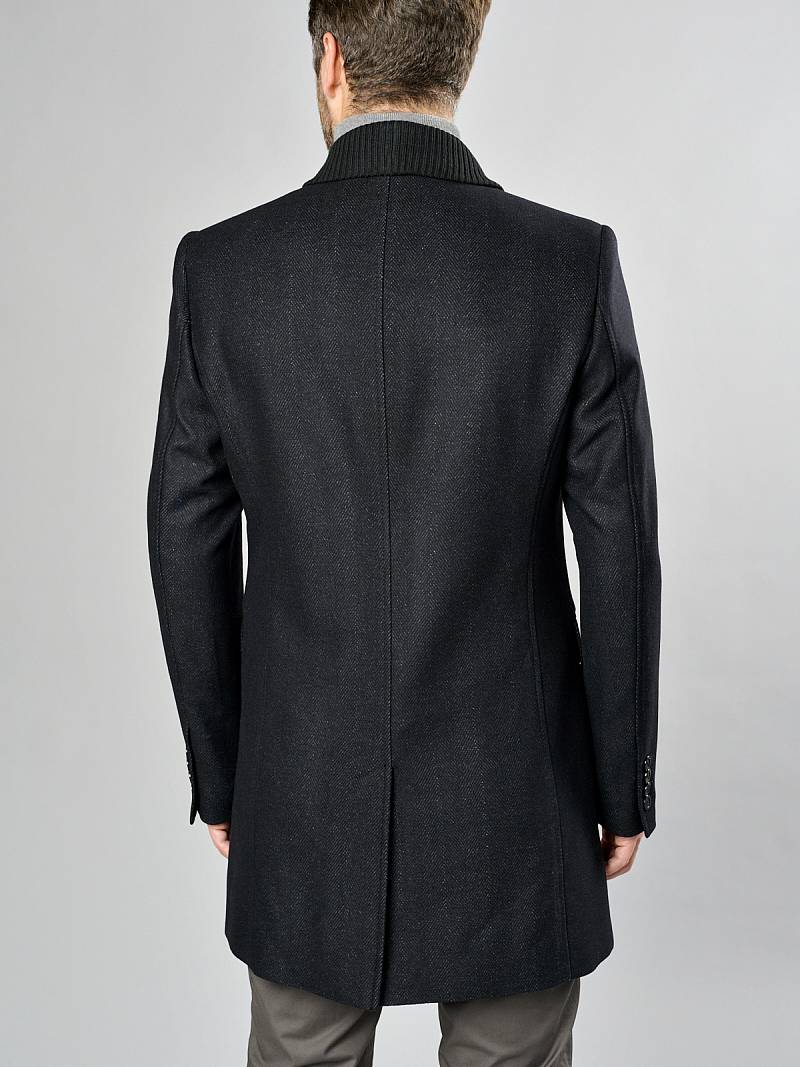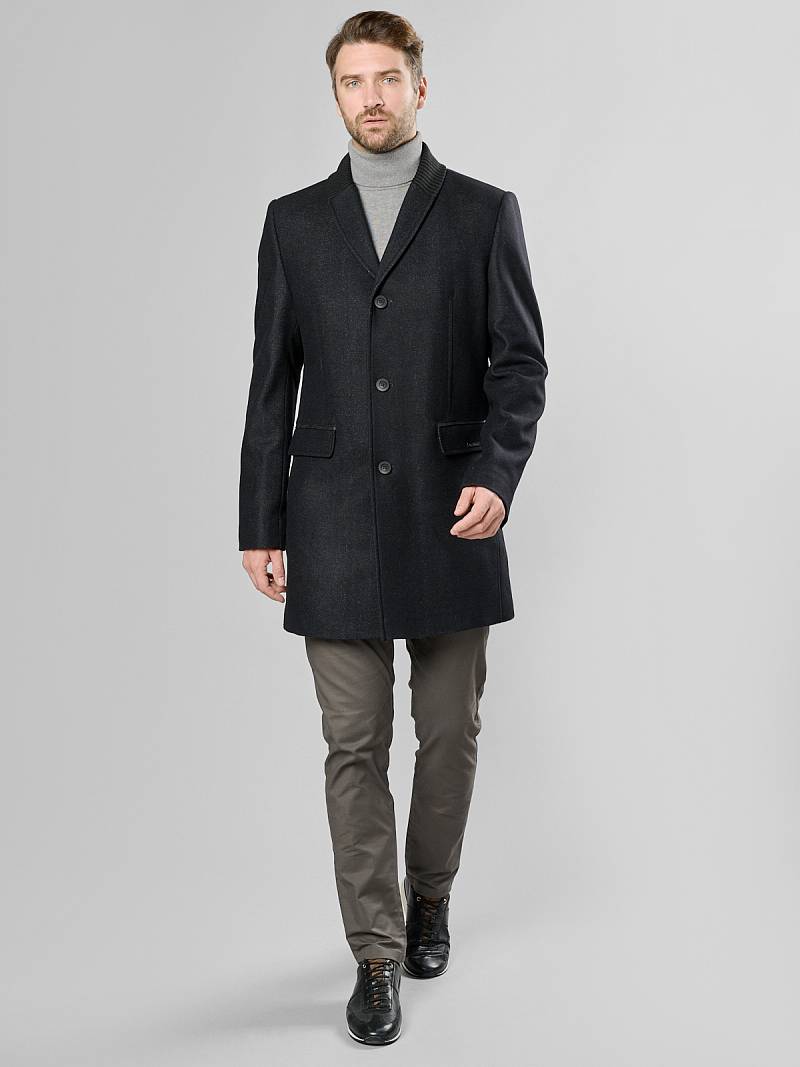 Пальто мужское, застёжка на 3 пуговицы, Воротник английский +трикотажный, карманы с клапаном, одна шлица.