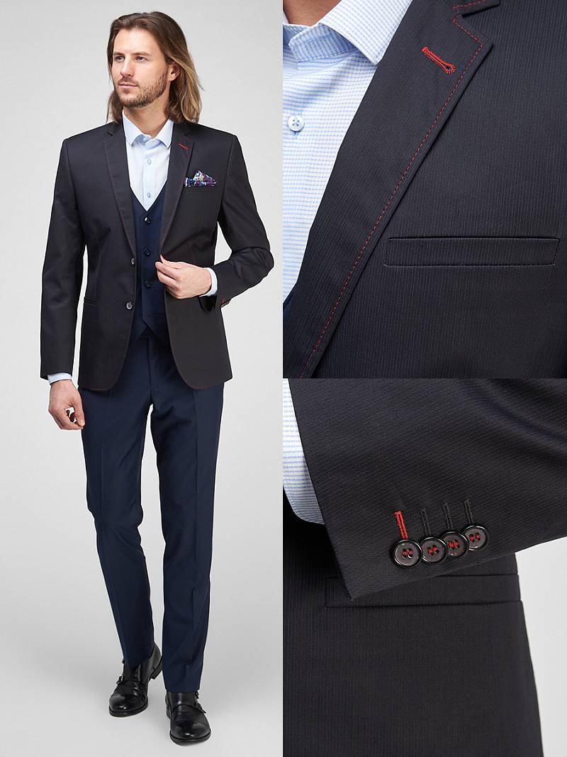 Slim fit, Классический мужской пиджак на две пуговицы, с боковыми и нагрудным карманами, по спинке одна шлица, отлелочная строчка нитками в контраст по воротнику, лацкану и борту.