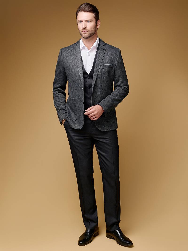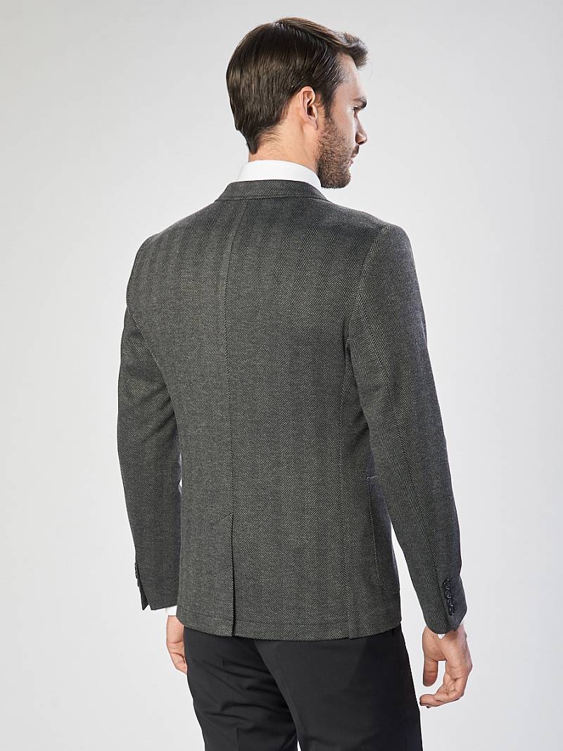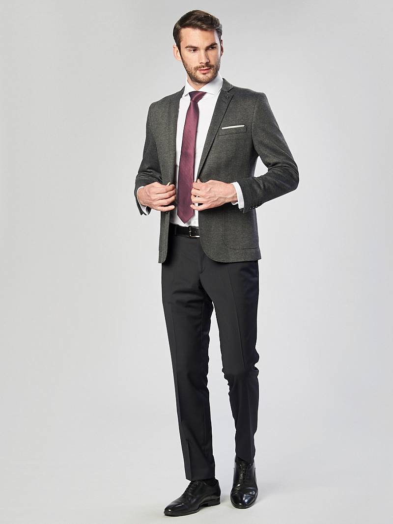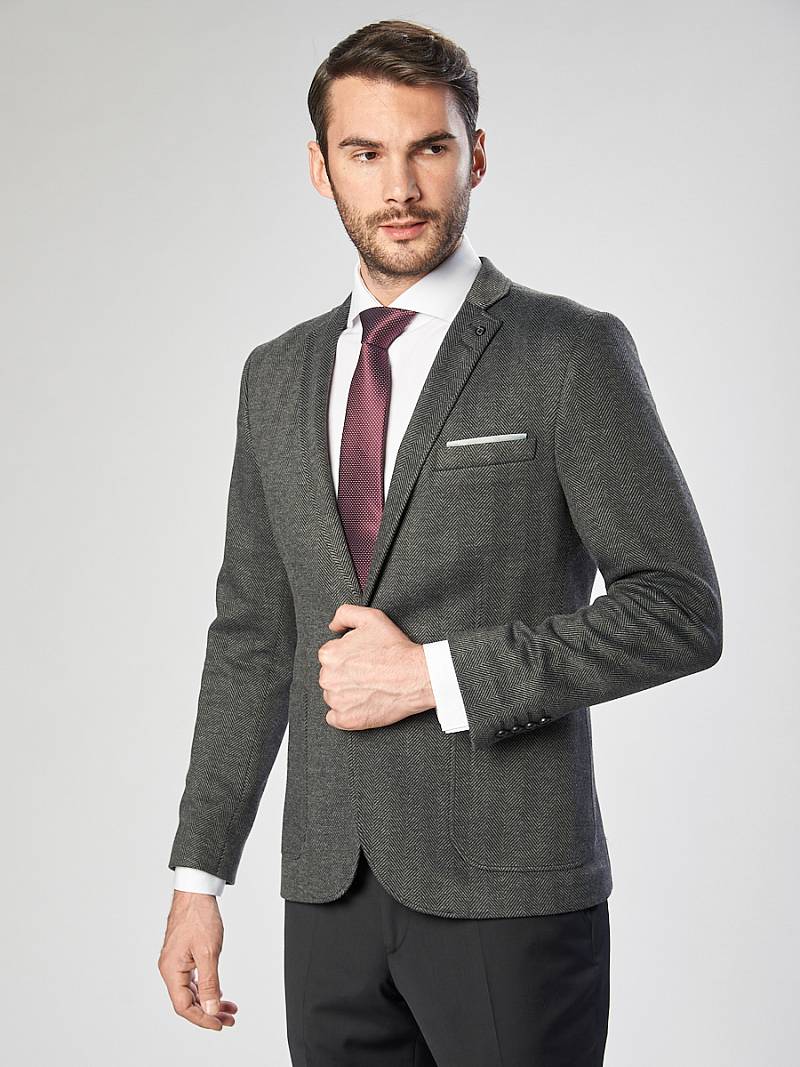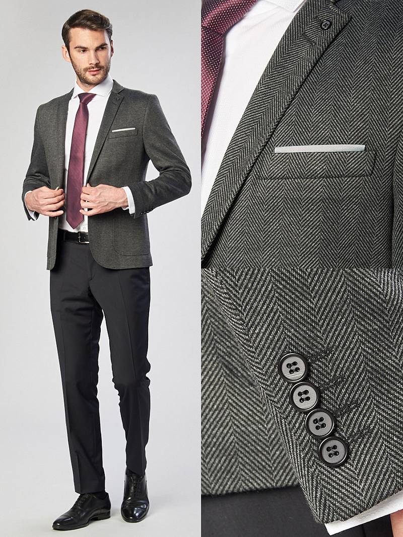 Slim fit, Классический мужской пиджак на две пуговицы, с боковыми карманами и одним нагрудным, по спинке одна шлица, без подкладки по спинке. Контрастные петли, декоративная пуговица на лацкане.