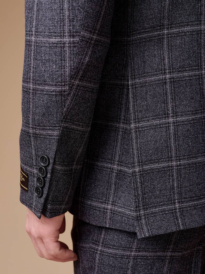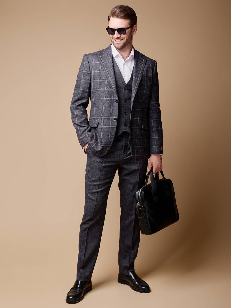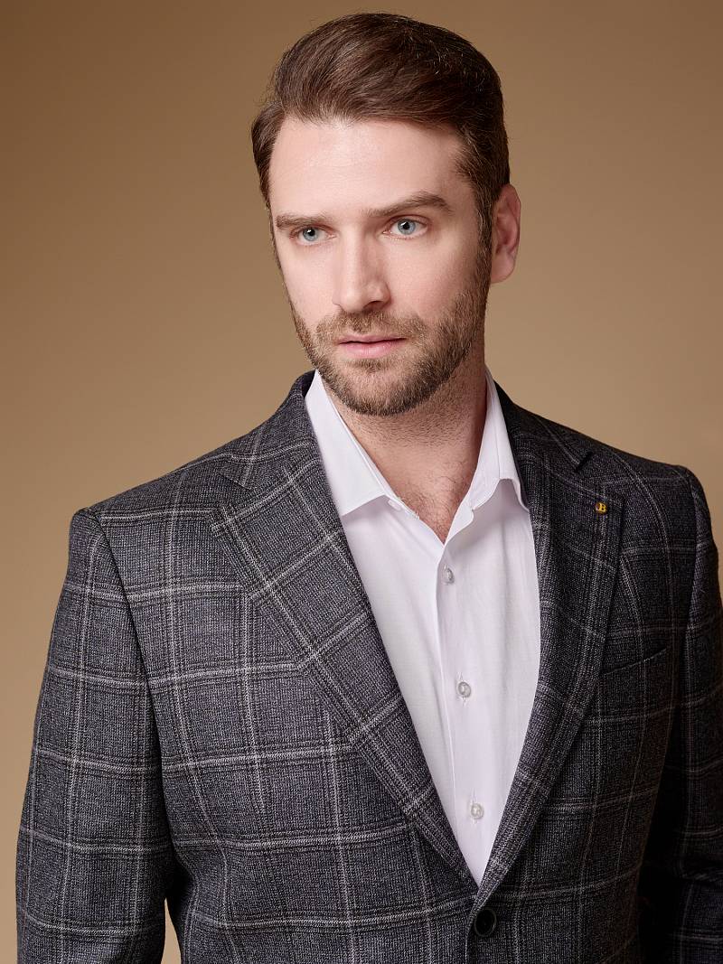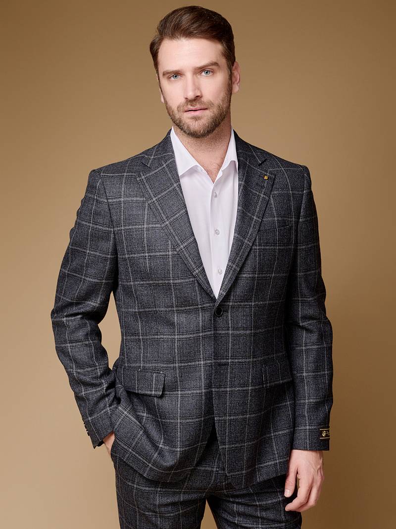Classic fit (ПОЛУПРИЛЕГАЮЩИЙ СИЛУЭТ), Пиджак однобортный на две пуговицы, с двумя боковыми карманами и нагрудной листочкой. Рукава втачные, двухшовные со шлицей и четырьмя декоративными пуговицами. По спинке расположены две шлицы. Пиджак на подкладке, с двумя внутренними карманами.