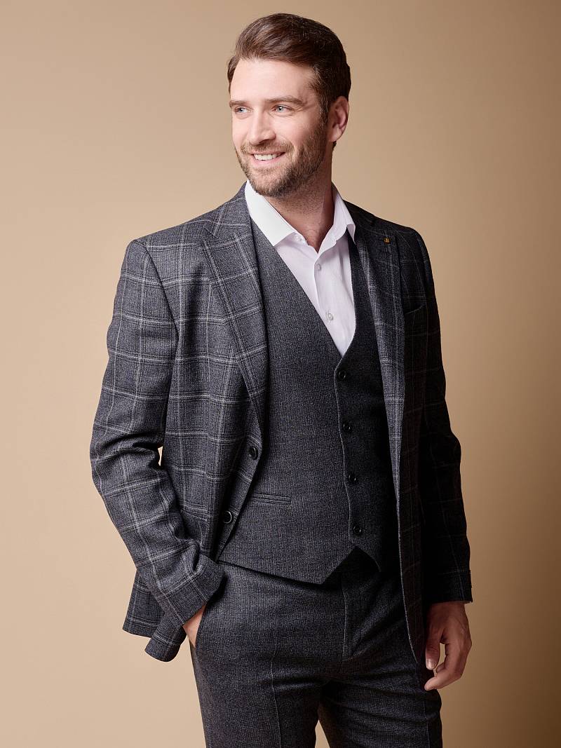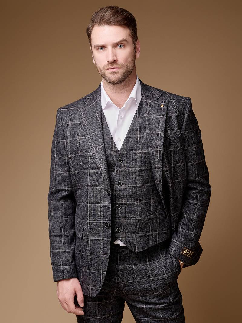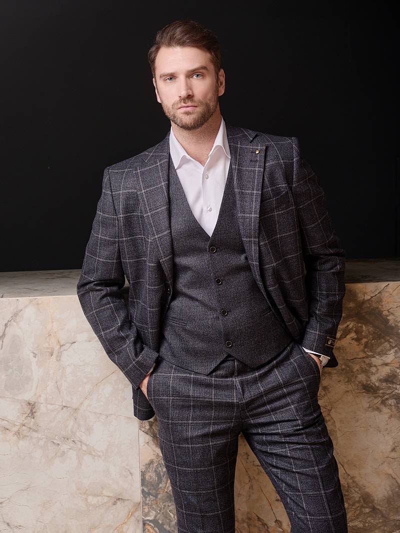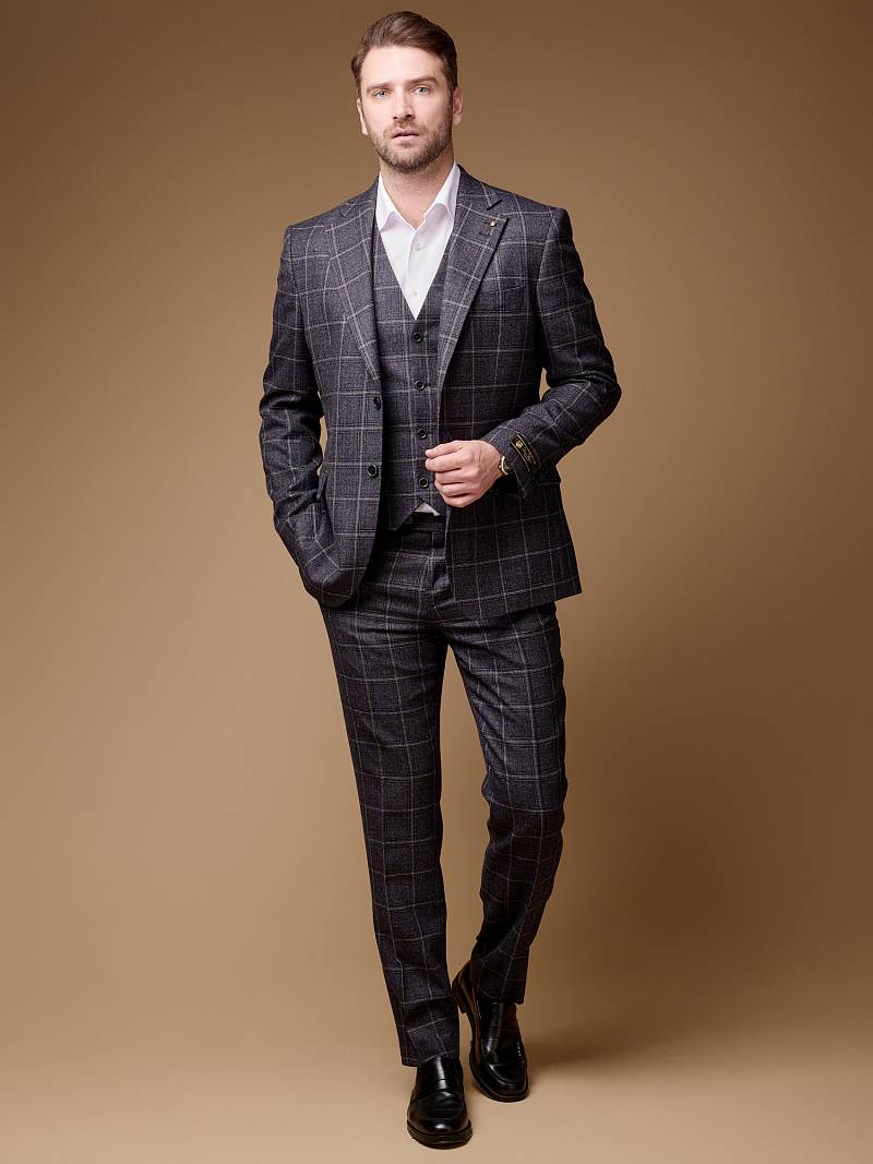 Classic fit (ПОЛУПРИЛЕГАЮЩИЙ СИЛУЭТ), Пиджак однобортный на две пуговицы, с двумя боковыми карманами и нагрудной листочкой. Рукава втачные, двухшовные со шлицей и четырьмя декоративными пуговицами. По спинке расположены две шлицы. Пиджак на подкладке, с двумя внутренними карманами.