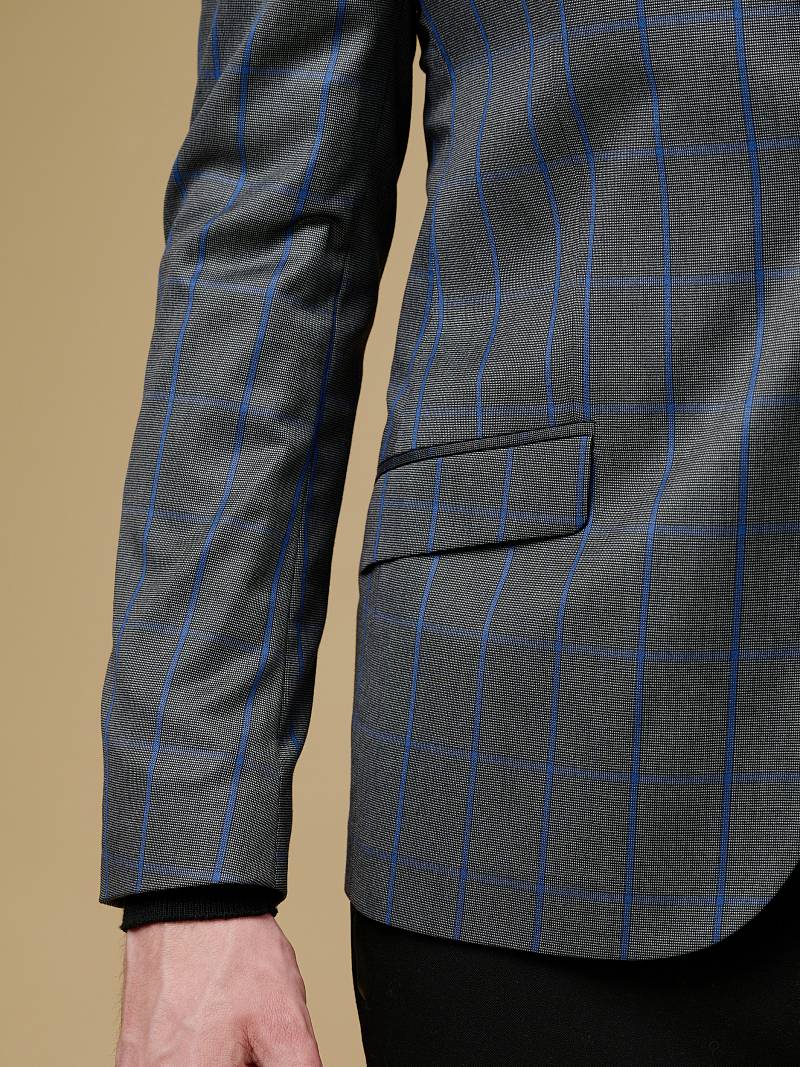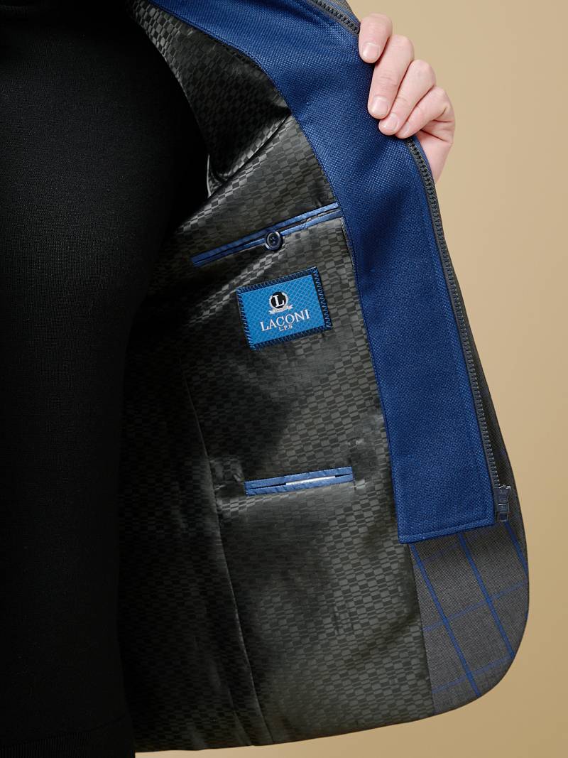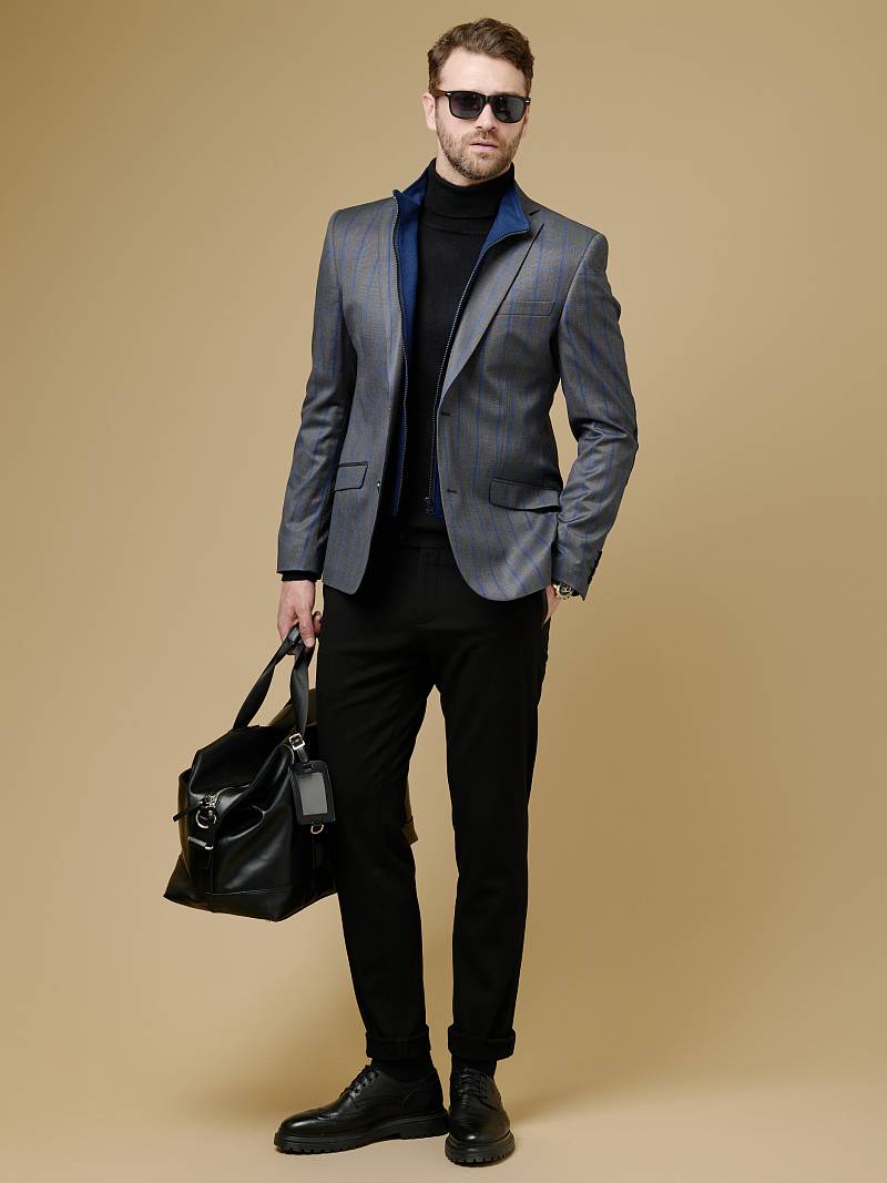 Slim fit, Однобортный пиджак на две пуговицы со съемной манишкой на молнии, по спинке одна шлица. Манишка и налокотники выполнены из отделочной ткани.