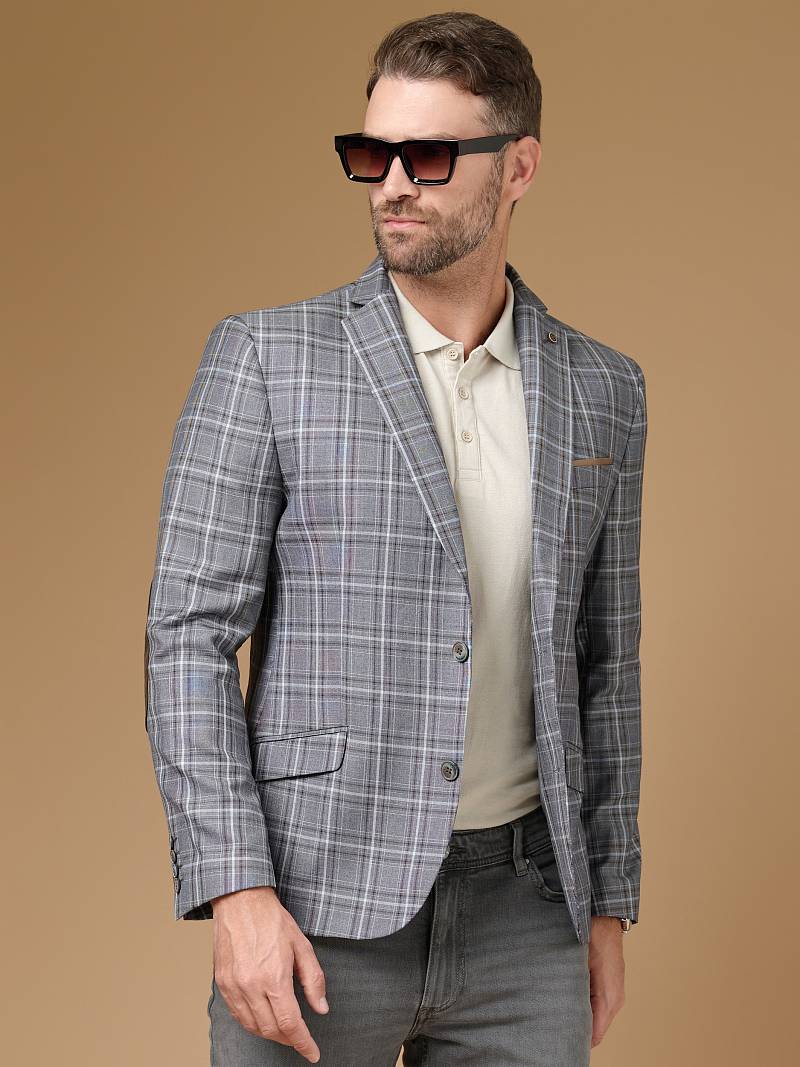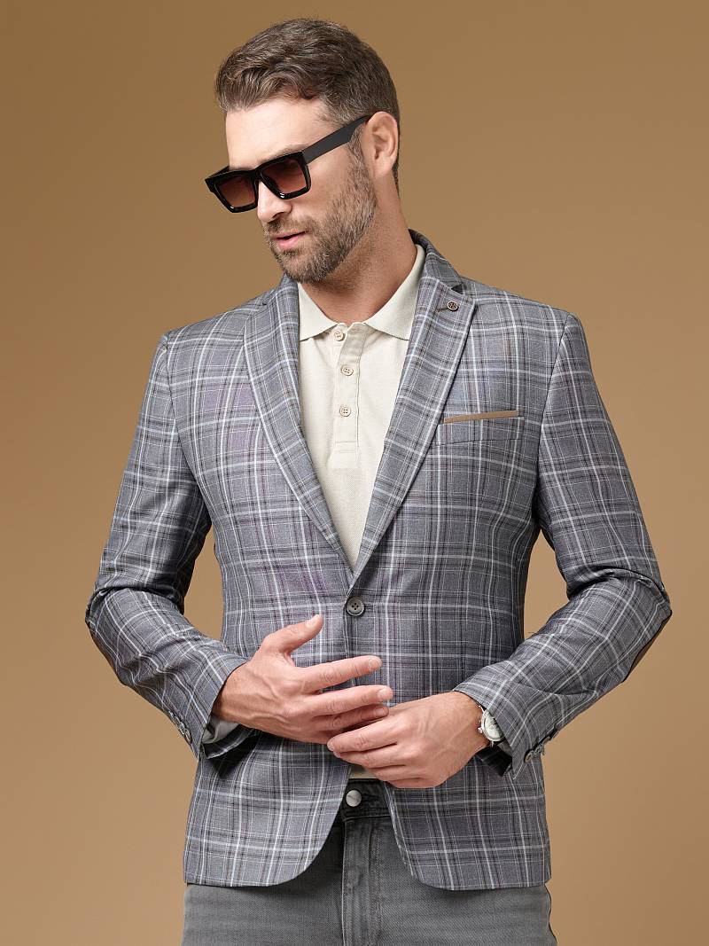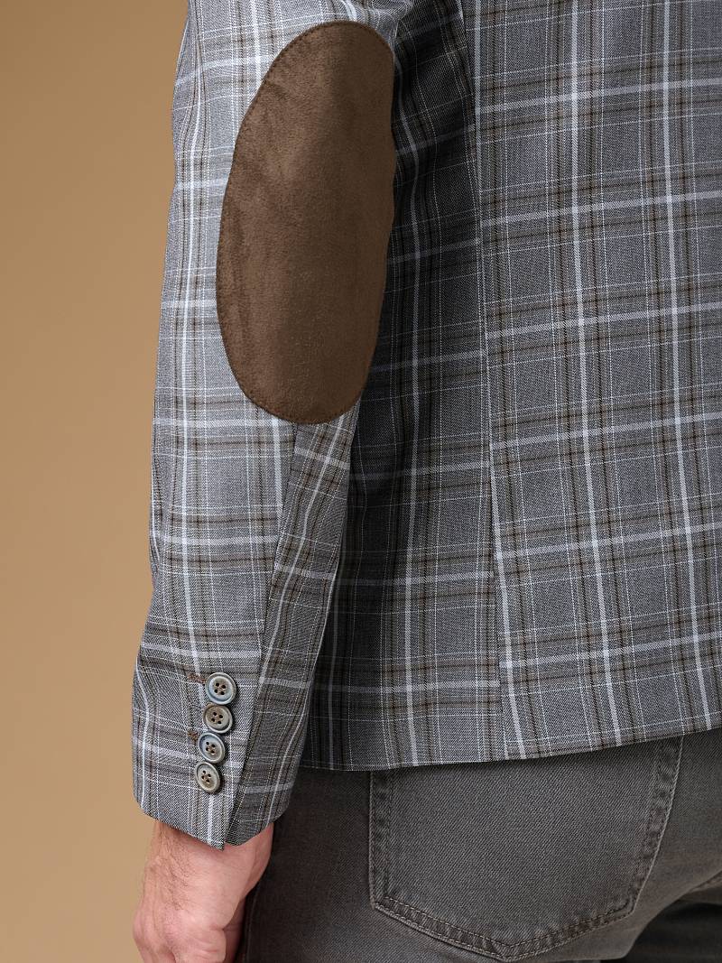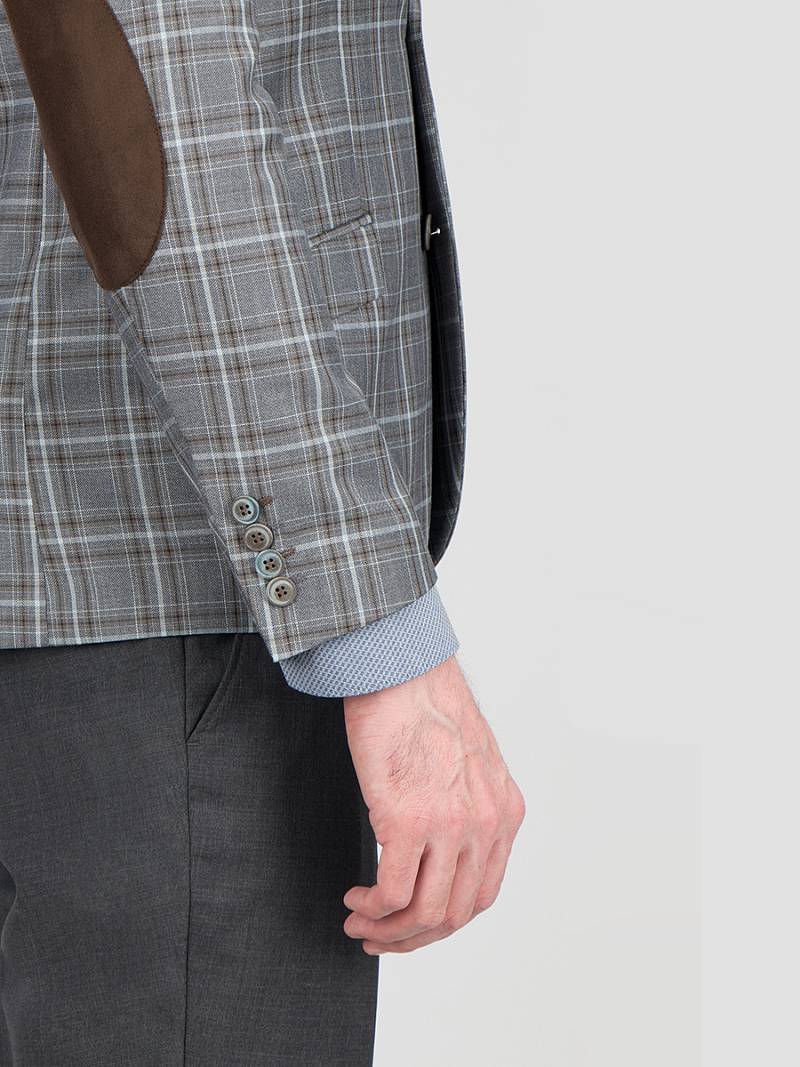 Slim fit, Классический пиджак на две пуговицы, одна шлица, рукава с налокотниками из отделочной ткани. Контрастные петли, декоративная пуговица на лацкане, нагрудный платок.